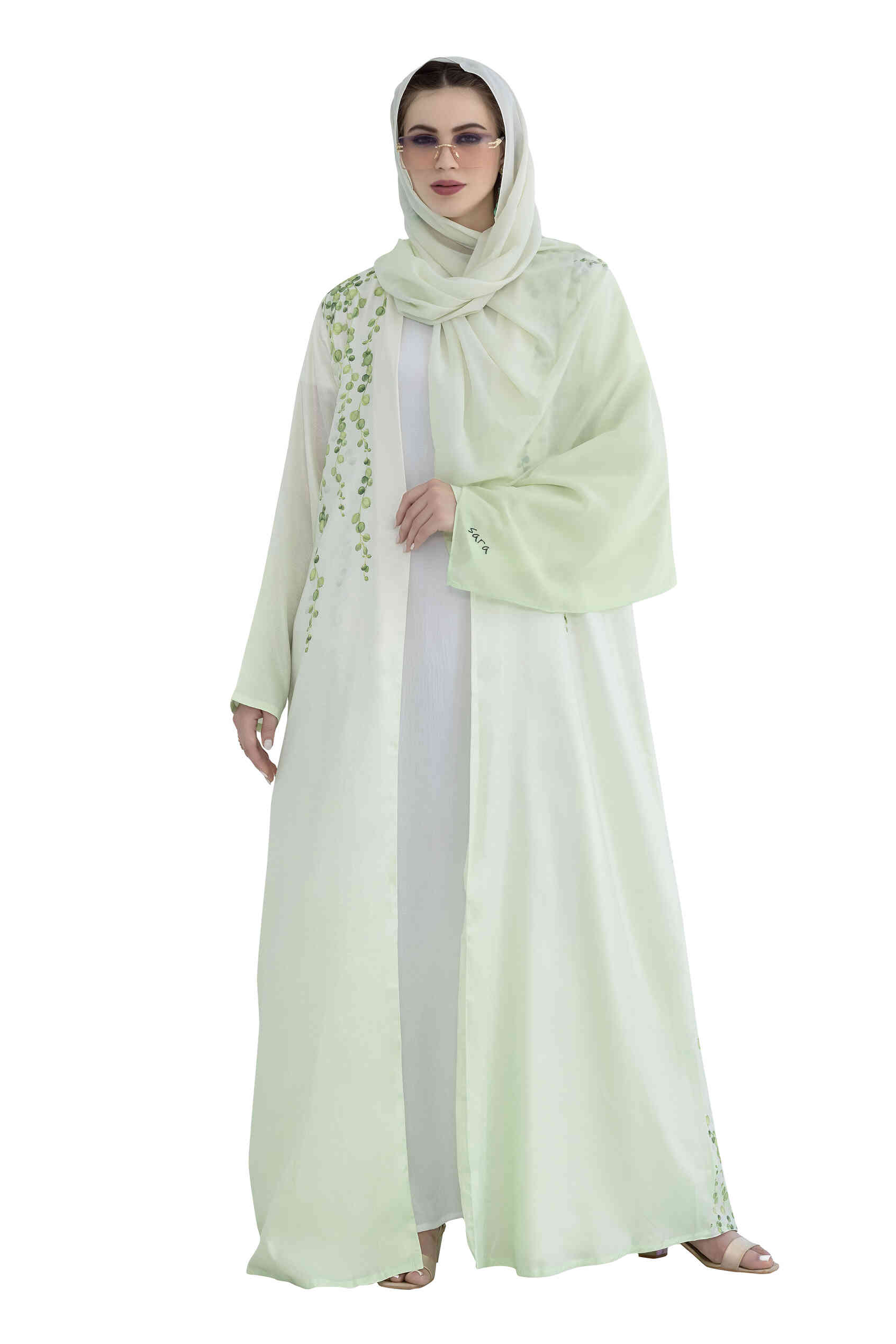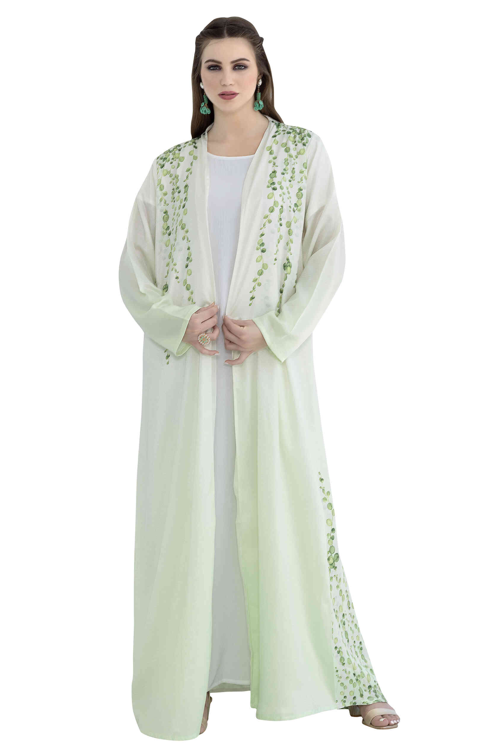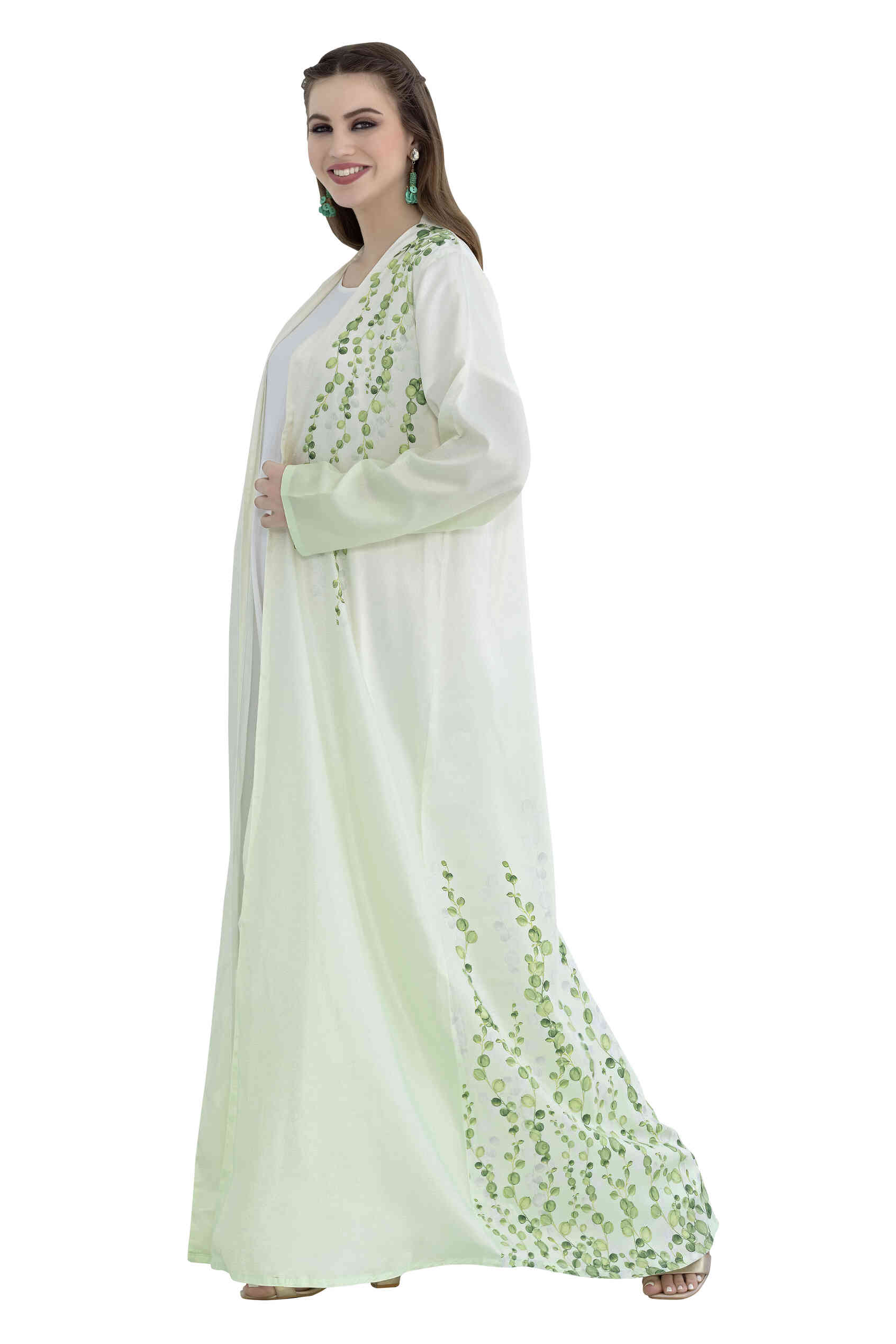 A breathtaking abaya intricately adorned with selectively printed vibrant feathers, adding an extra layer of elegance.