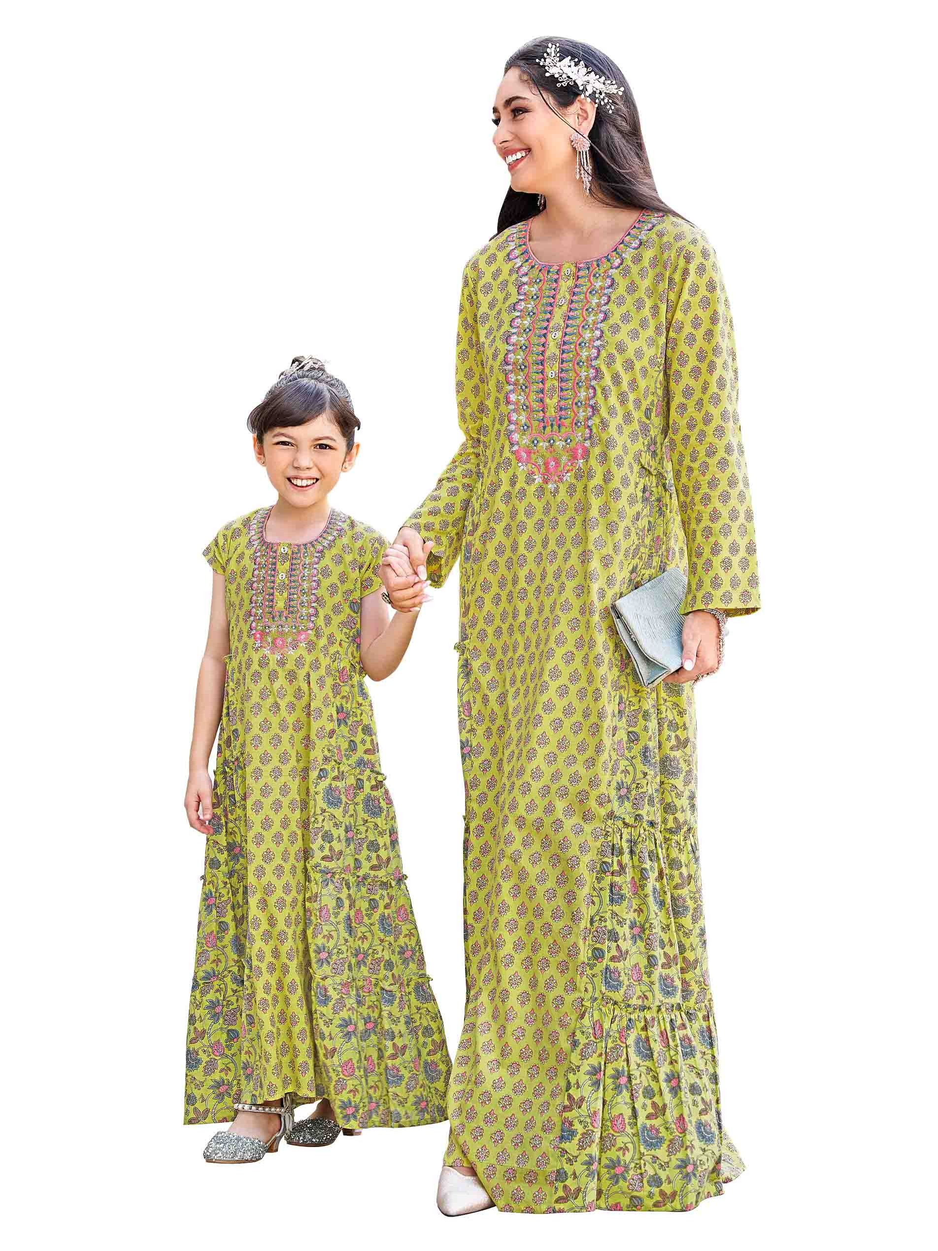 A yellow half-sleeve floral cotton jalabiya, designed with distinctive embroidery on the chest and front buttons.