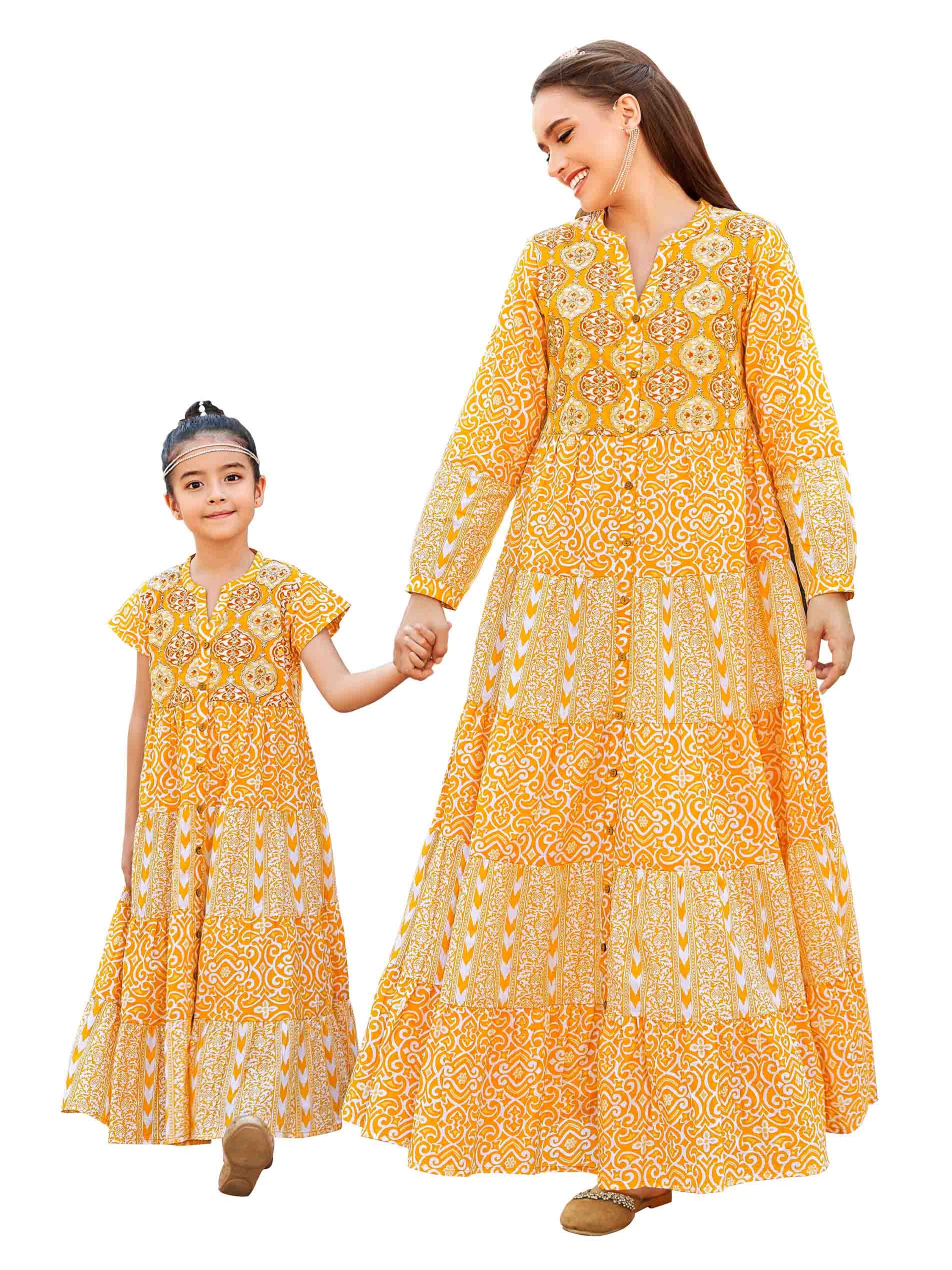 A mother and daughter look in a modern A-line orange jalabiya, designed with white pattern for a cheerful look on special occassions.