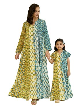 A mother and daughter look in a half-sleeve blue jalabiya, designed with distinctive white patterns, complemented by front buttons for an catchy look on special occassions.