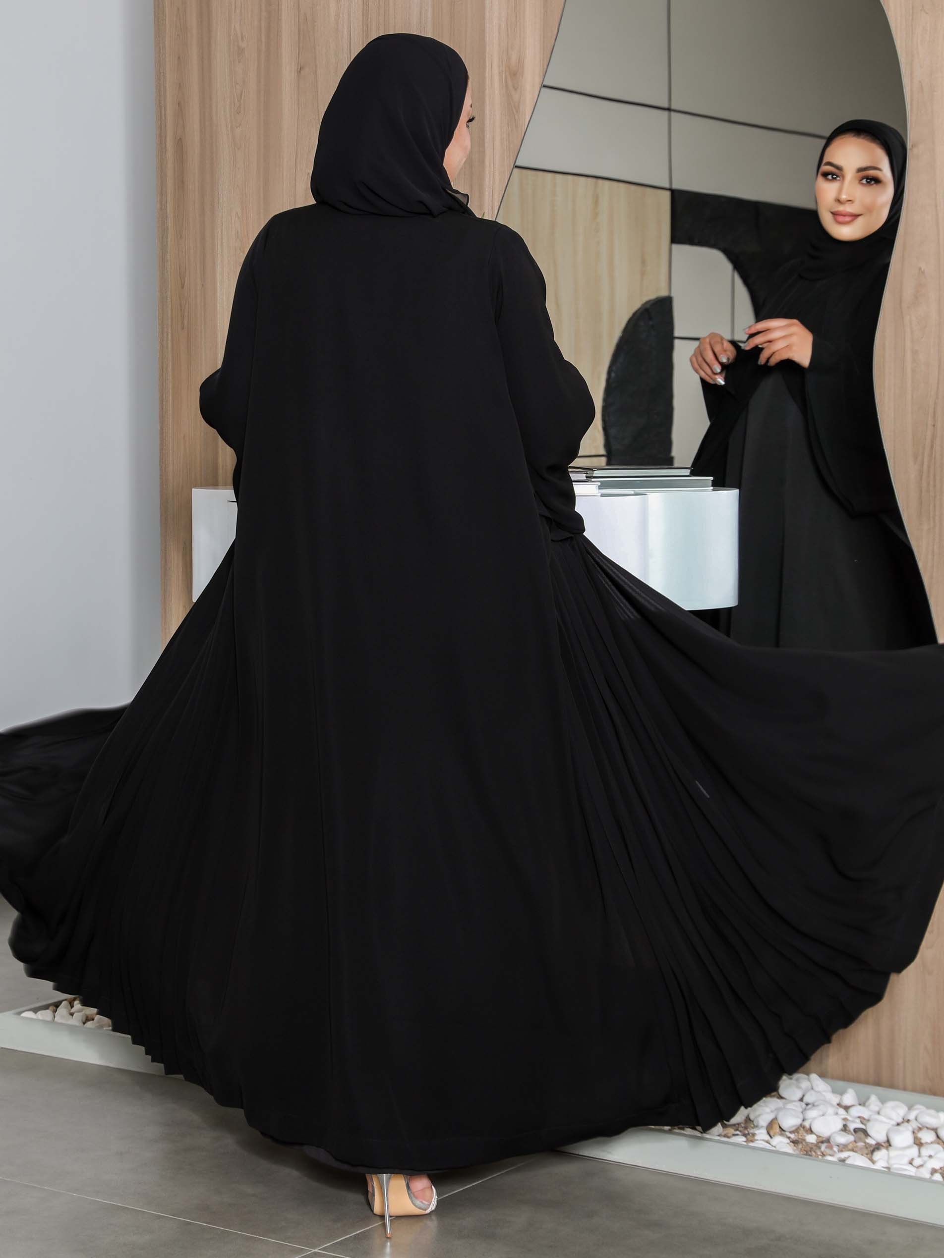 A luxurious black A-line abaya with long sleeves and a closed neck for a unique look in Ramadan.