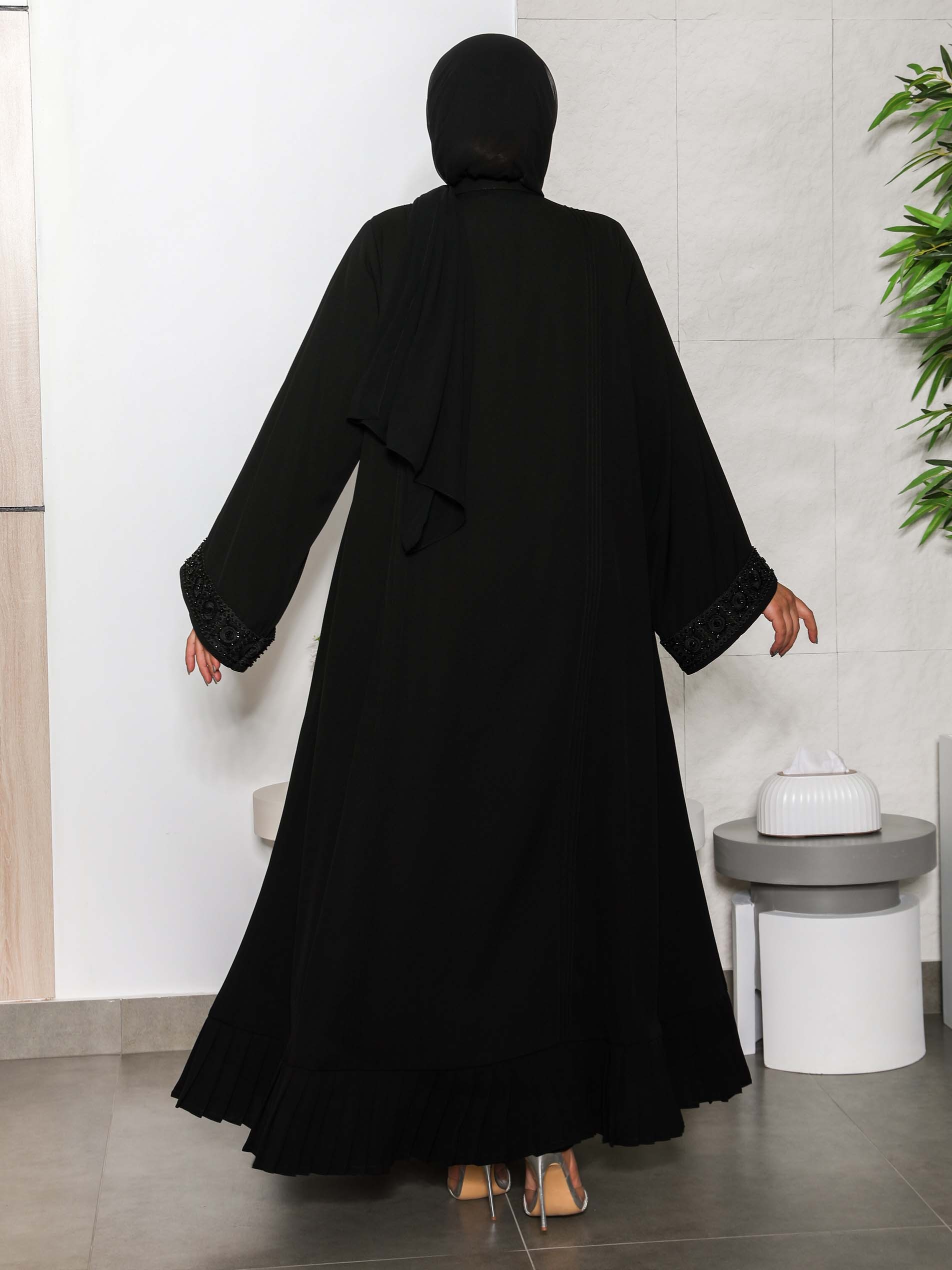 Wrap yourself up in style with our long sleeve plain black abaya, designed with elegant embroidery that extends along the length of the abaya with a matching cuffs .