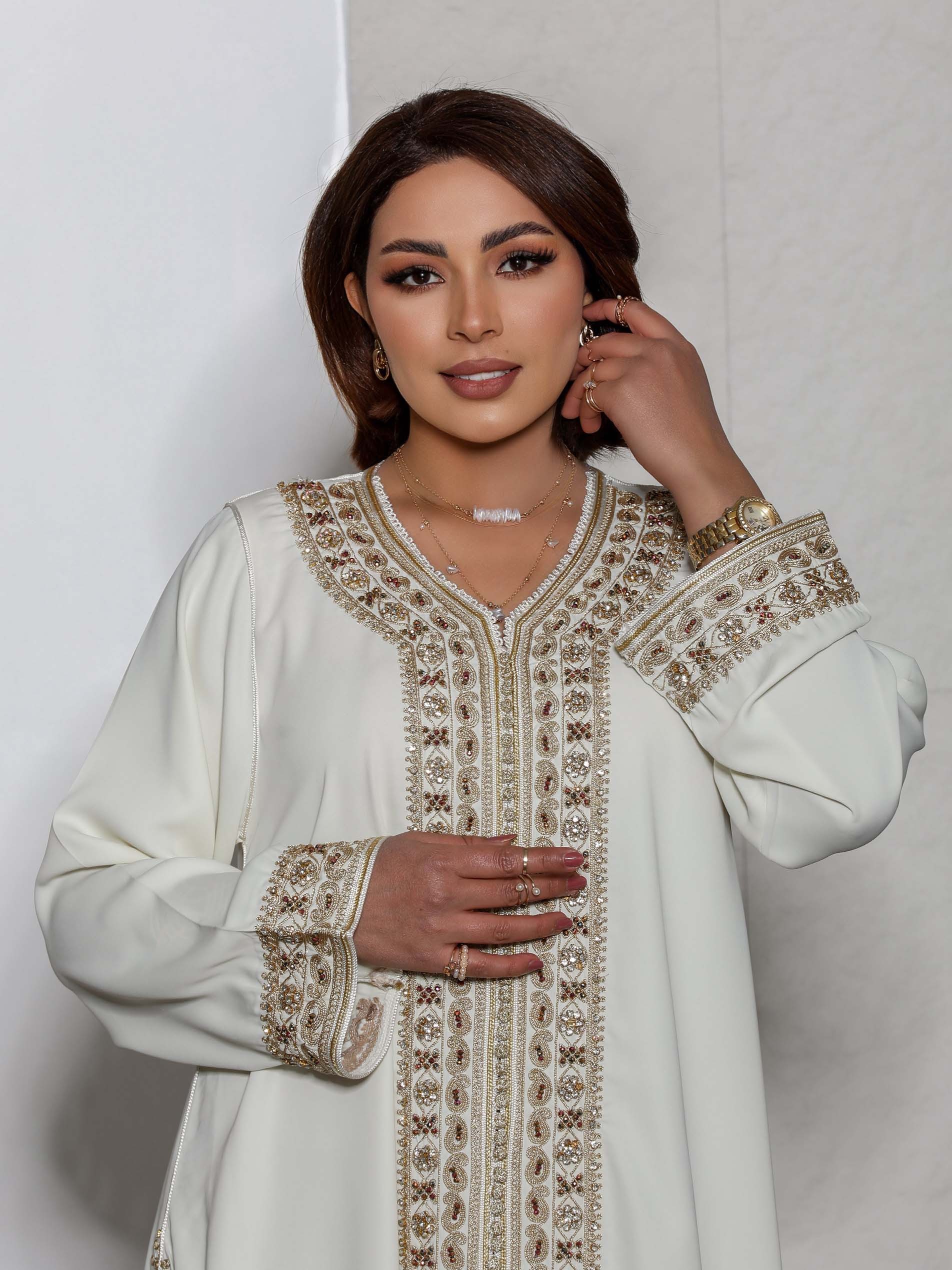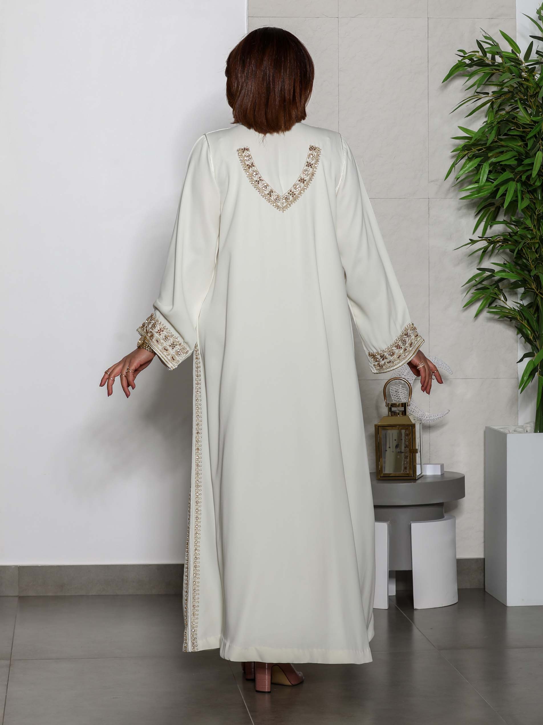 White long sleeve satin jalabiya, embroidered with colorful shiny cloves with a matching cuffs for a fascinating ramadan look.