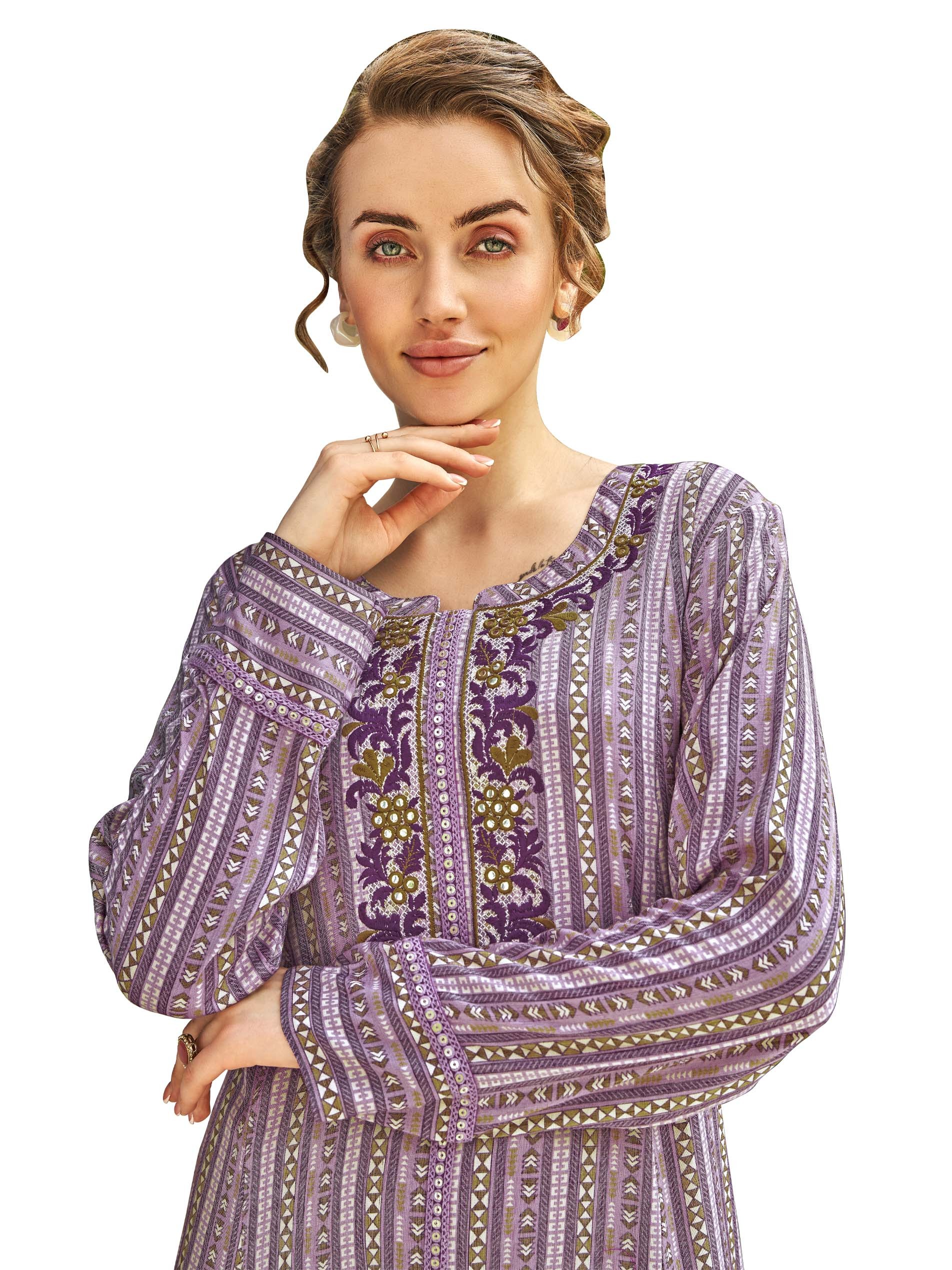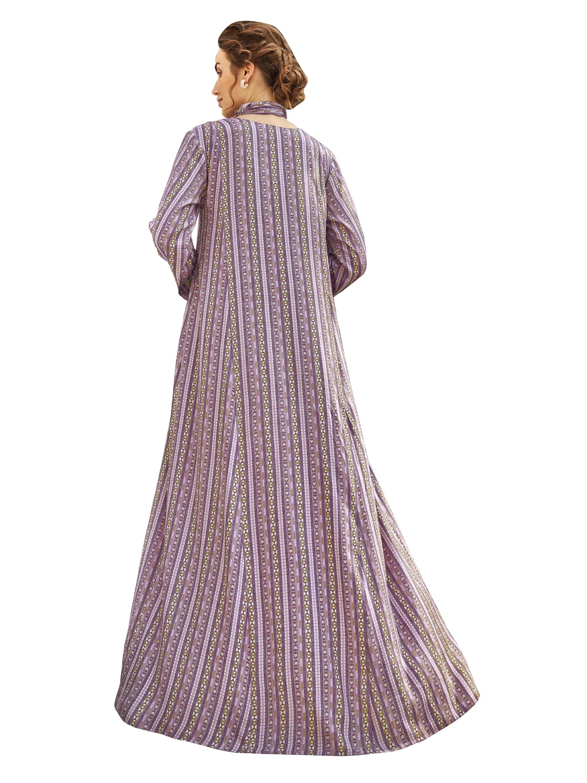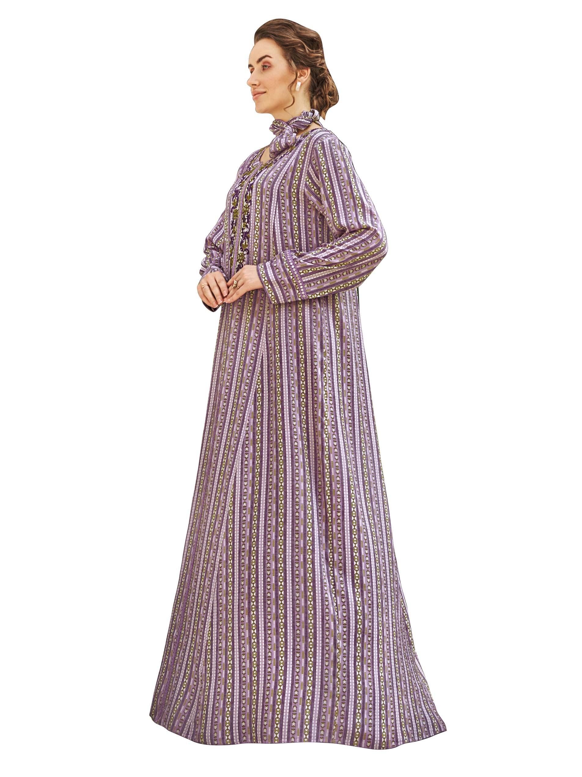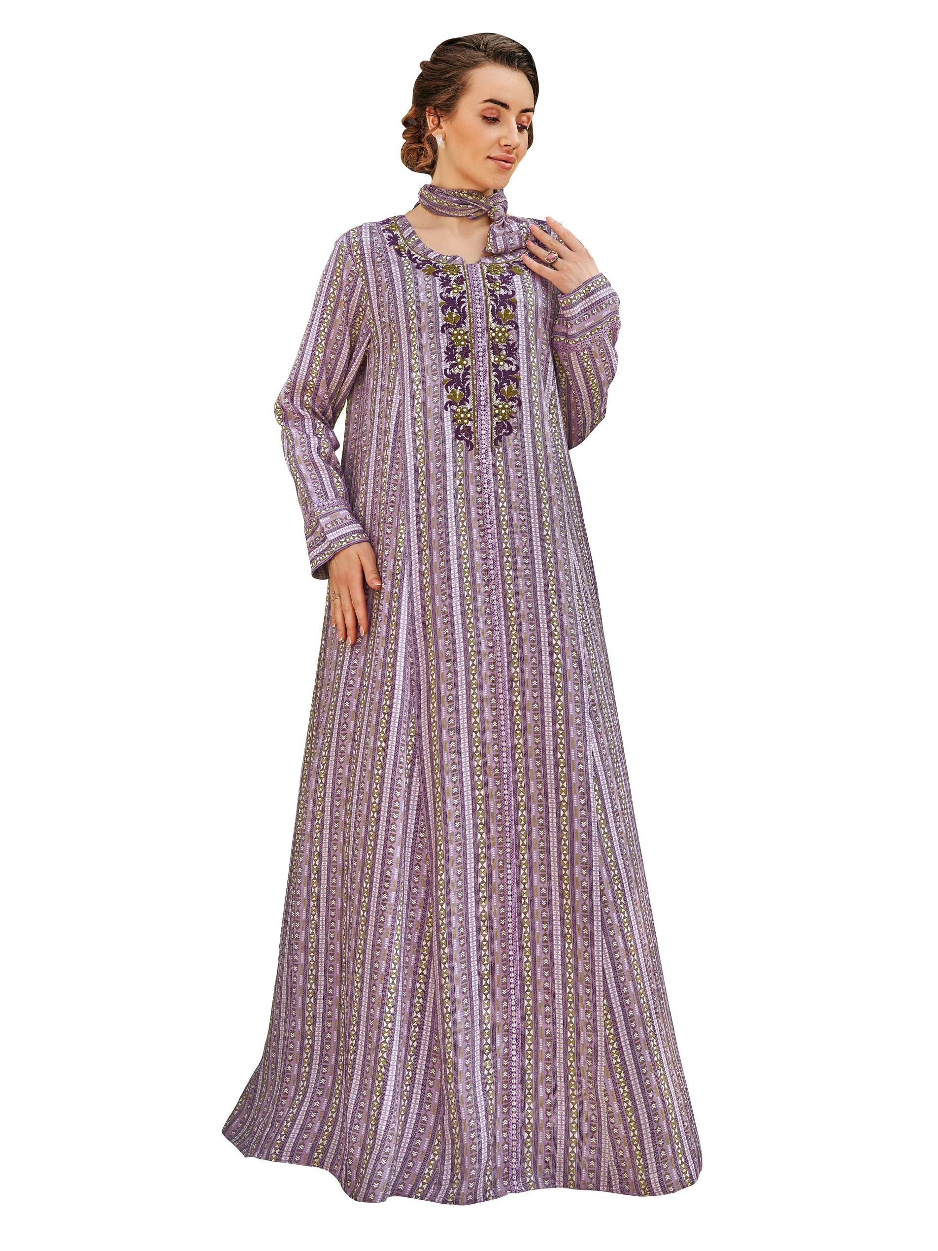 Purple striped jalabiya designed with a distinctive white print, long sleeves and floral embroidery on the chest