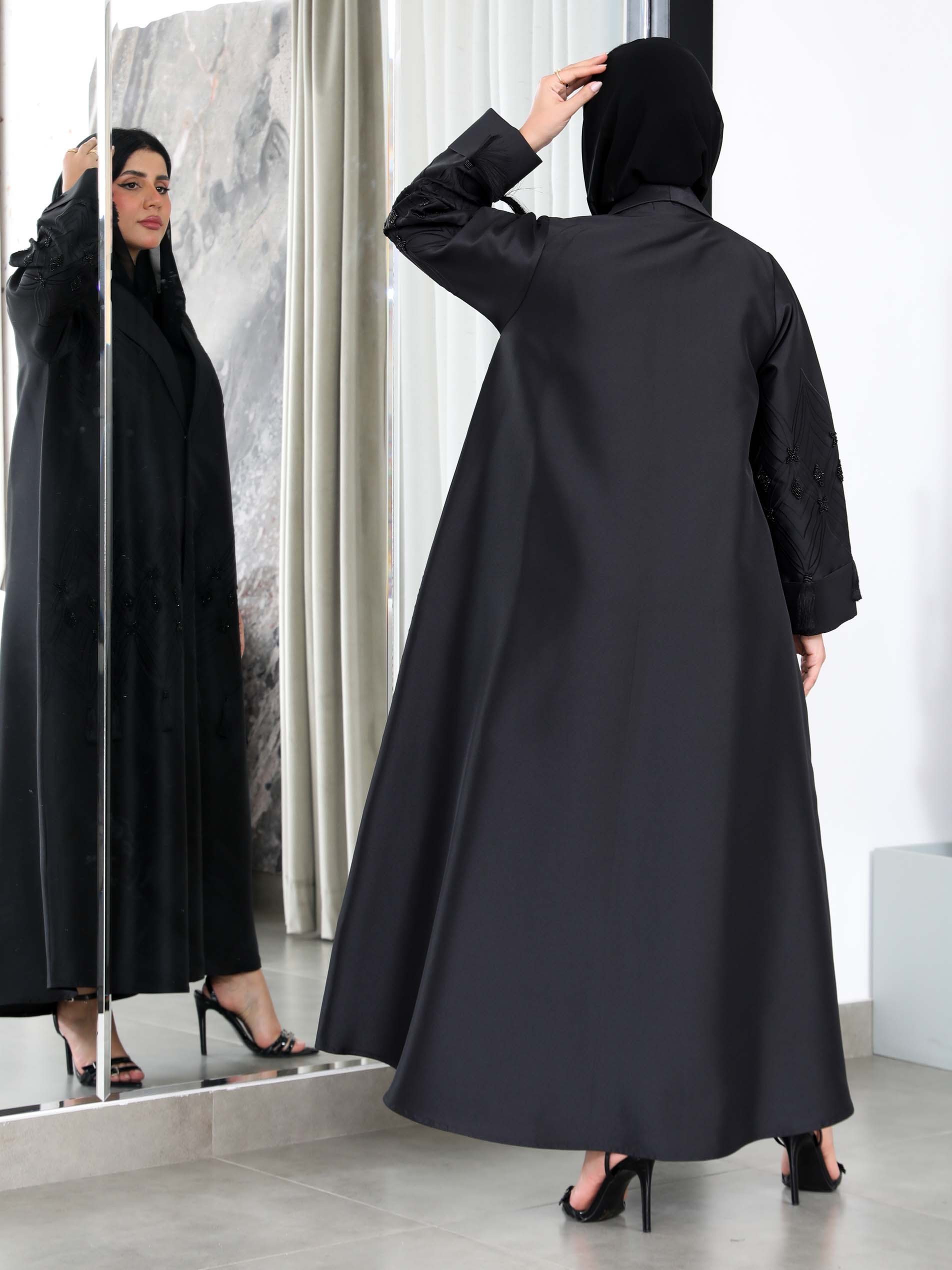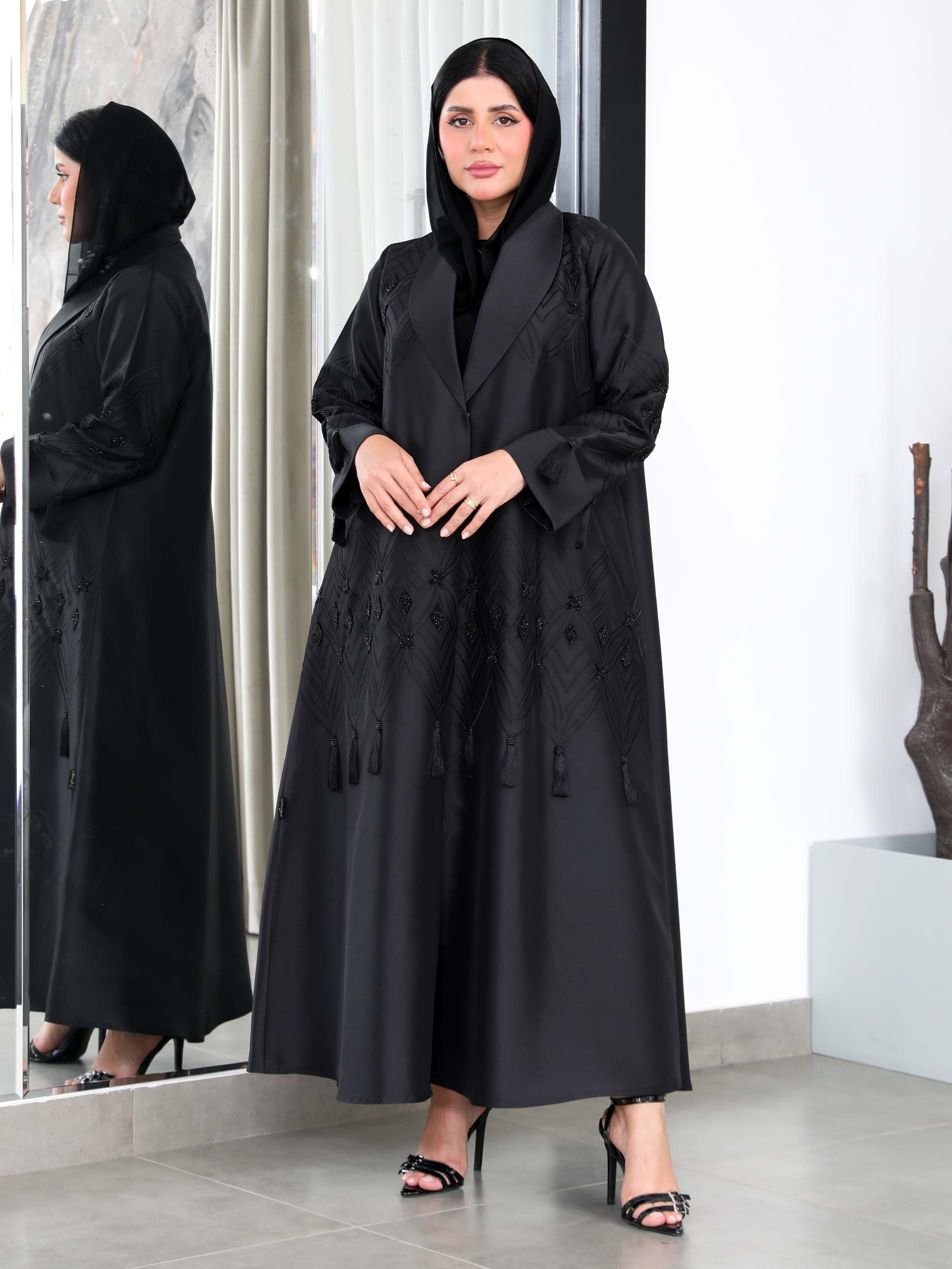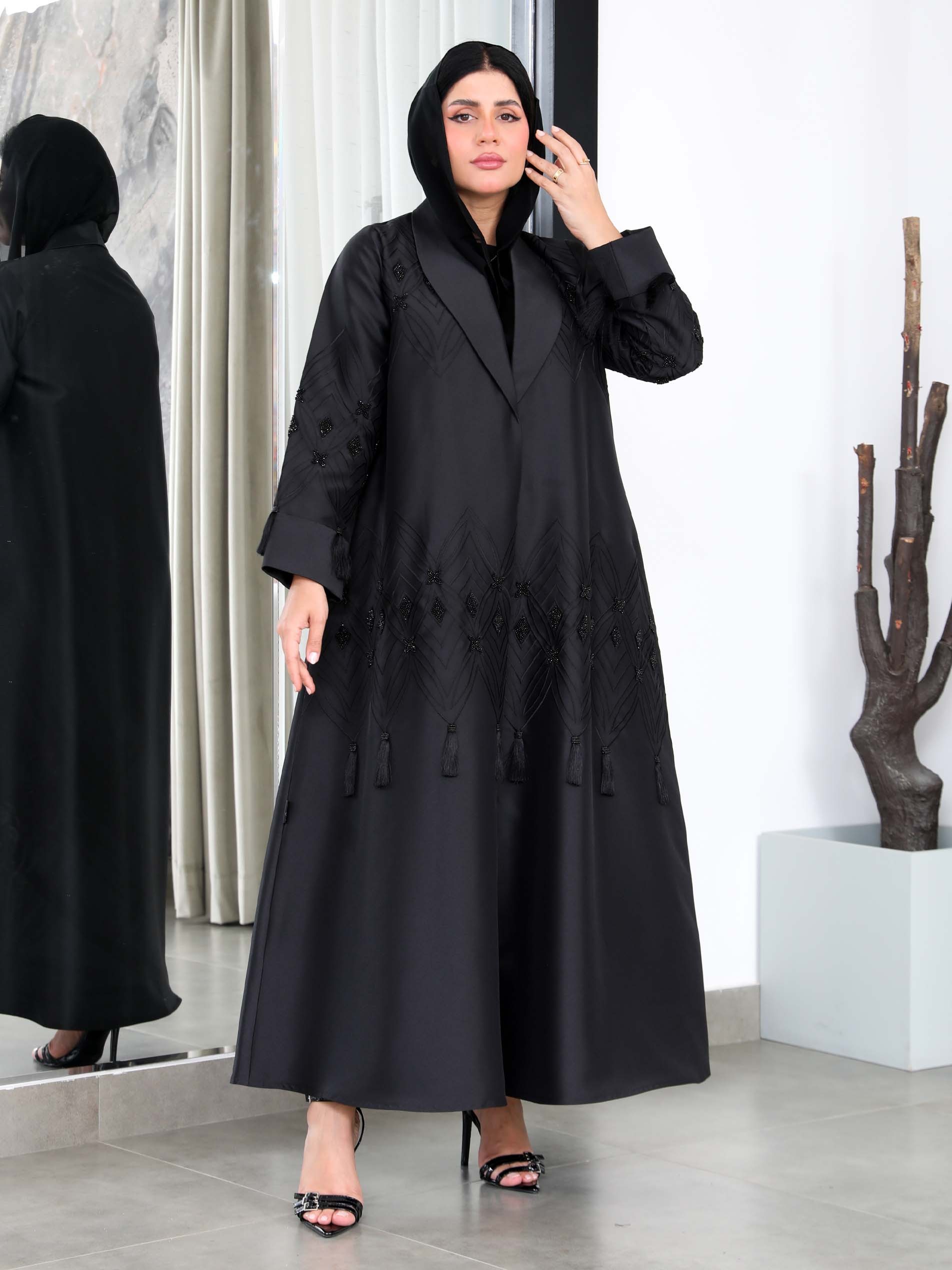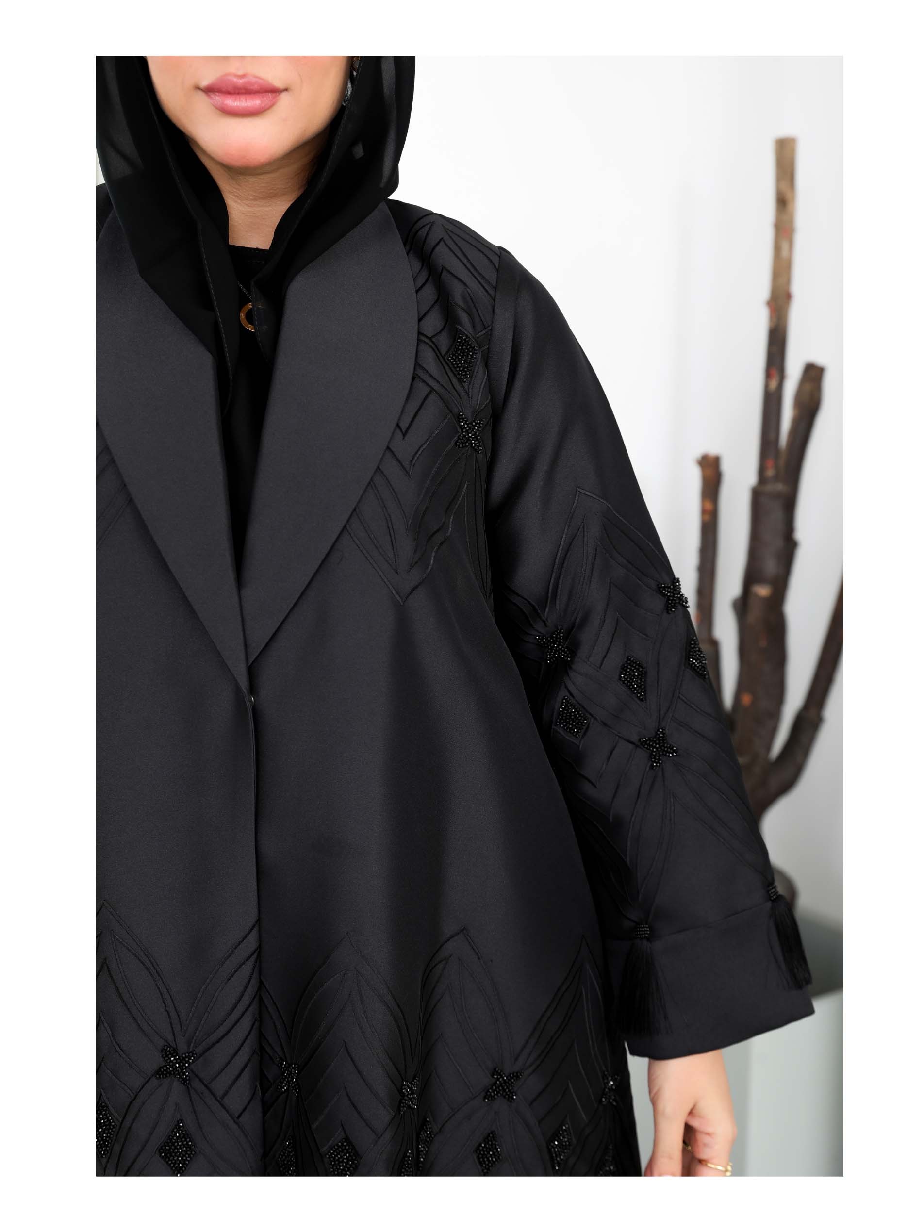 This A-line cut abaya is made from satin fabric and is ideal for summer events. It features multiple work in beadwork and tassels, creating a textured and artistic look. The jacket-style cut with the black base allows the multiple work to stand out. The subtle play of glossy satin and matte beads adds visual interest, creating a contrast perfect for evening events or special celebrations.