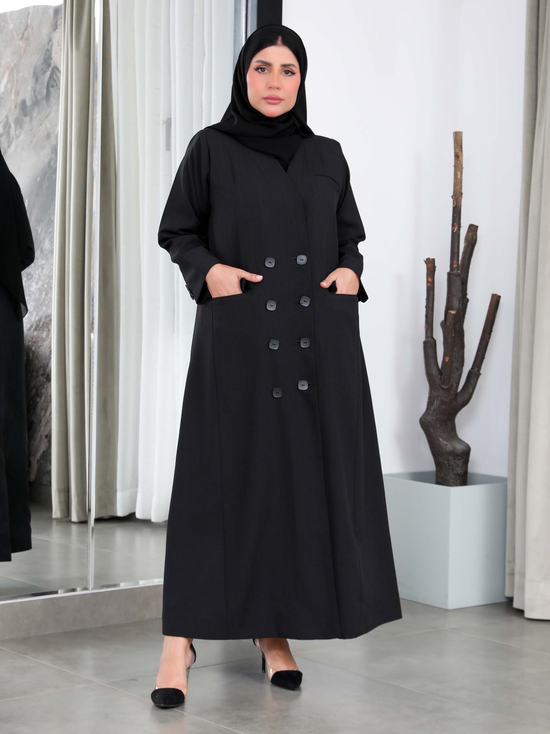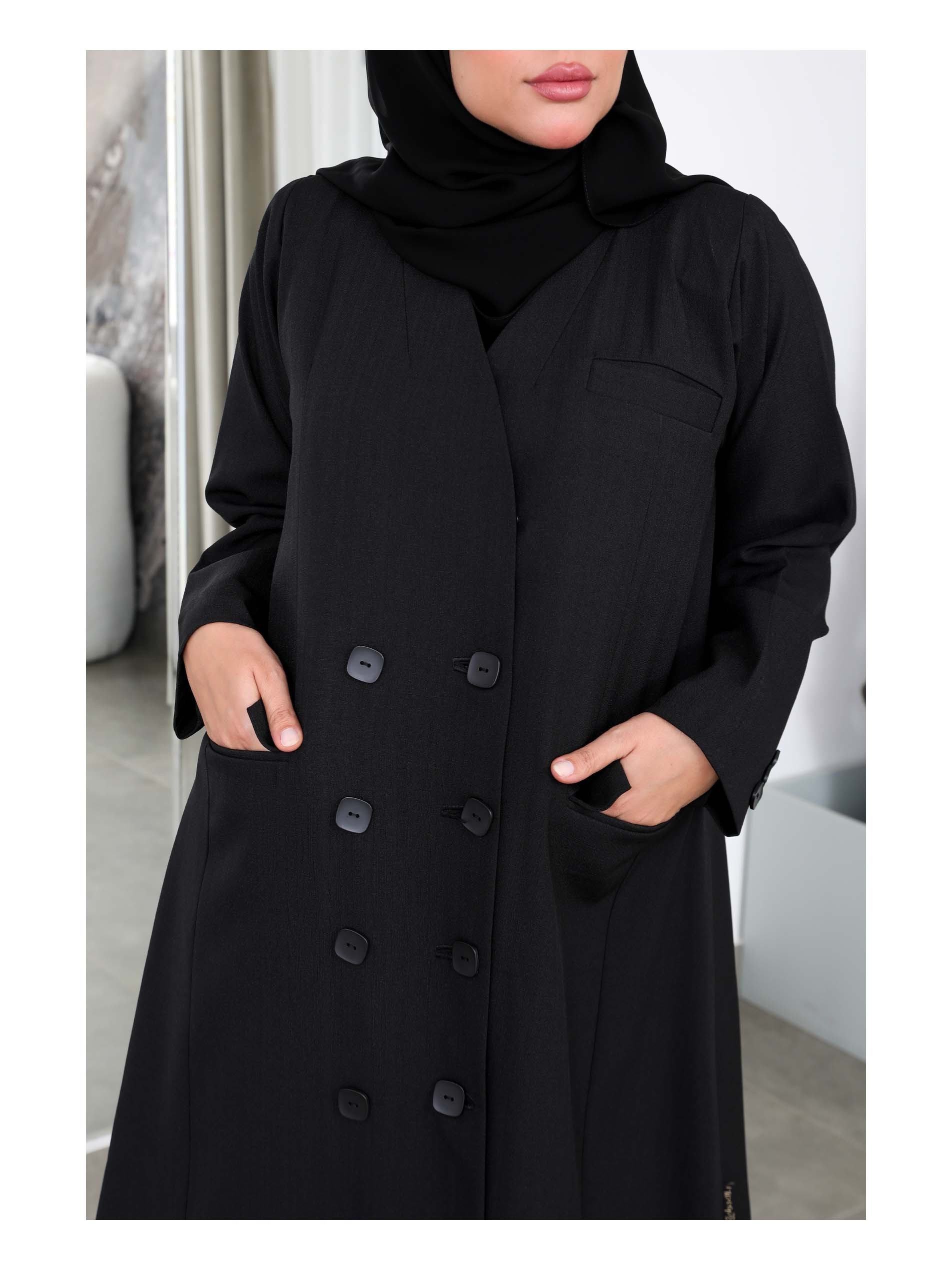 Stand out in our long sleeve black linen jacket style abaya, designed with elegant front buttons to complement your winter look.