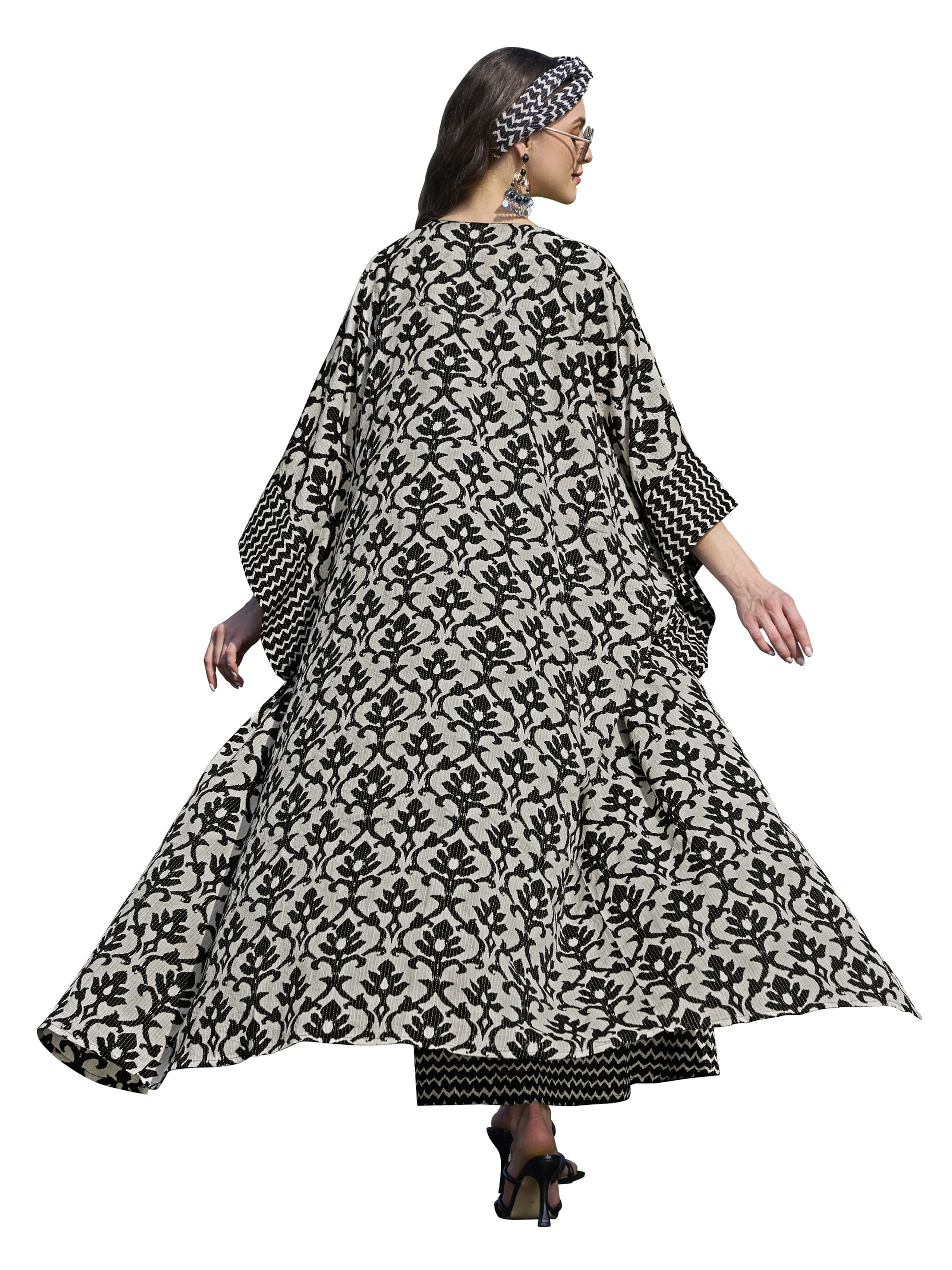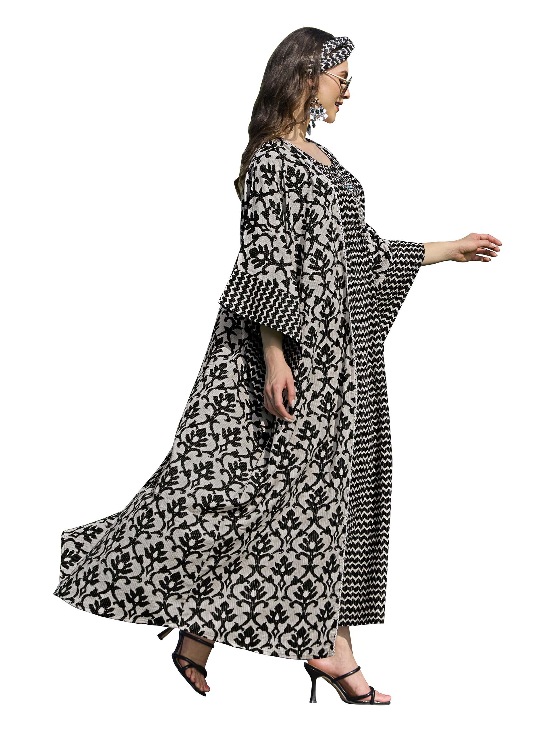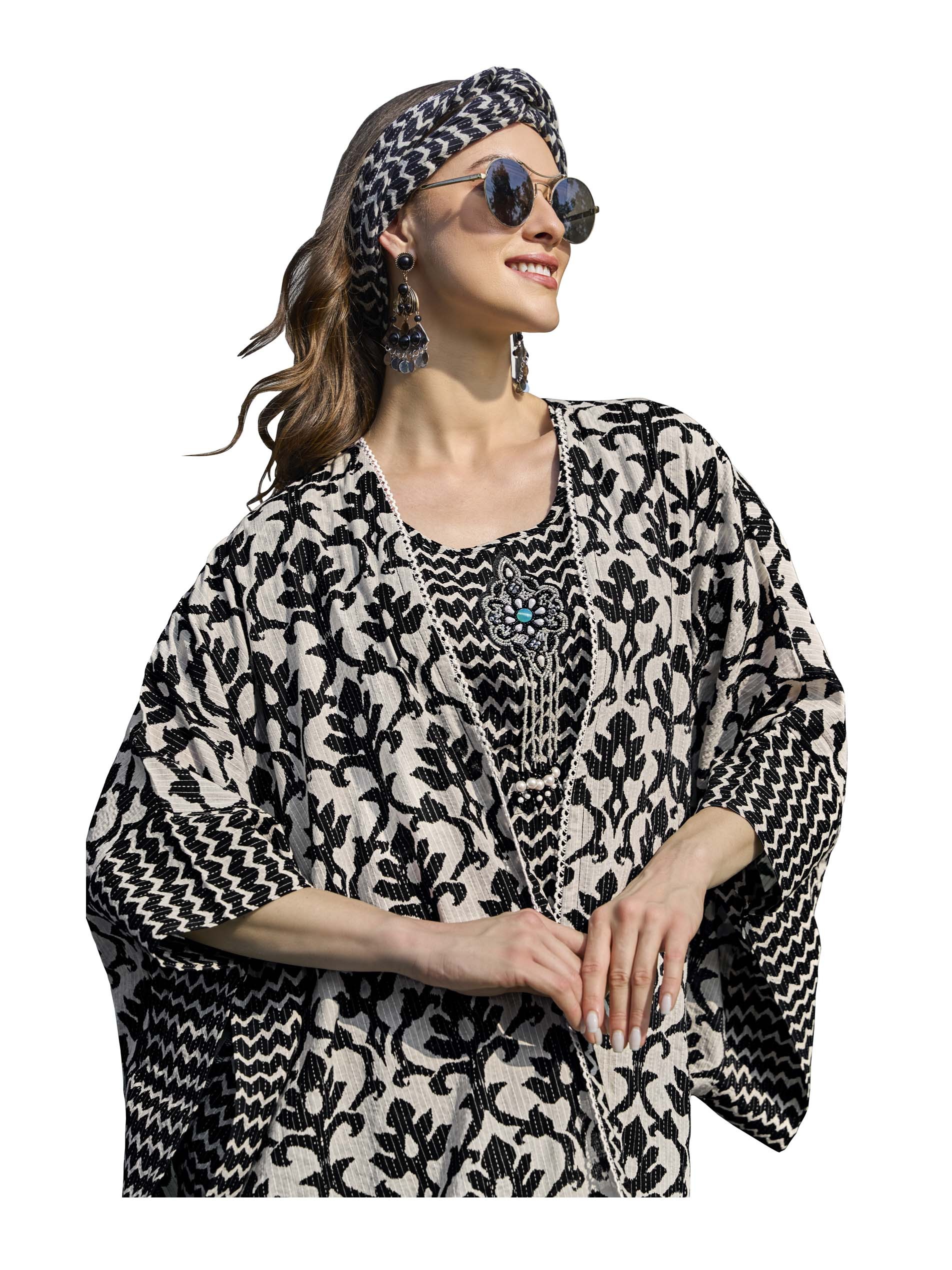 This stylish two-layer jacket-style jalabiya, crafted from breathable cotton, is perfect for casual summer wear. The black and white color palette is enhanced by intricate printed patterns on each layer, creating a unique and authentic look. The design is further elevated with a handwork patch, adding a touch of craftsmanship to the overall appeal.