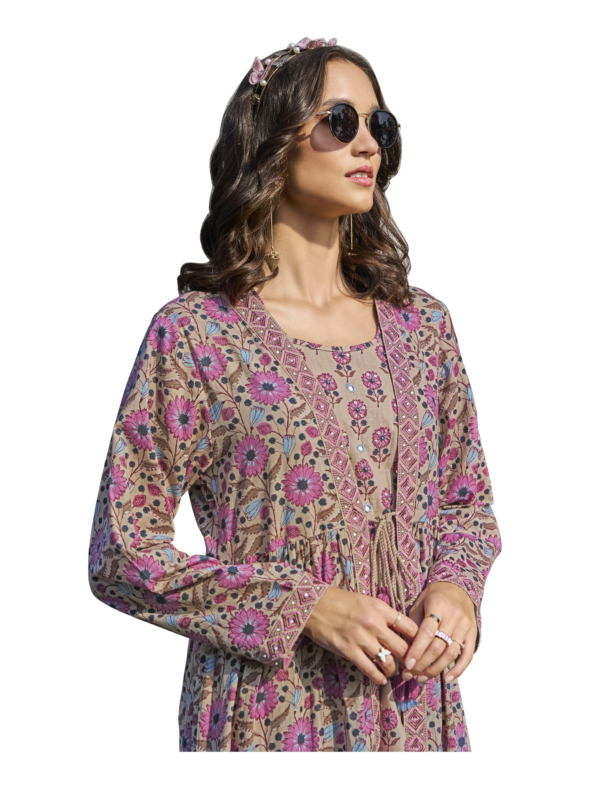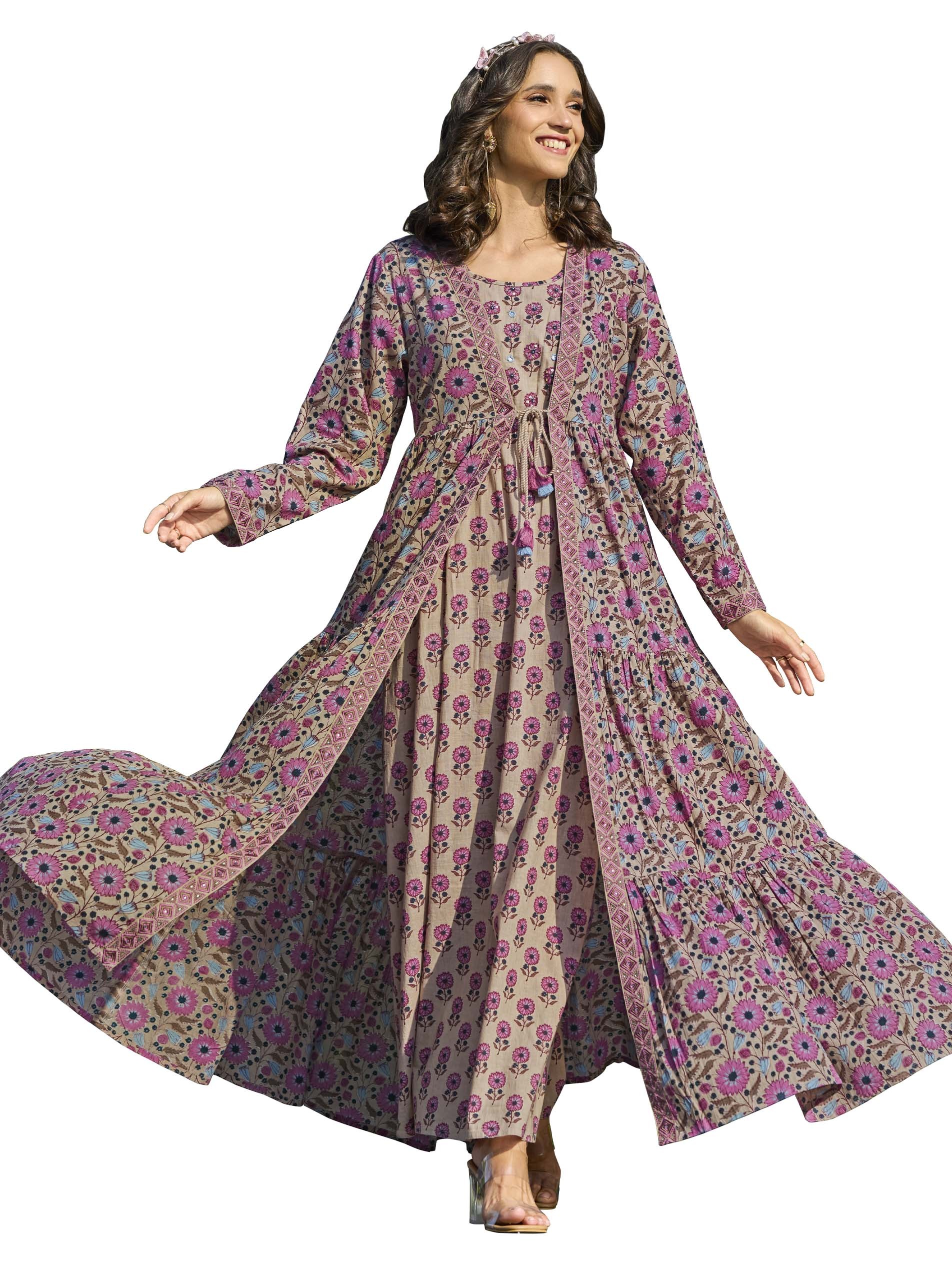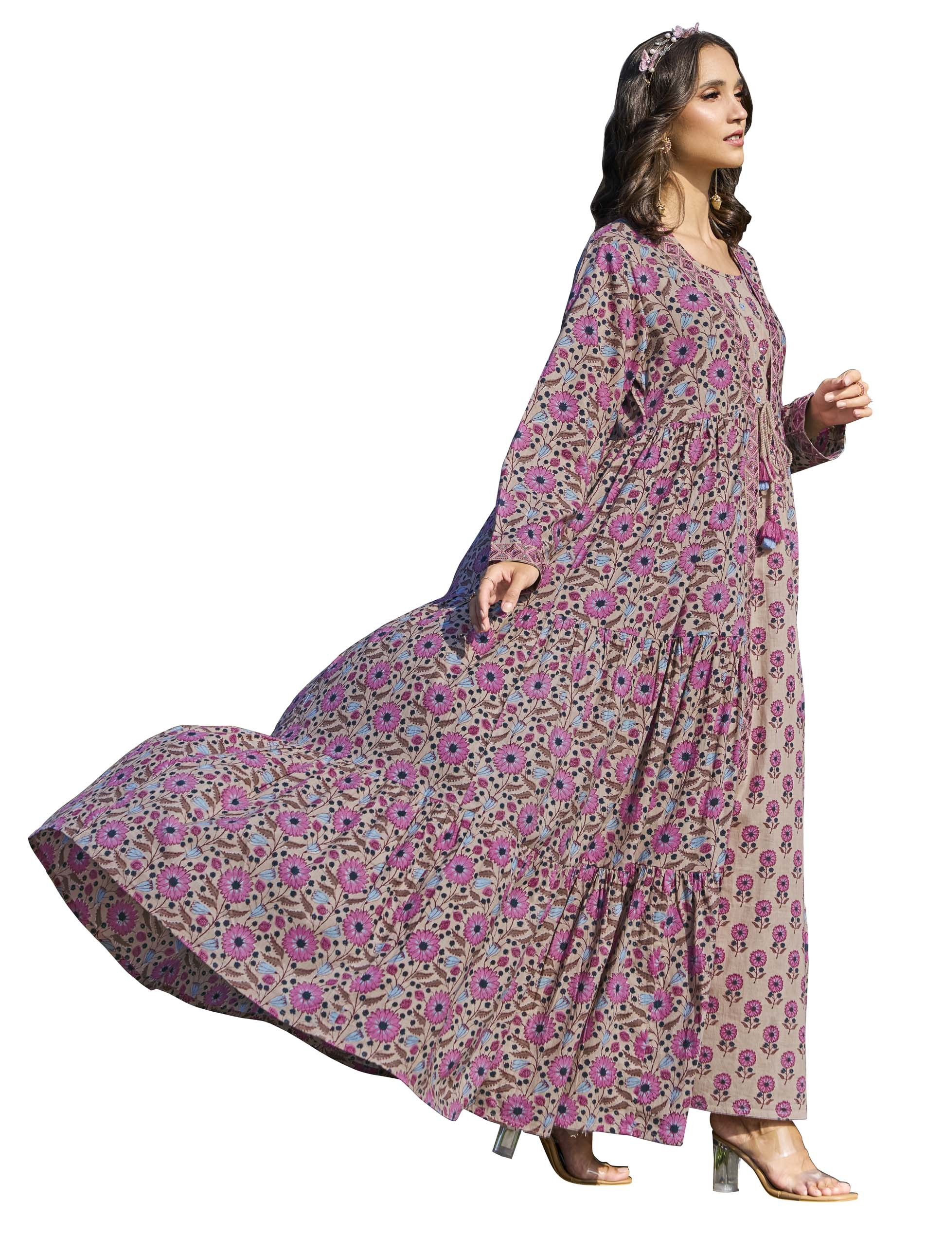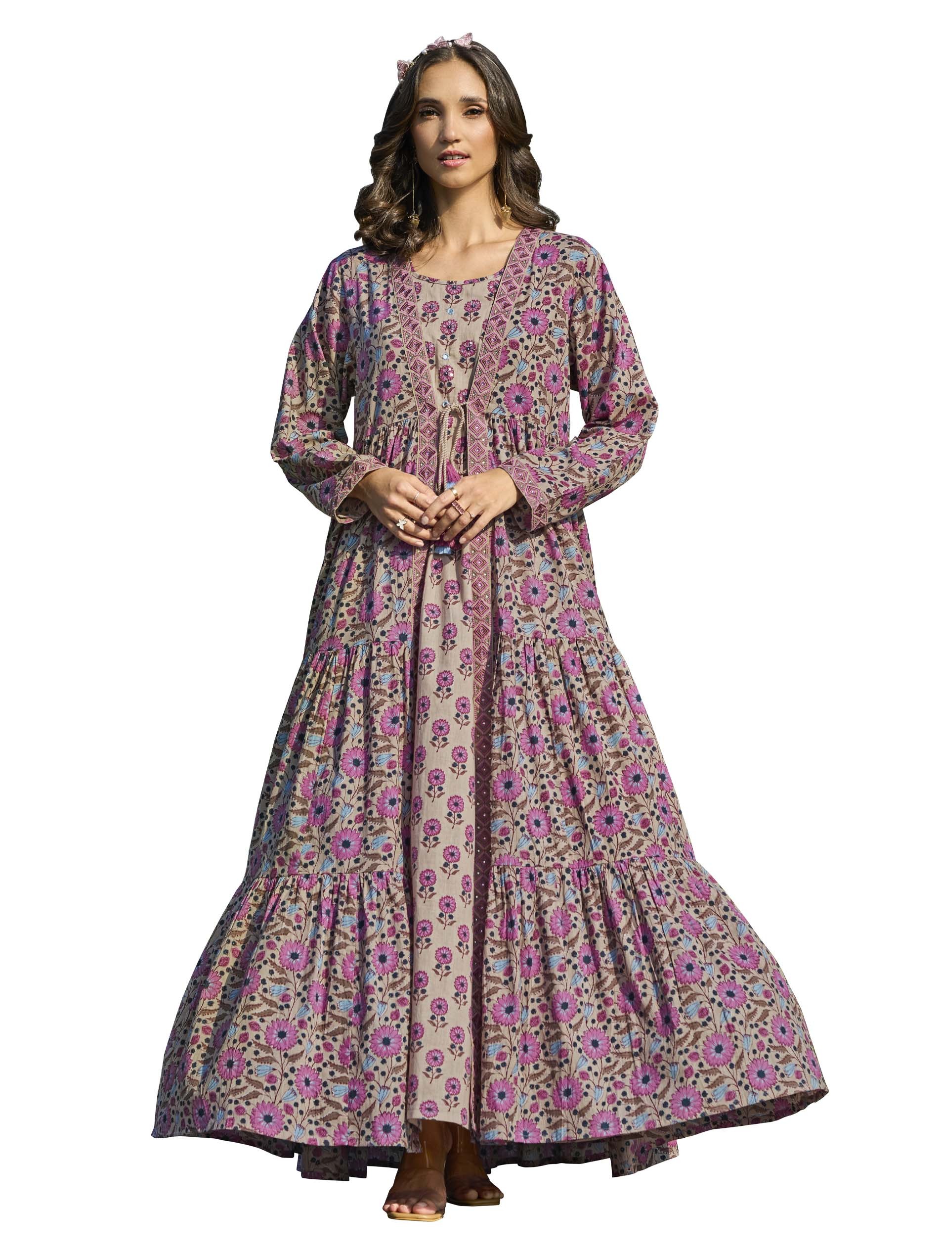This flared cotton jalabiya showcases delightful floral prints in pink and blue with a beige base, complemented by a tiered jacket featuring embroidered panels for added detail. The two-layer design combines beauty with functionality, while the breathable fabric ensures comfort during summer. Perfect for party occasions, the soft tones and intricate work create a charming and stylish look.