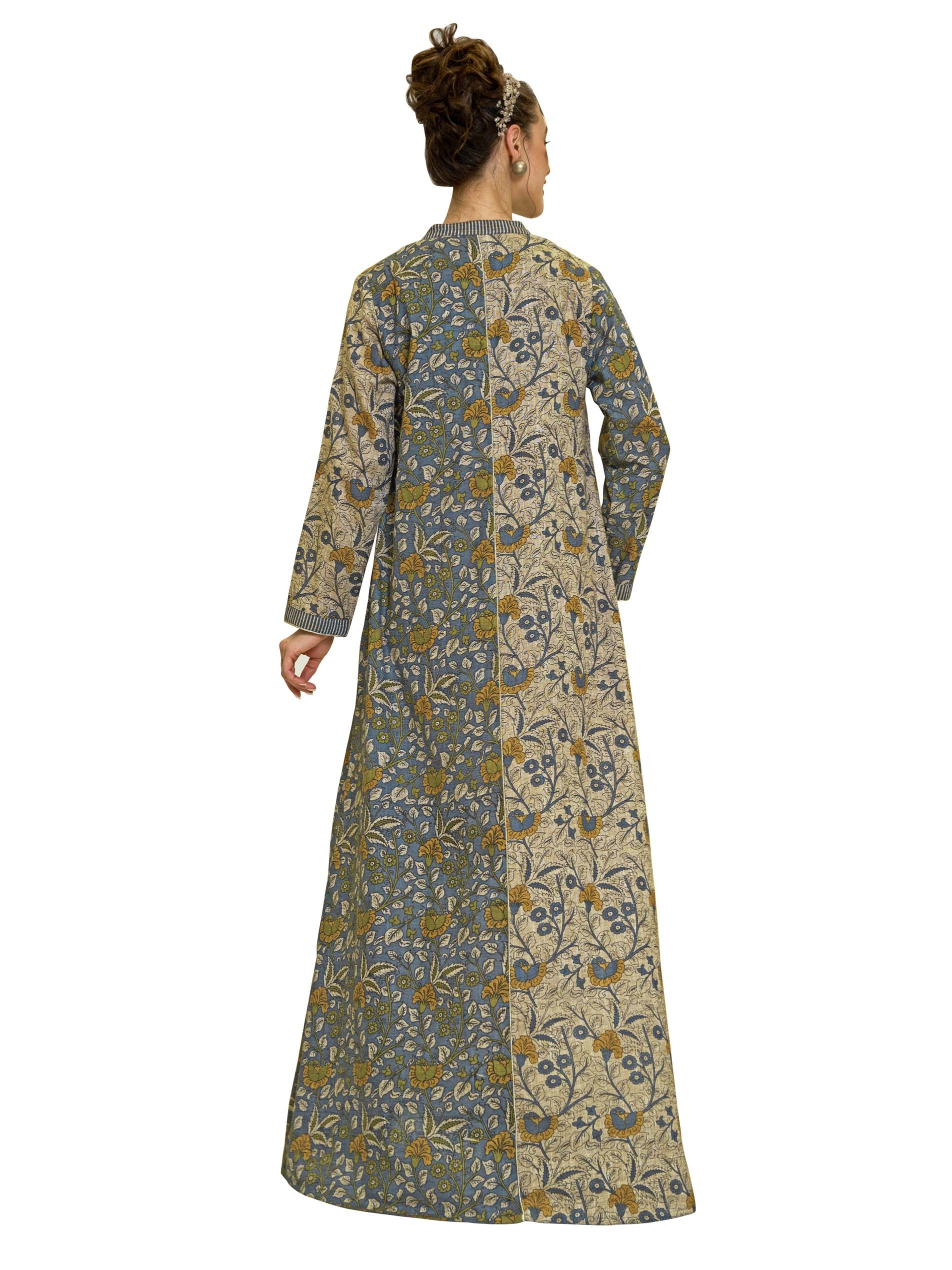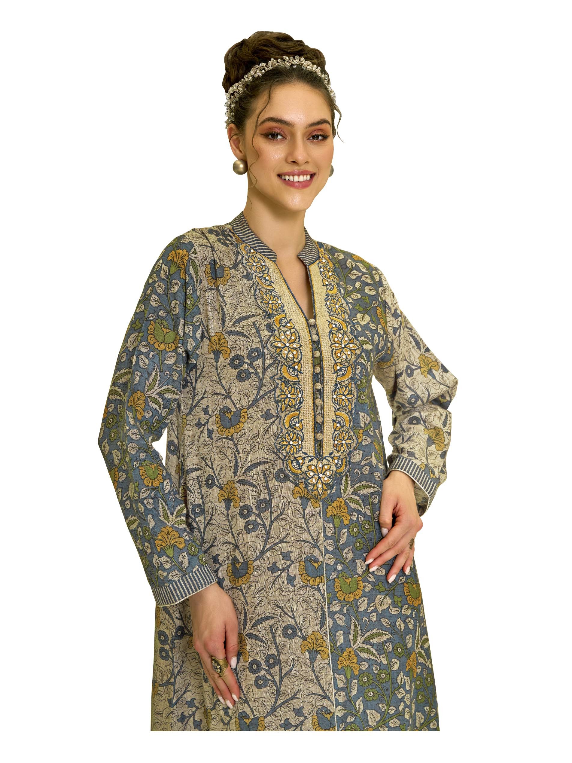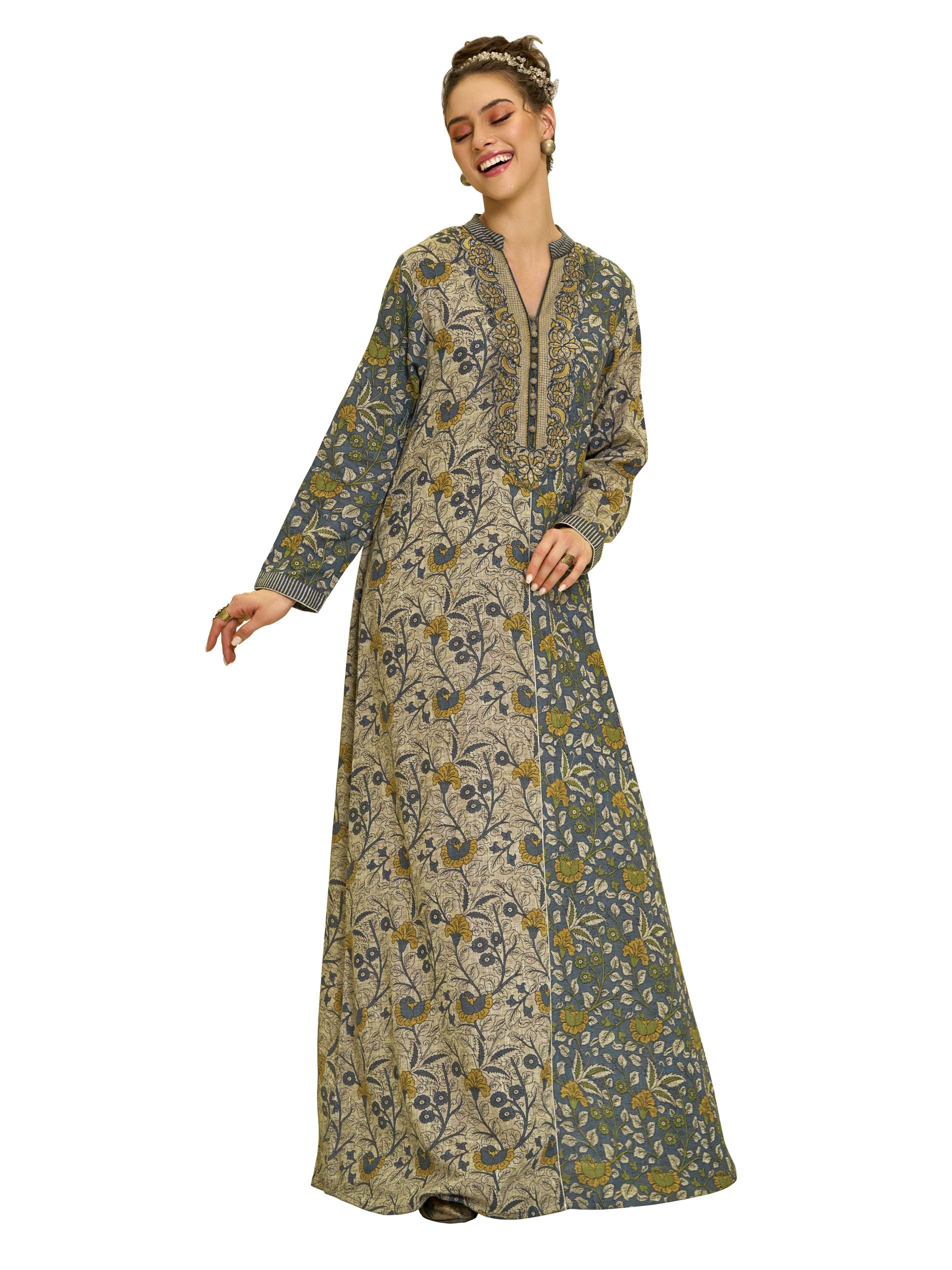This A-line cotton jalabiya combines a unique design with a beige and blue base, both featuring delicate floral prints. The V-line neckline, button work, and refined embroidery add elegance, while the breathable cotton fabric ensures comfort for casual summer occasions. A stylish yet comfortable choice for warm days.