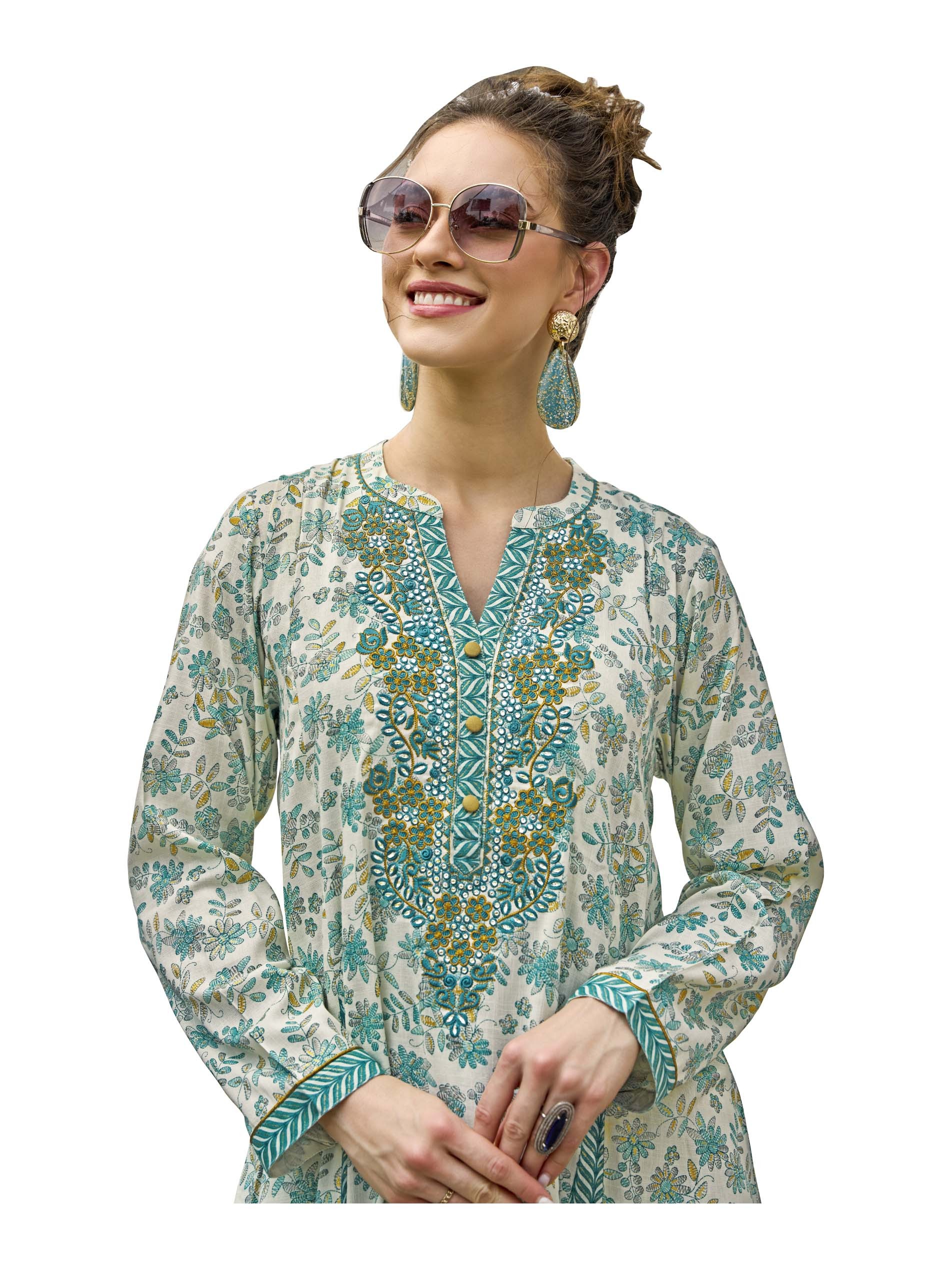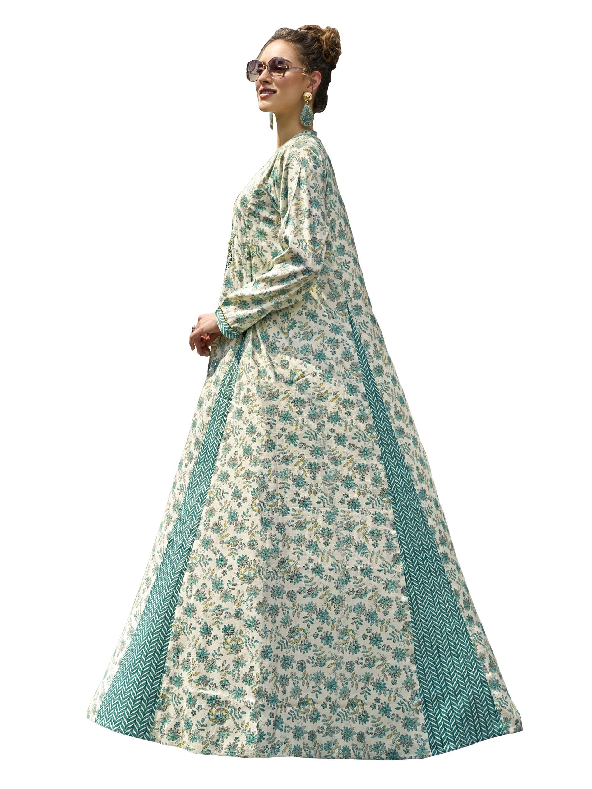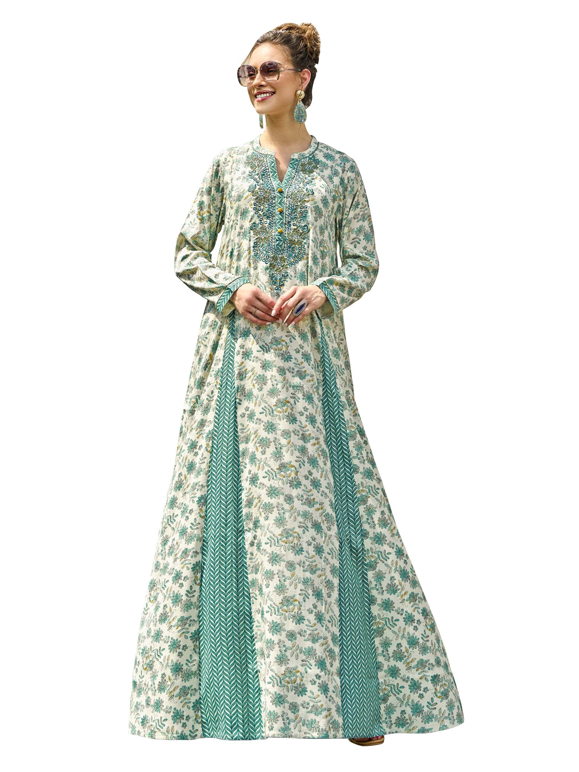 This A-line cotton jalabiya features a beautiful floral foil print combined with a chevron patchwork design. The blue and yellow embroidered neckline with button detailing adds an elegant touch. Crafted from breathable fabric with a flare cut, it’s perfect for summer parties.