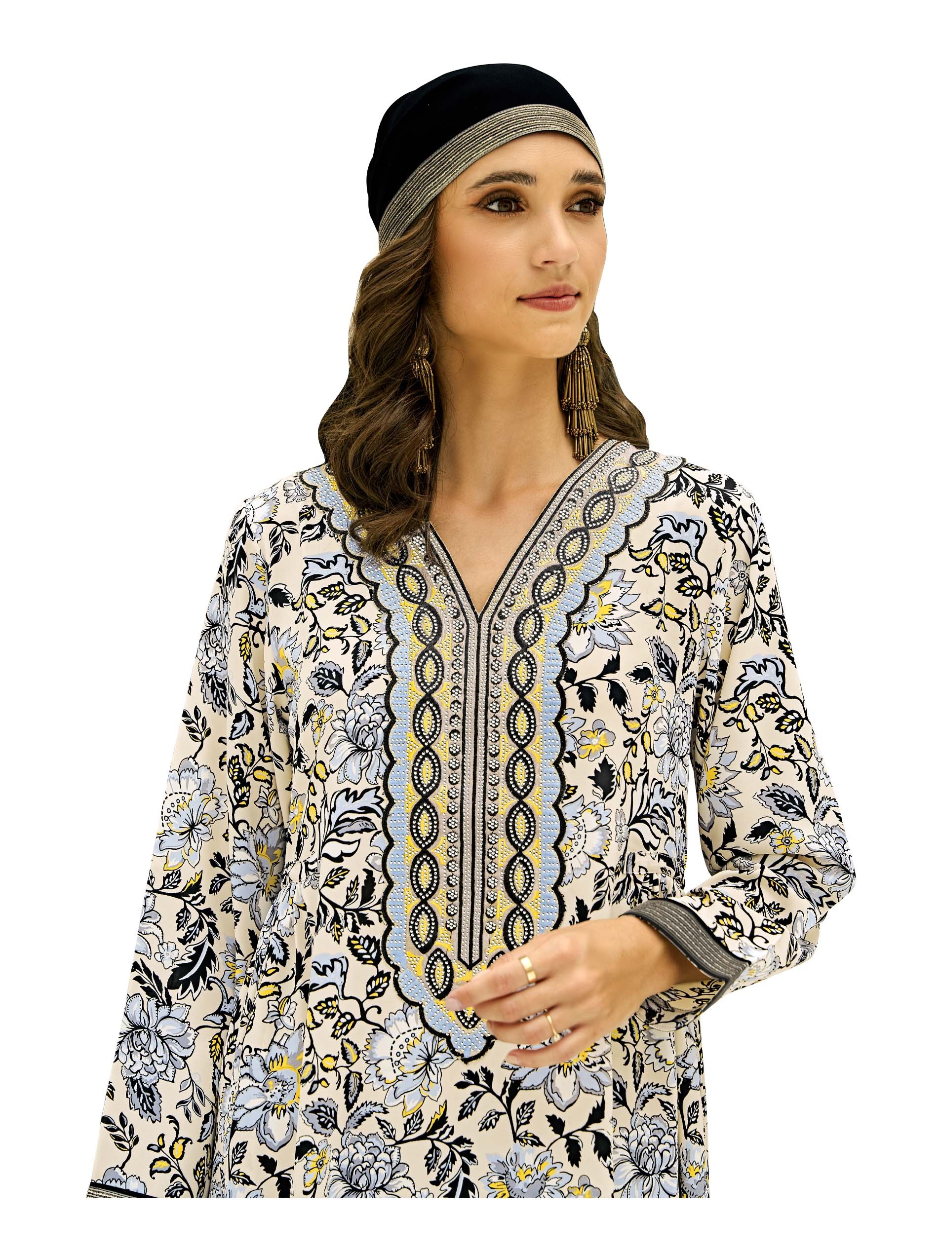 This A-line Jalabiya, crafted from breathable cotton, features a serene blend of floral prints in beige, black, baby blue, and yellow, creating a peaceful and elegant aesthetic. The waist gathering and delicate embroidery work add a touch of refinement, making it a perfect choice for casual summer outings. Comfortable and stylish, it’s ideal for warm-weather occasions.