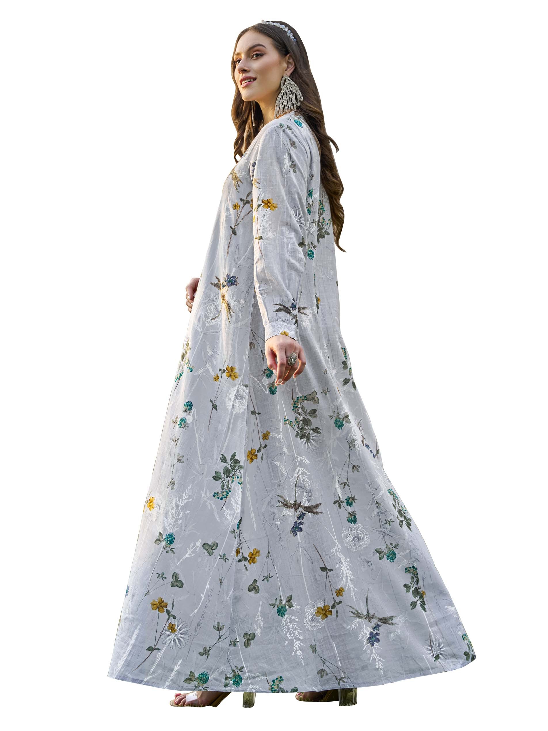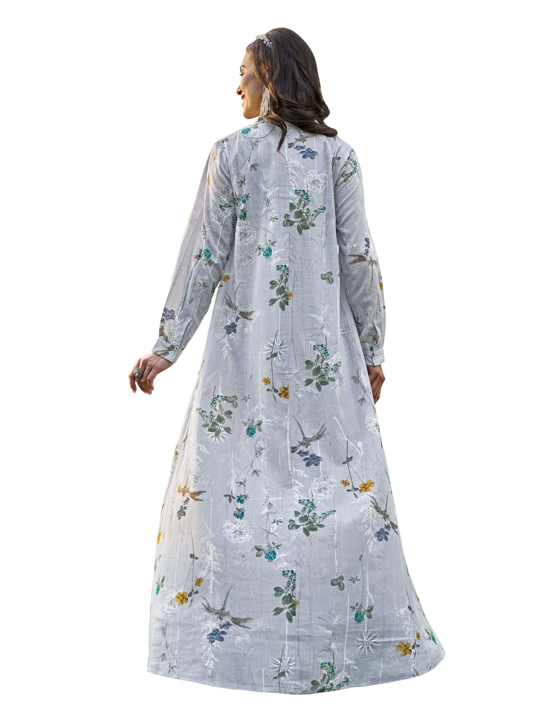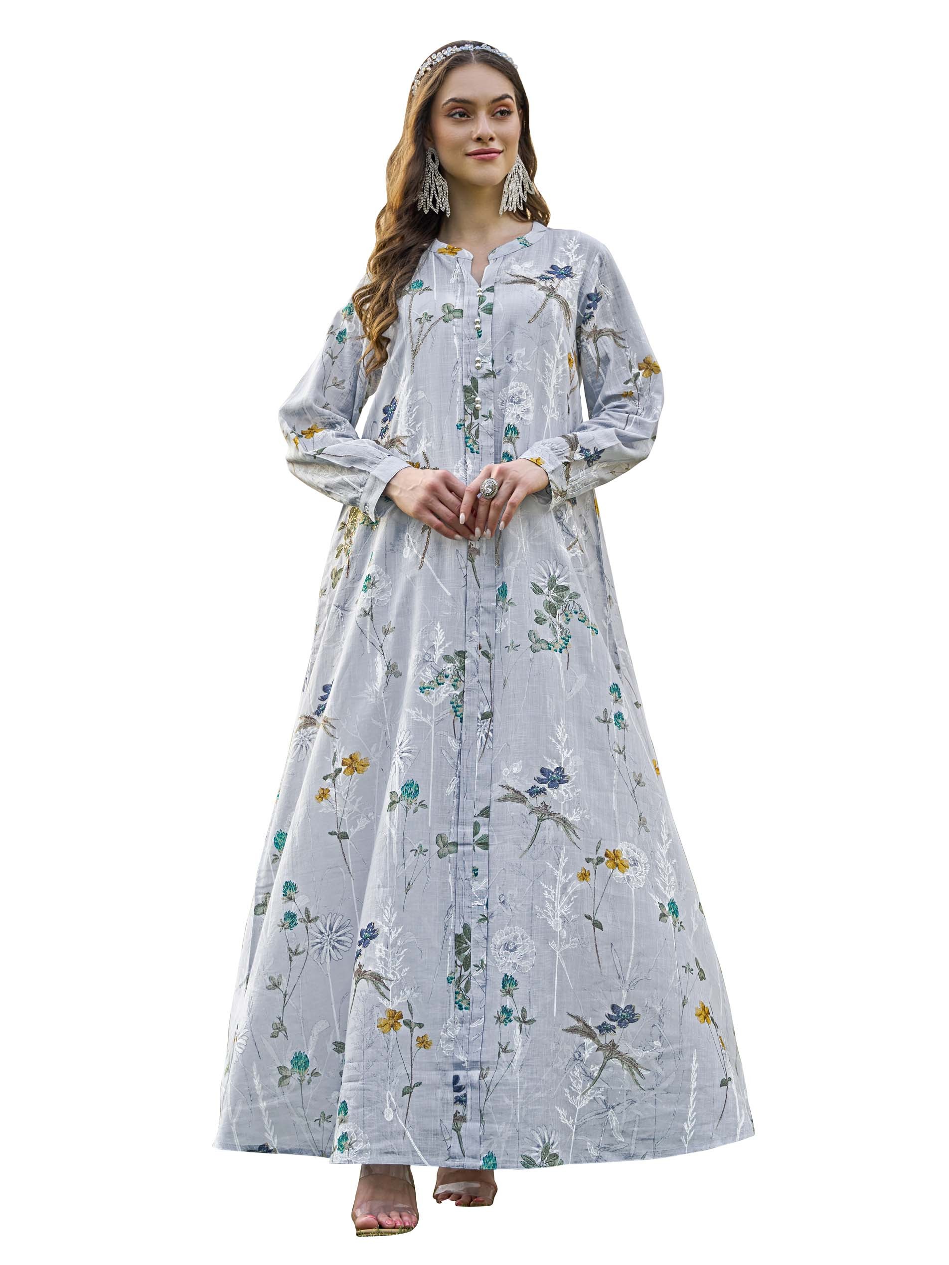 This A-line Jalabiya, crafted from breathable cotton, is perfect for casual summer wear. The grey background is beautifully adorned with delicate floral prints in white, yellow, blue, and purple, complemented by green leaves. The design is enhanced with intricate zari work and pearl embellishments, adding a touch of elegance.
