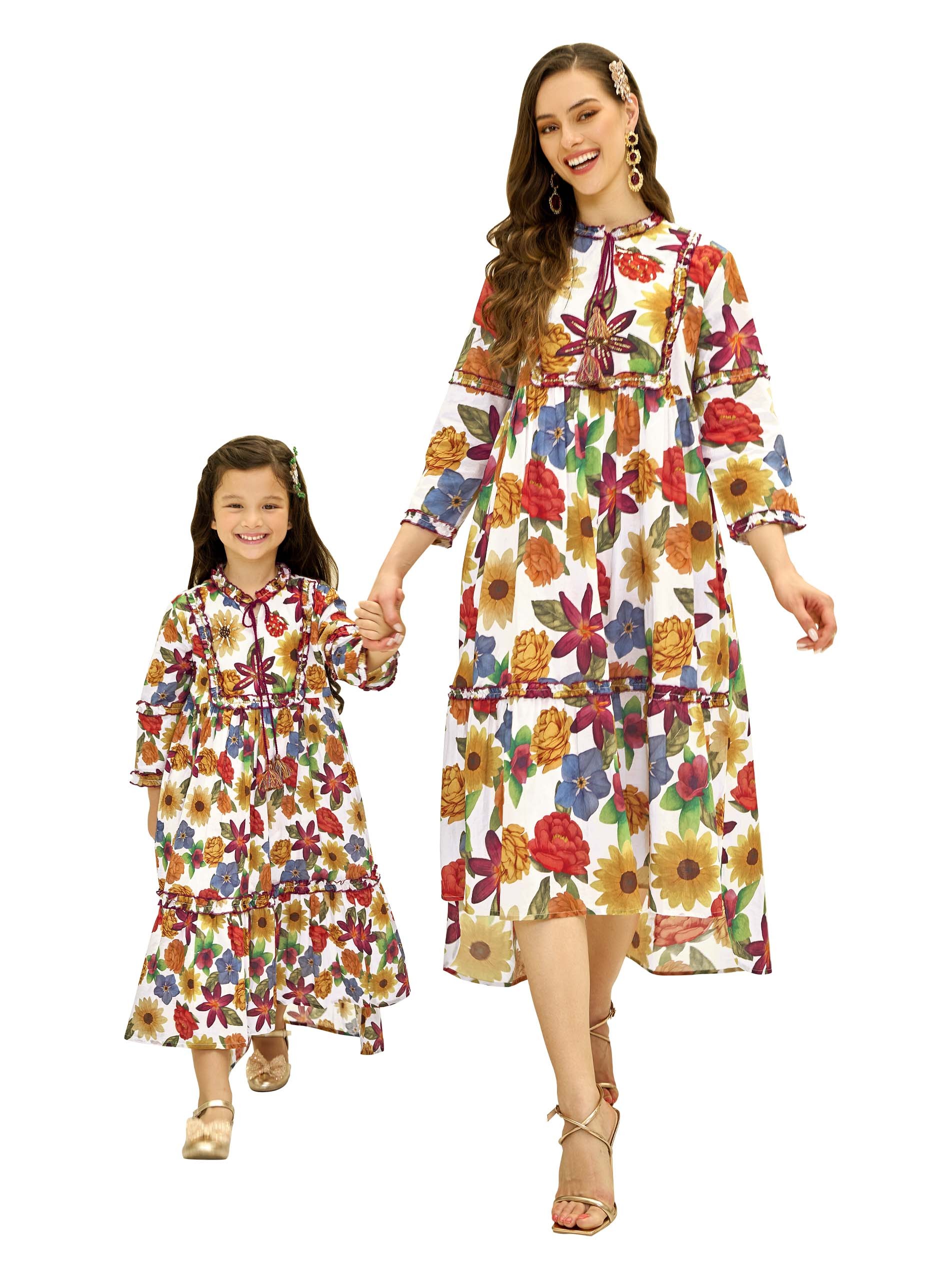 This kids' cotton jalabiya features a vibrant multi-color floral print, blending warm and cool tones for a cheerful, party-ready look. The breathable fabric ensures comfort in the summer, while the flare cut allows easy movement. Delicate ruffle details and bead work add a playful touch, making it perfect for any occasion.