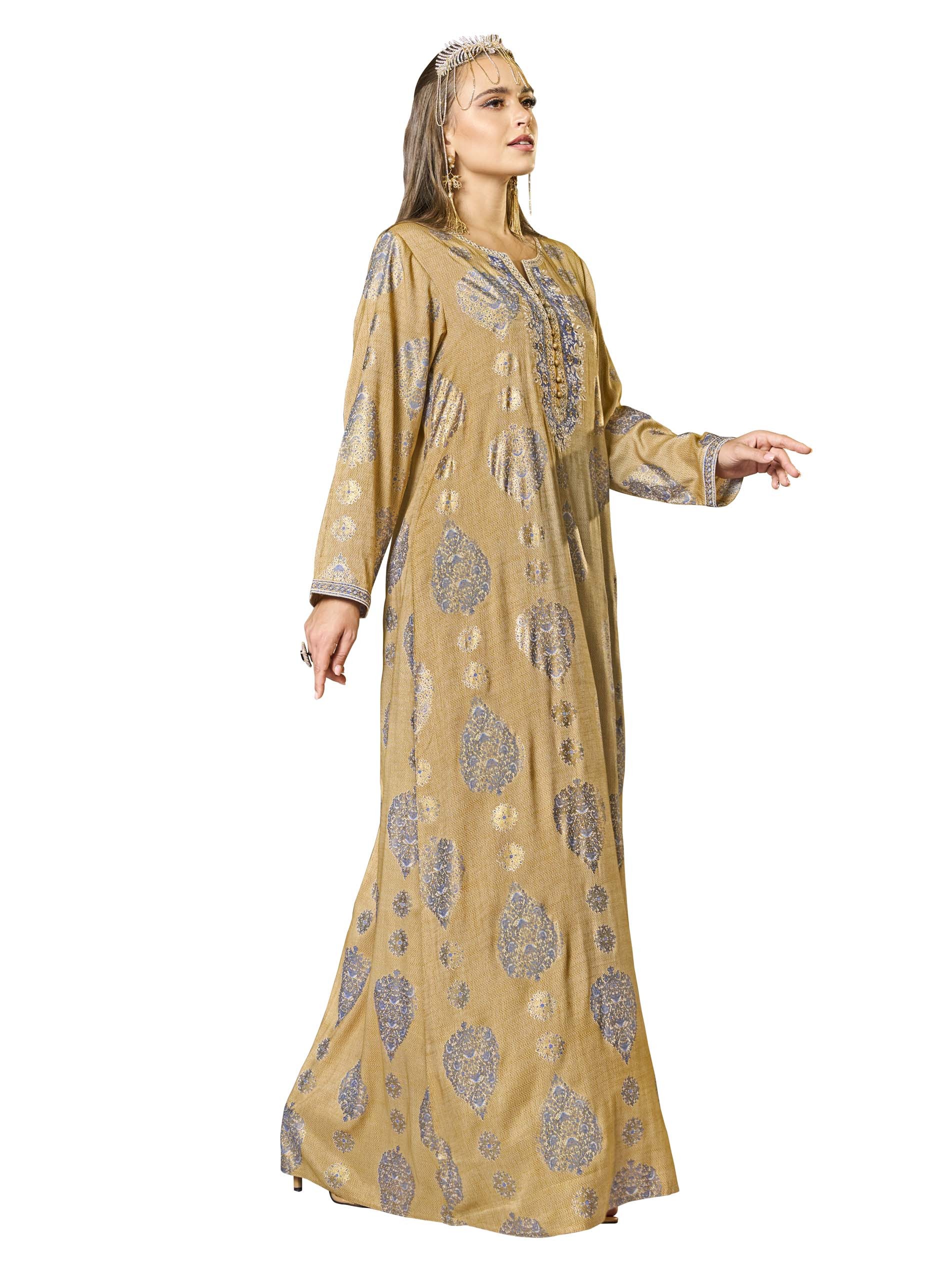 This A-line jalabiya features a mesmerizing foil print in warm, earthy tones, with delicate embroidery and buttons down the center, adding intricate detail and a subtle shimmer. Crafted from breathable cotton, it offers both elegance and comfort, making it ideal for warm summer days, especially during Ramadan. The unique design combines beauty and tradition for a standout look.