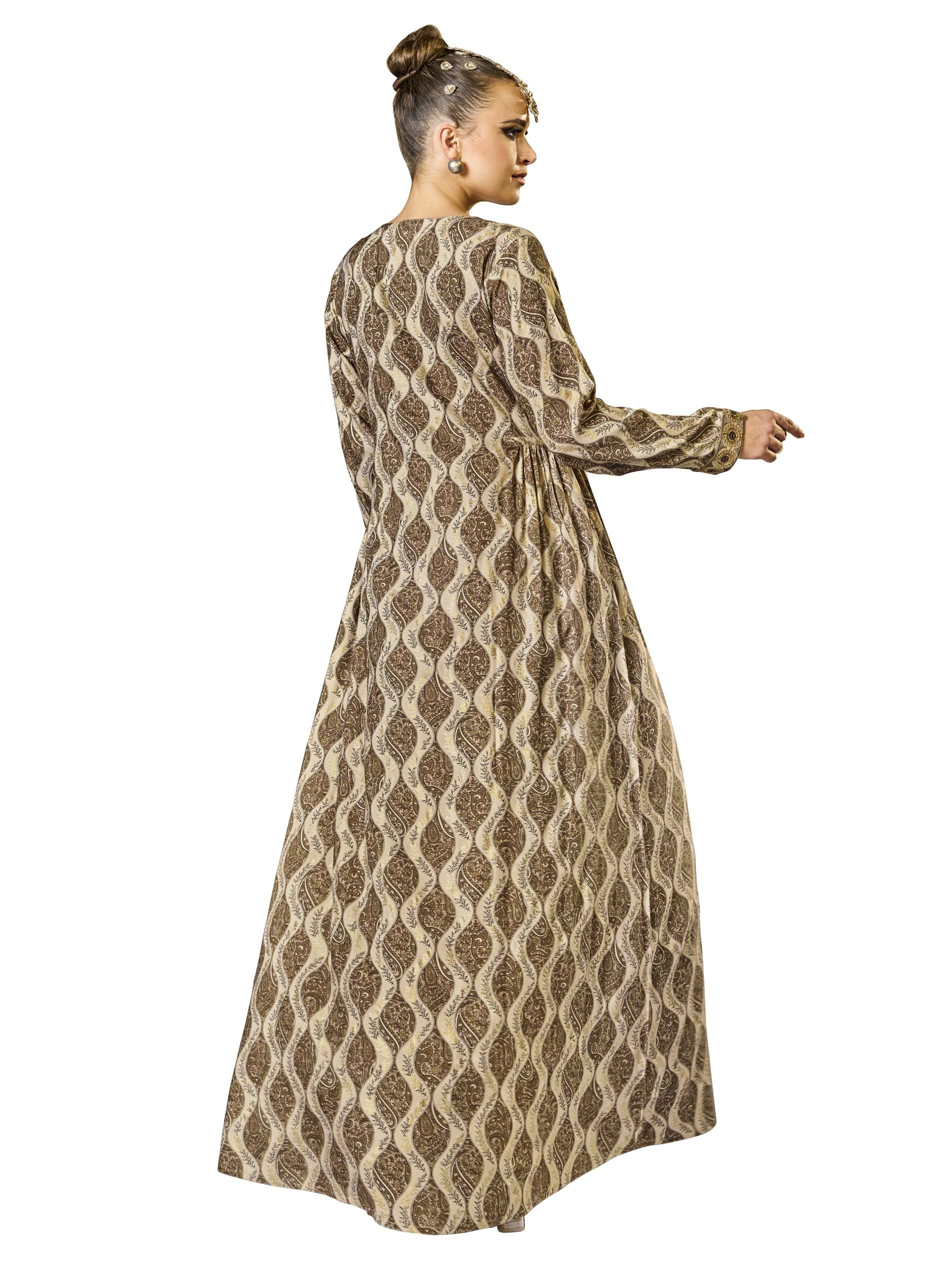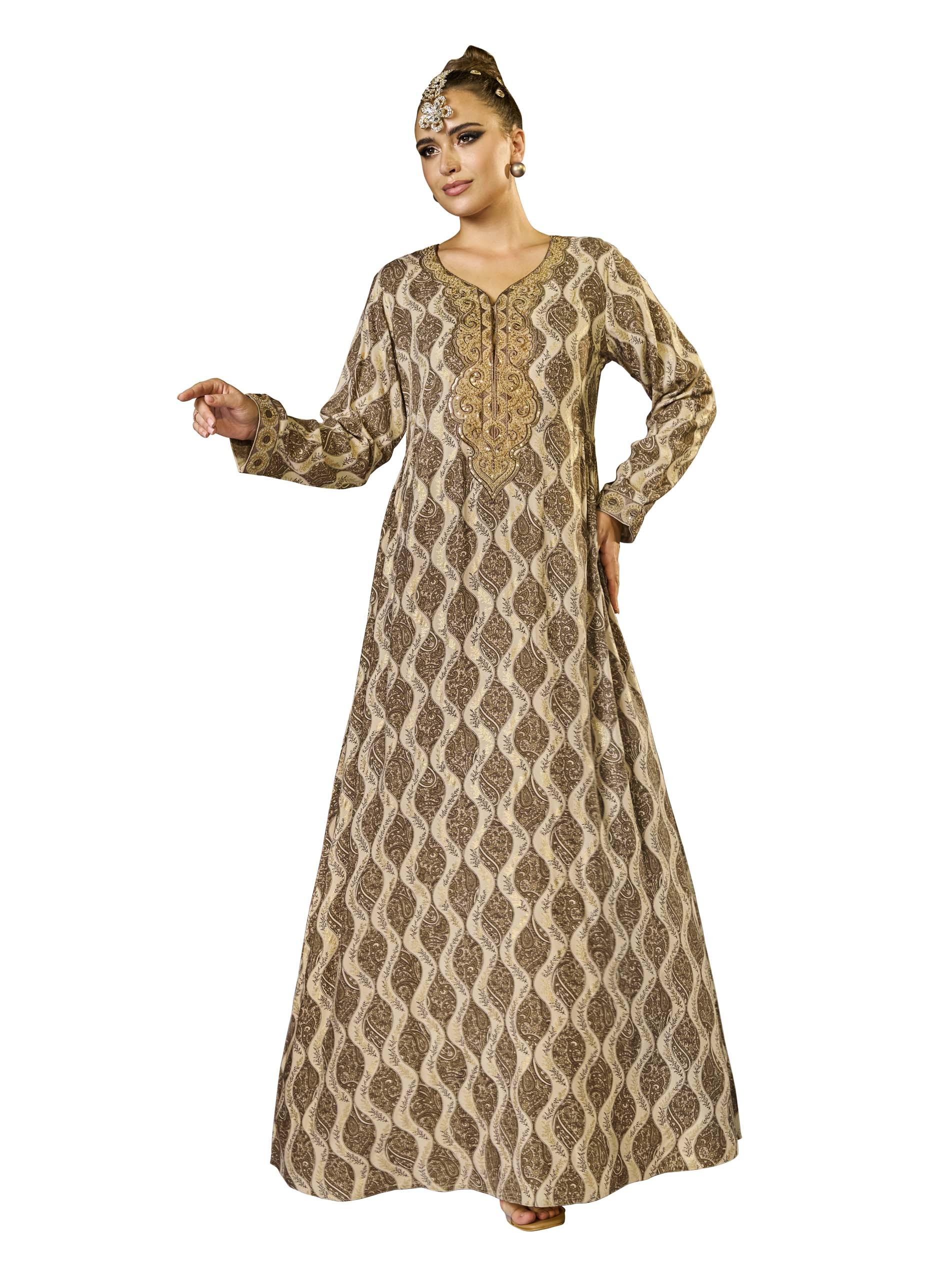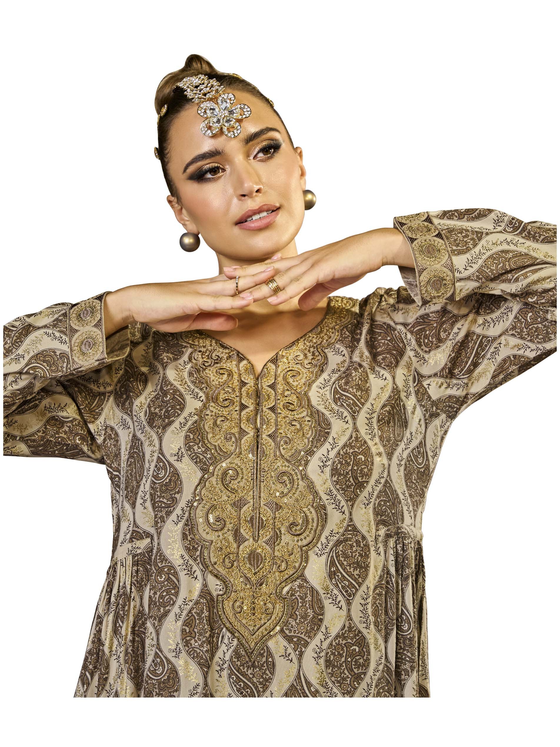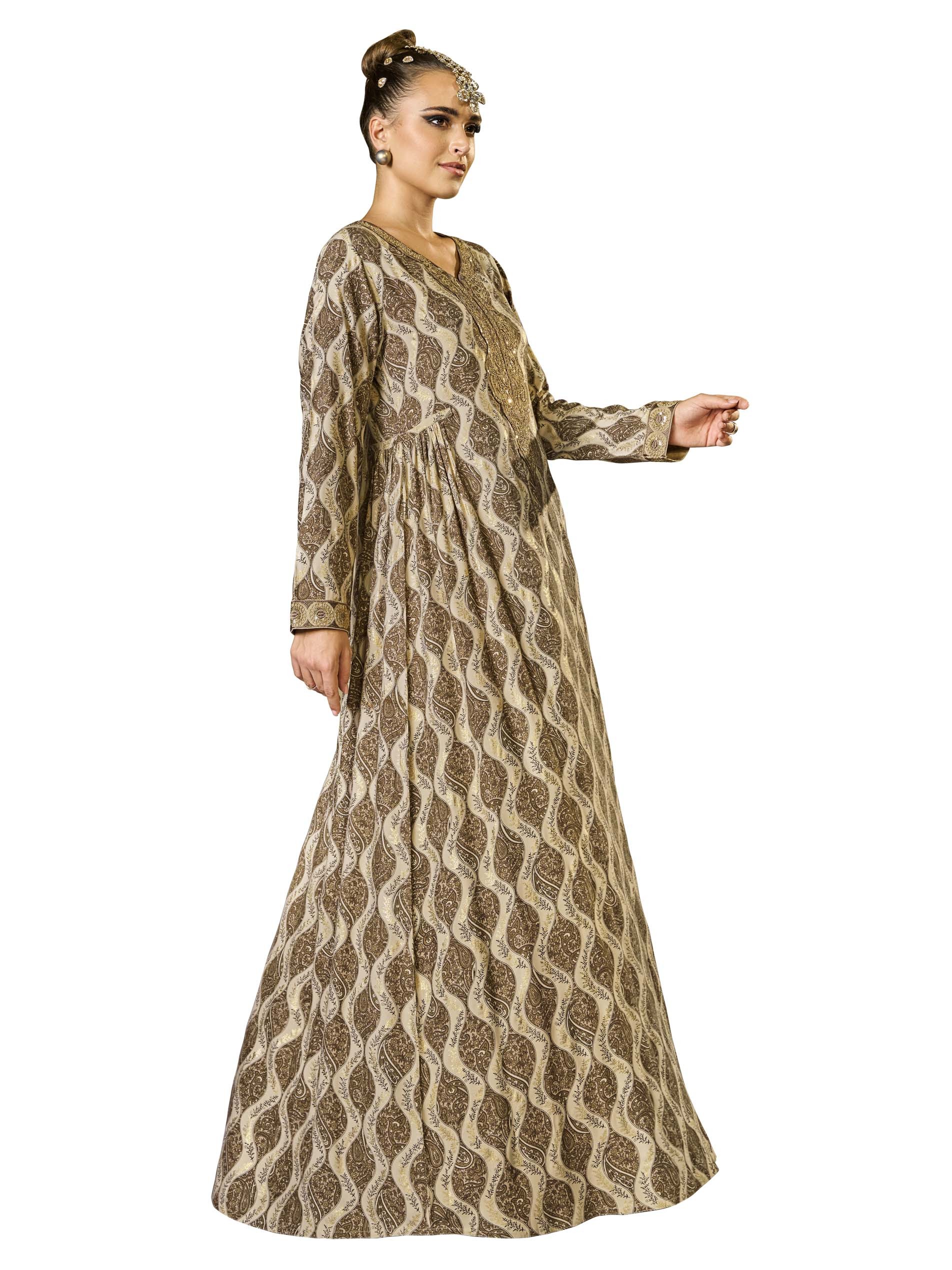 This A-line cotton jalabiya features an alluring damask foil print in warm, earthy brown and beige, complemented by delicate embroidery. The side gathering detail enhances the silhouette, creating a graceful flow while adding visual interest. Crafted from breathable fabric, it offers both comfort and style, making it perfect for summer and Ramadan celebrations.