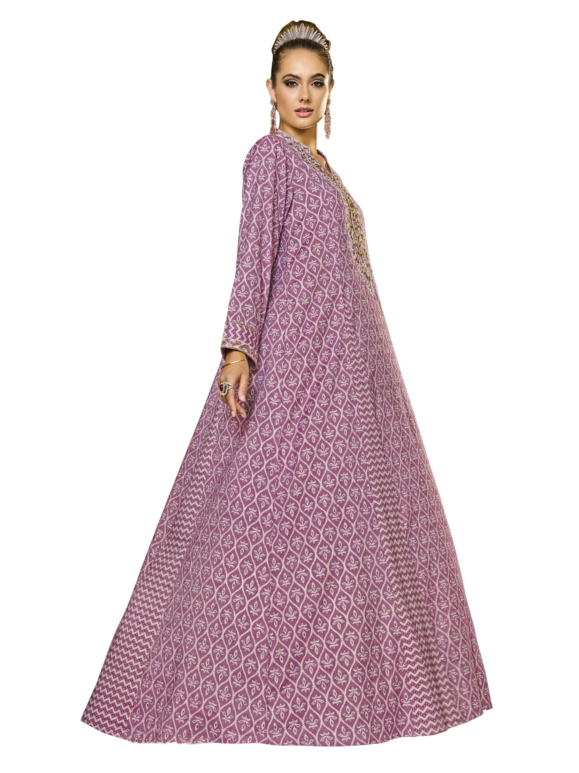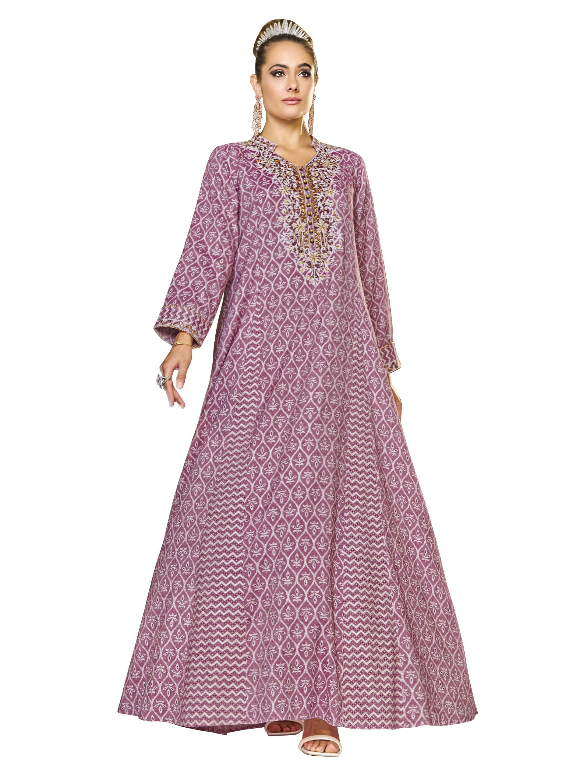 This jalabiya features floral cotton foil prints on a muted purple base, accented with delicate embroidery, button details, and chevron patterns. Crafted from breathable viscose fabric, it offers a soft drape and an elegant A-line silhouette. Its lightweight design makes it perfect for summer, especially during Ramadan celebrations.