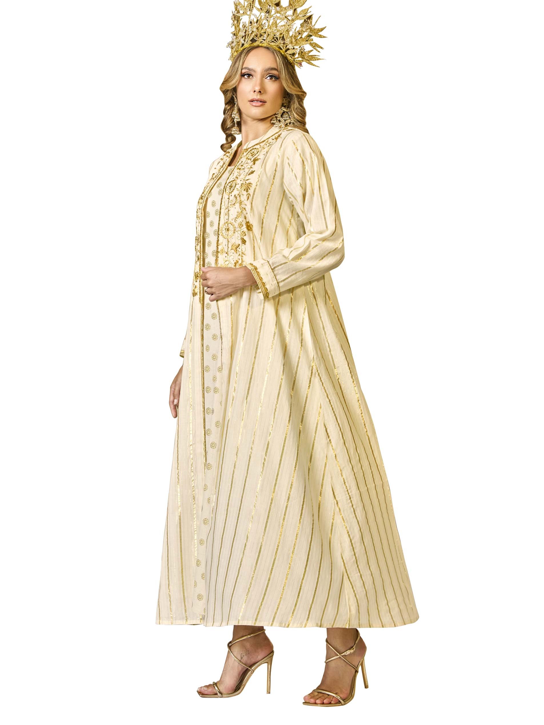 This two-piece jalabiya features a cotton jacket-style cut, perfect for summer. The jacket is adorned with shimmering golden lurex stripes, intricate embroidery, and embellishments, adding a luxurious touch, while the inner layer boasts delicate golden motifs that complement the design. Ideal for Ramadan celebrations, this combination exudes elegance and sophistication.