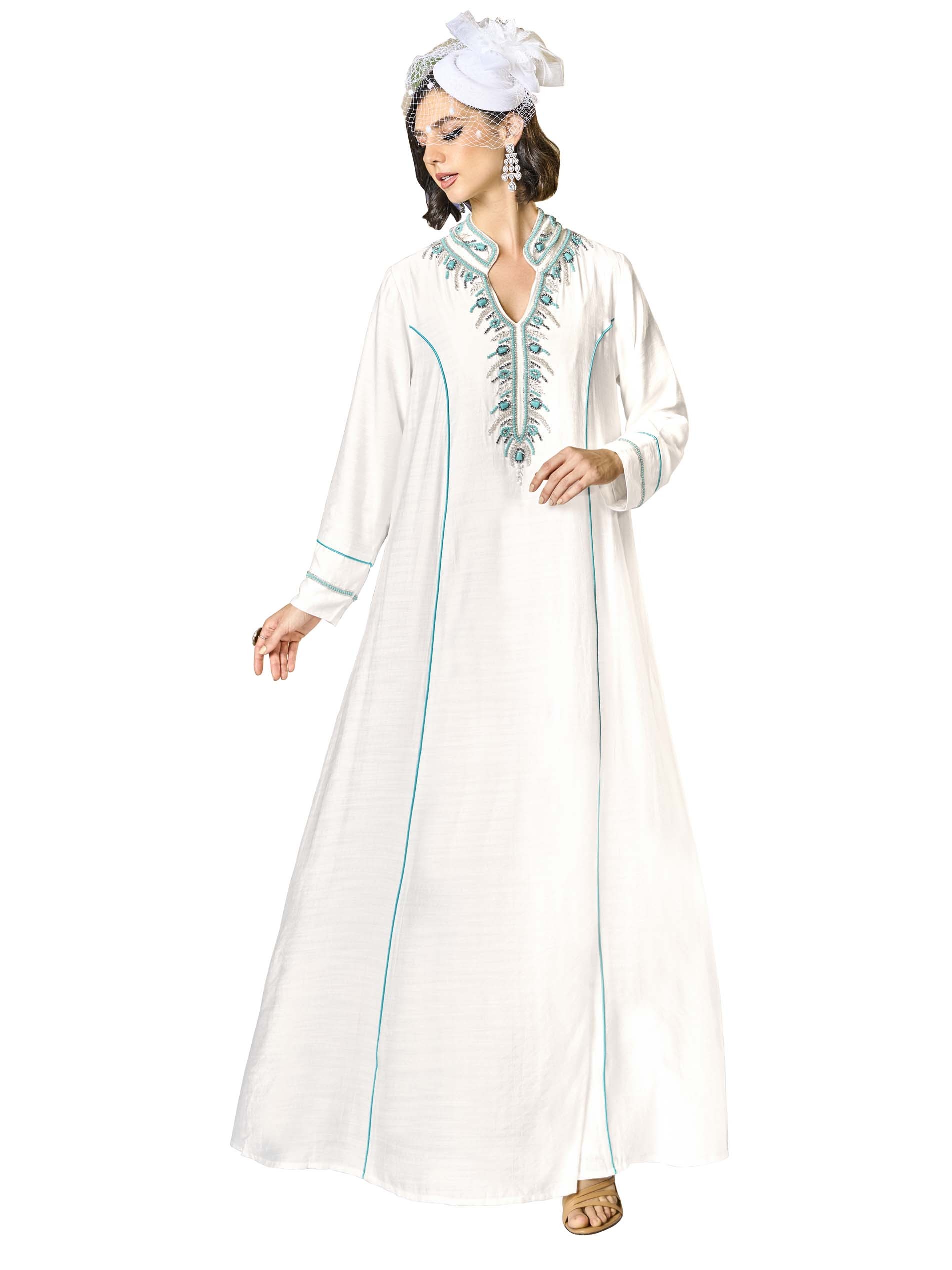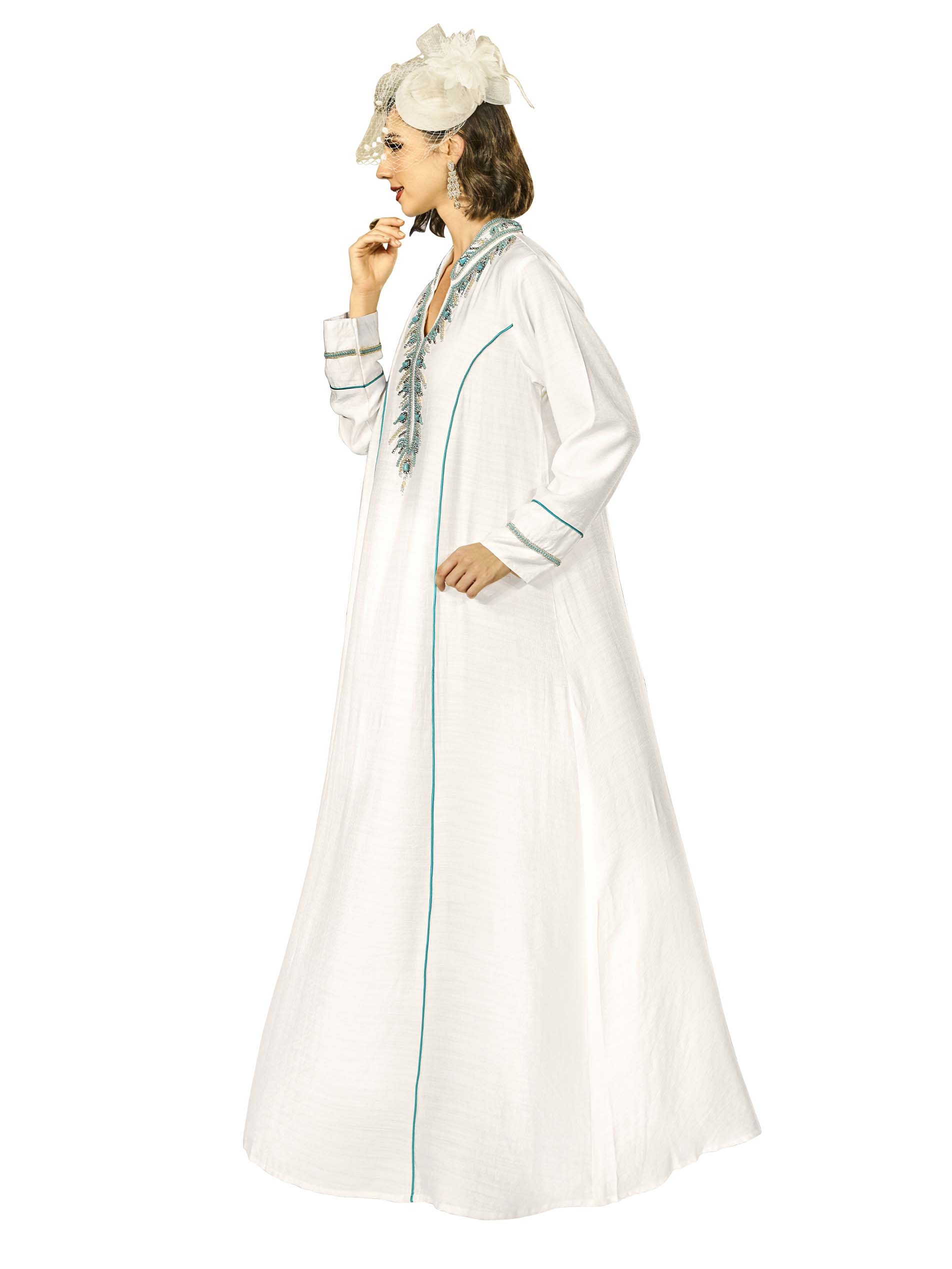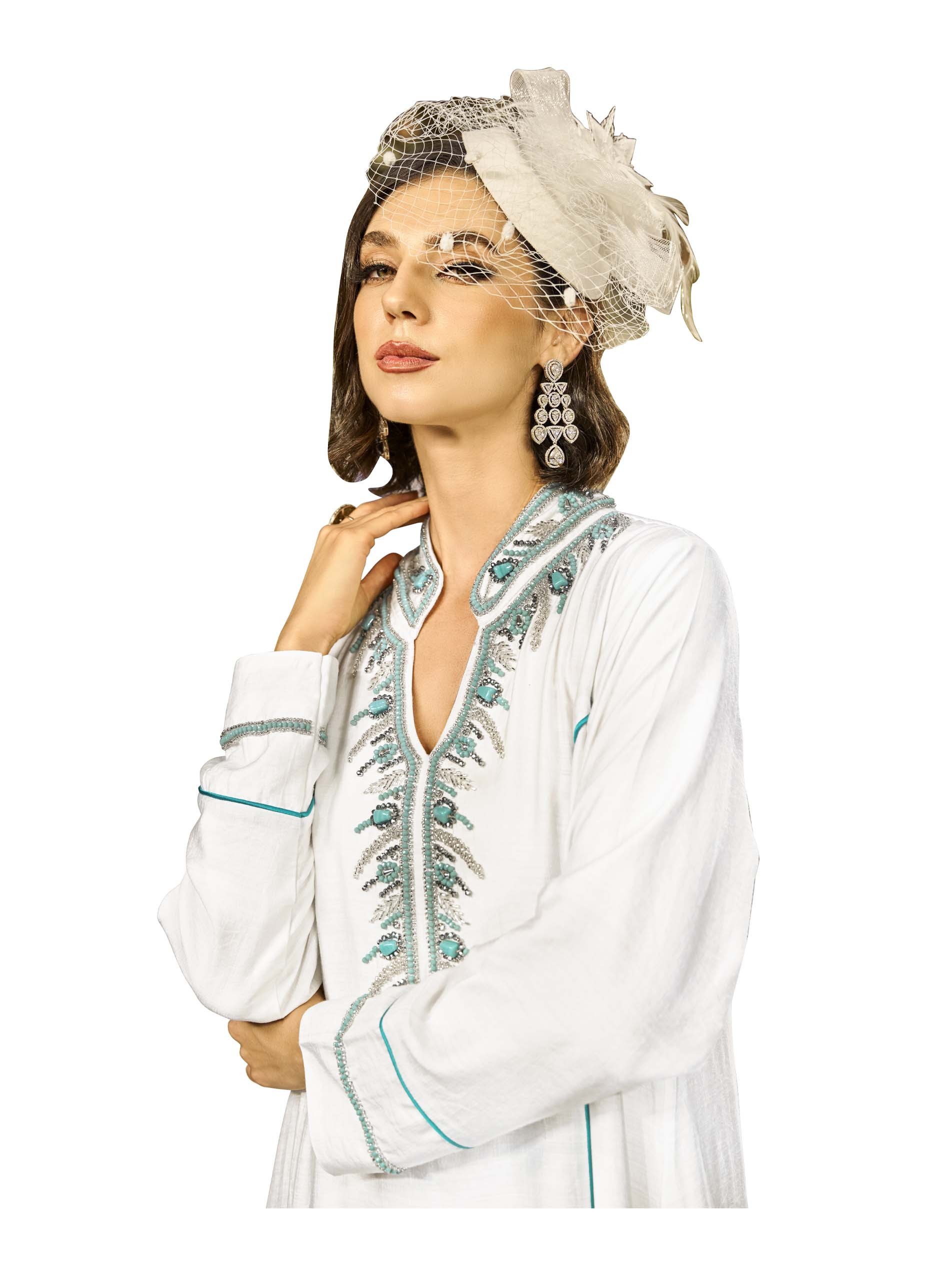 This A-line Jalabiya, crafted from lightweight viscose, features a soft white hue that symbolizes purity, making it perfect for Ramadan. Intricate bead handwork and turquoise embellishments around the neckline and cuffs elevate its simple yet refined design. Ideal for the summer weather, it offers both comfort and elegance.