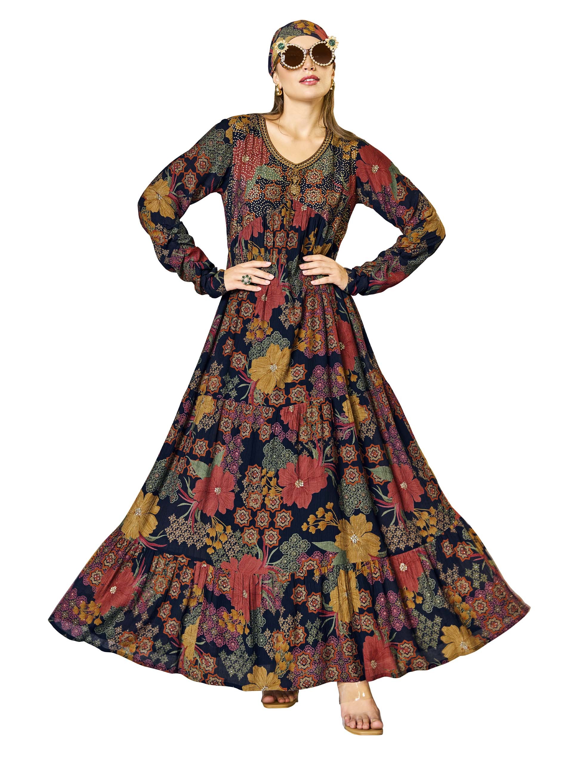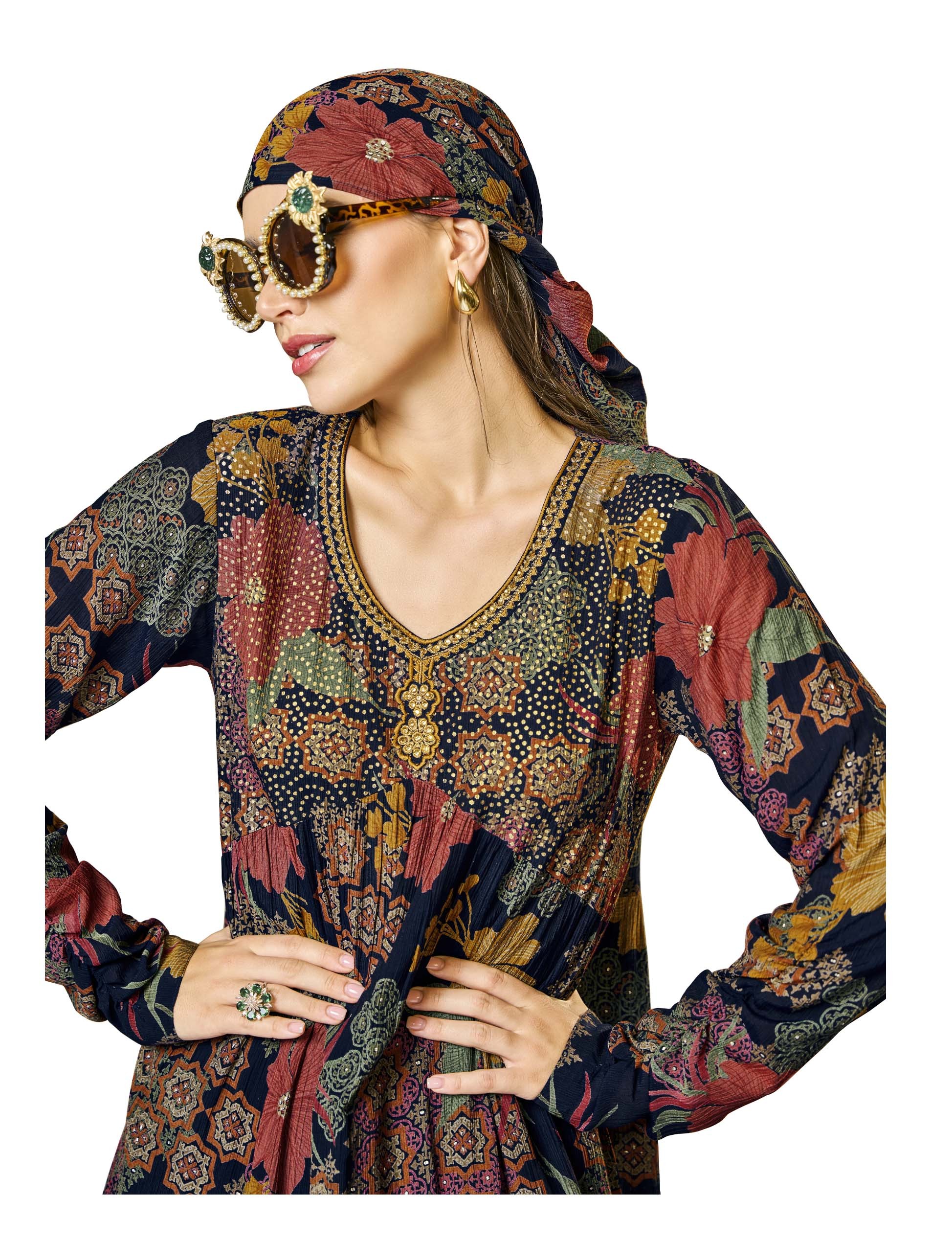 This flare Jalabiya, crafted from breathable cotton, features a mesmerizing all-over floral print in vibrant shades of deep blues, rich reds, and warm yellow. The intricate floral patterns, paired with geometric motifs, add depth and elegance, while the foil and embroidery neckline elevate the design. Perfect for summer parties, this piece offers both style and comfort.