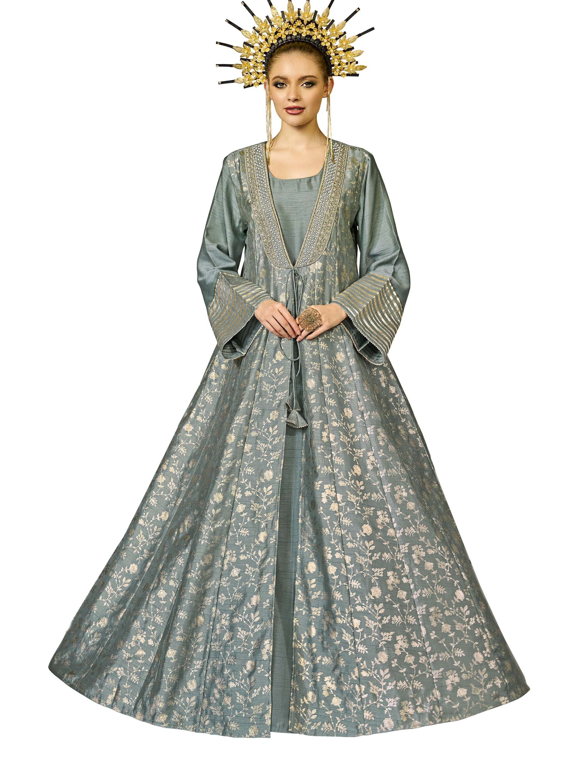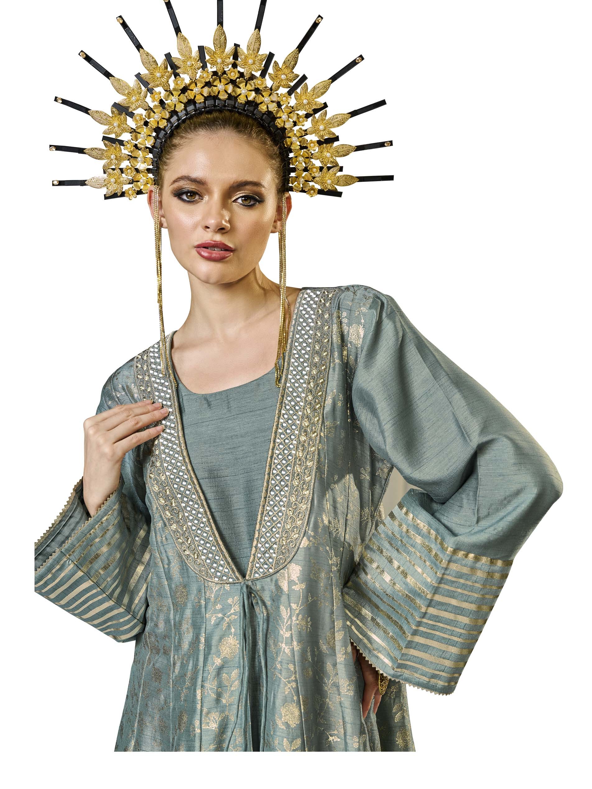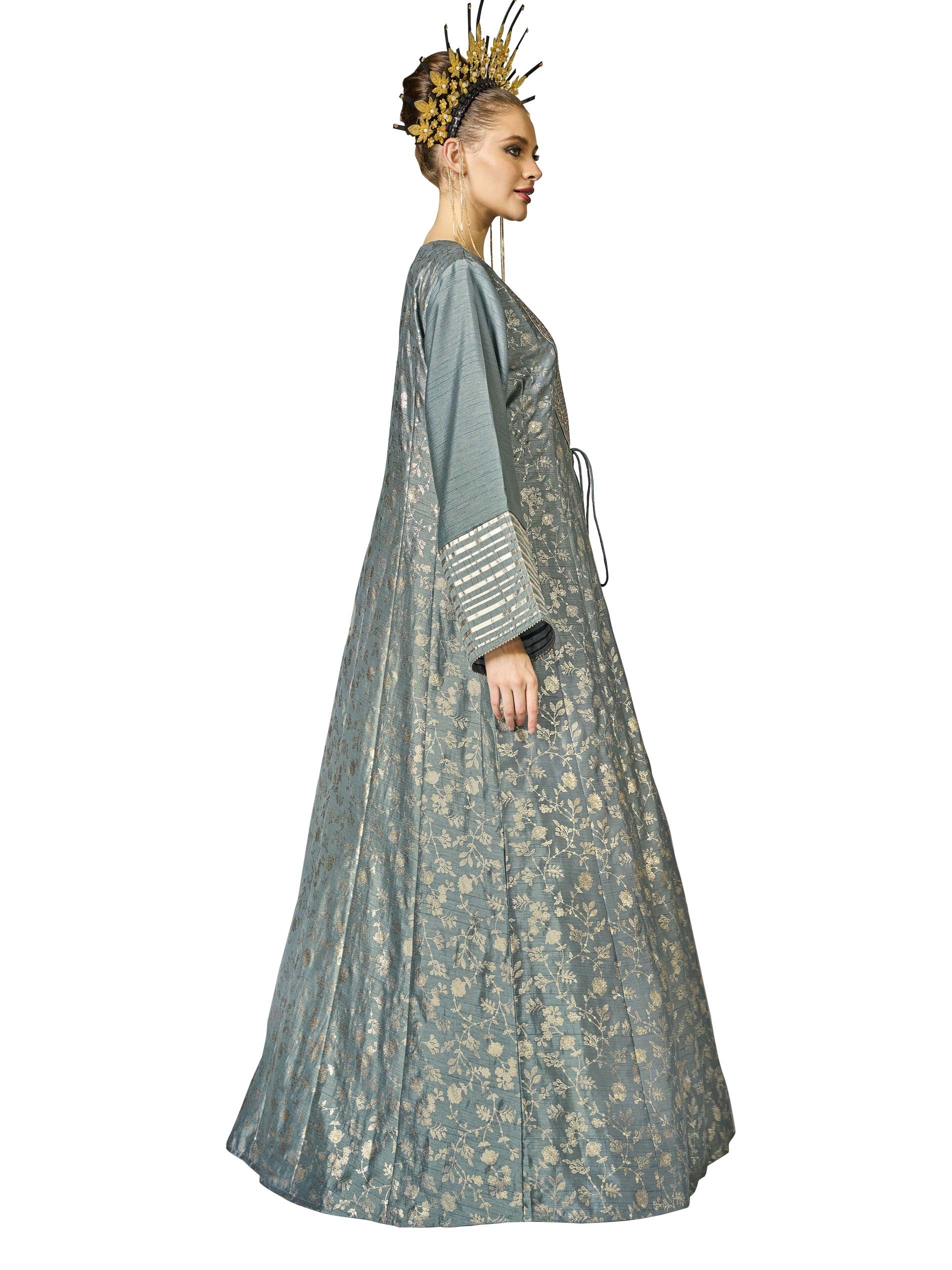 This jacket-style Jalabiya, crafted from breathable cotton, features a soft grey inner layer that complements the delicate floral print of the outer jacket. The foil print and golden embroidery add a touch of elegance, while the modern jacket cut brings a contemporary twist to the traditional silhouette. Perfect for the holy month of Ramadan, this piece combines style and cultural significance.