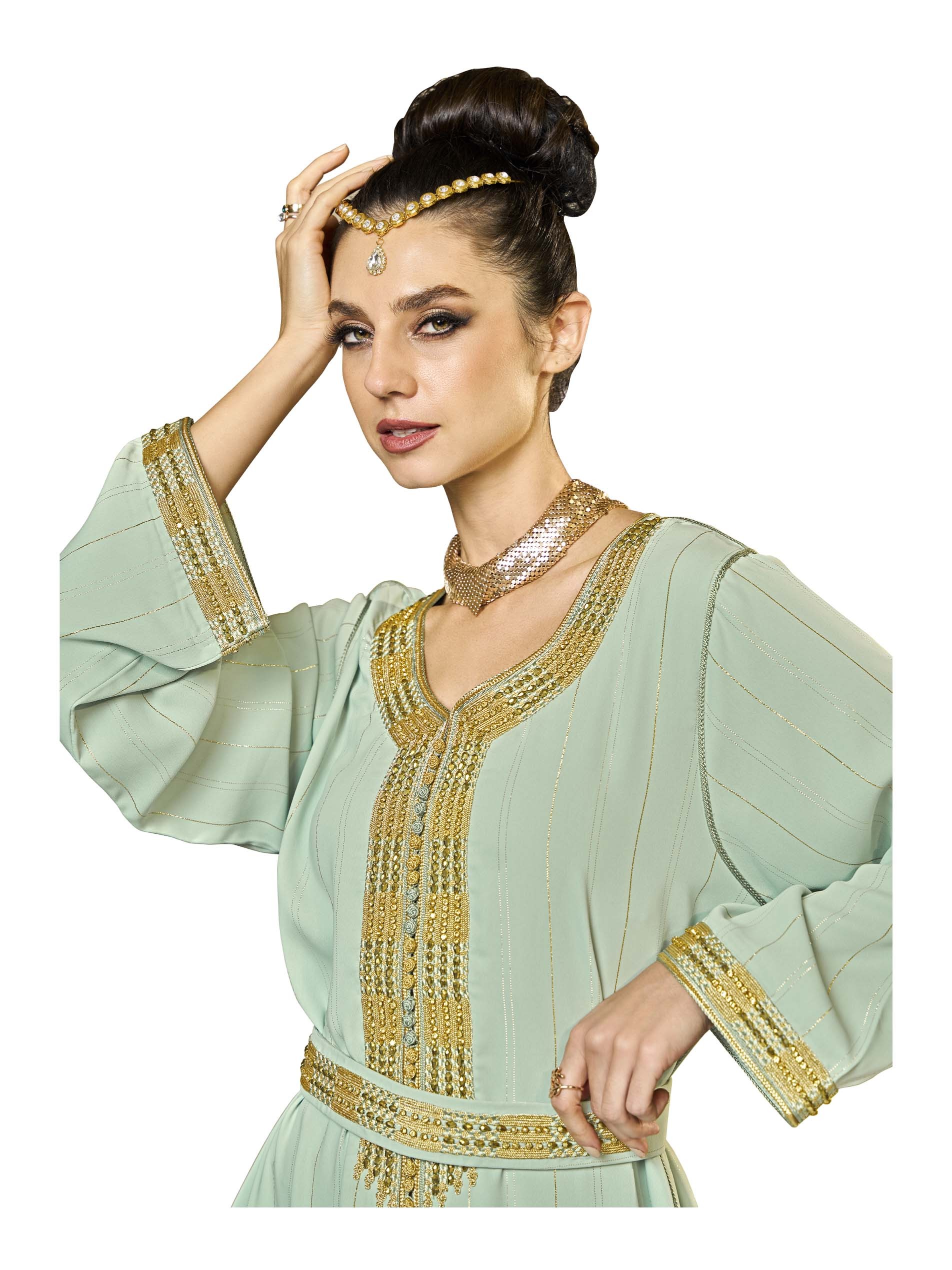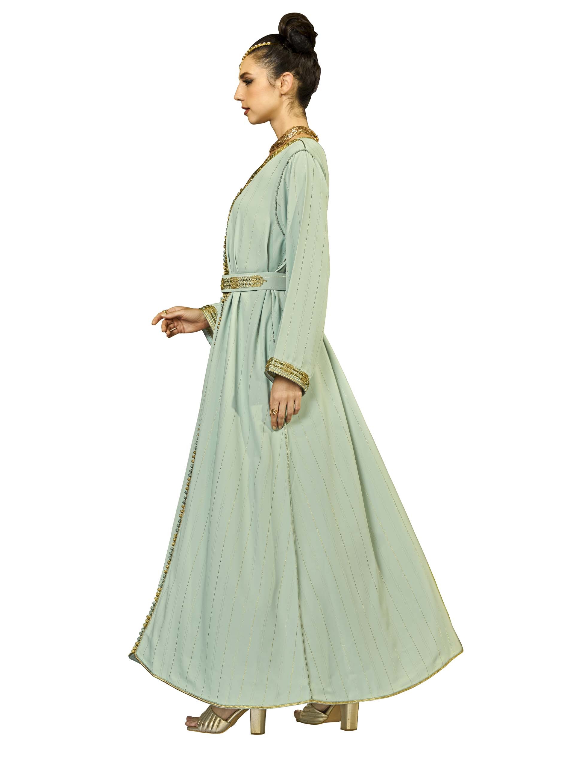 This elegant flared jalabiya, made from luxurious satin, features beautiful gold Moroccan detailing and intricate embroidery work on the neck and waist. The soft pastel green colour, enhanced with gold accents, creates a festive and elegant look, making it an ideal choice for Ramadan. The breathable fabric ensures comfort, making it an ideal choice for summer celebrations.