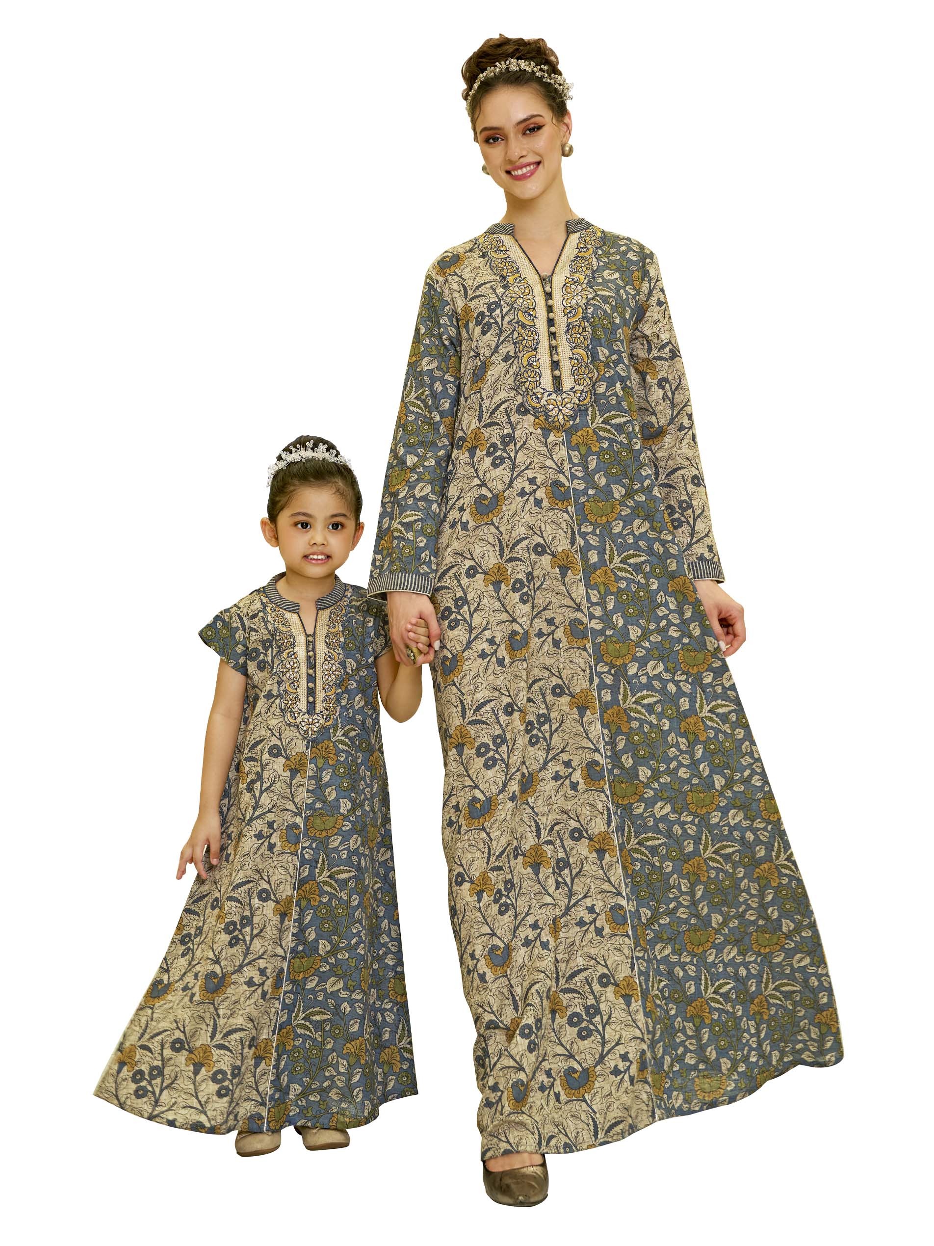 This A-line cotton jalabiya for kids features a playful design with a beige and blue base, both adorned with cheerful floral prints. The V-line neckline, button details, and delicate embroidery add a fun and stylish touch, while the breathable fabric ensures comfort for active summer days. Perfect for casual occasions, offering both style and comfort.