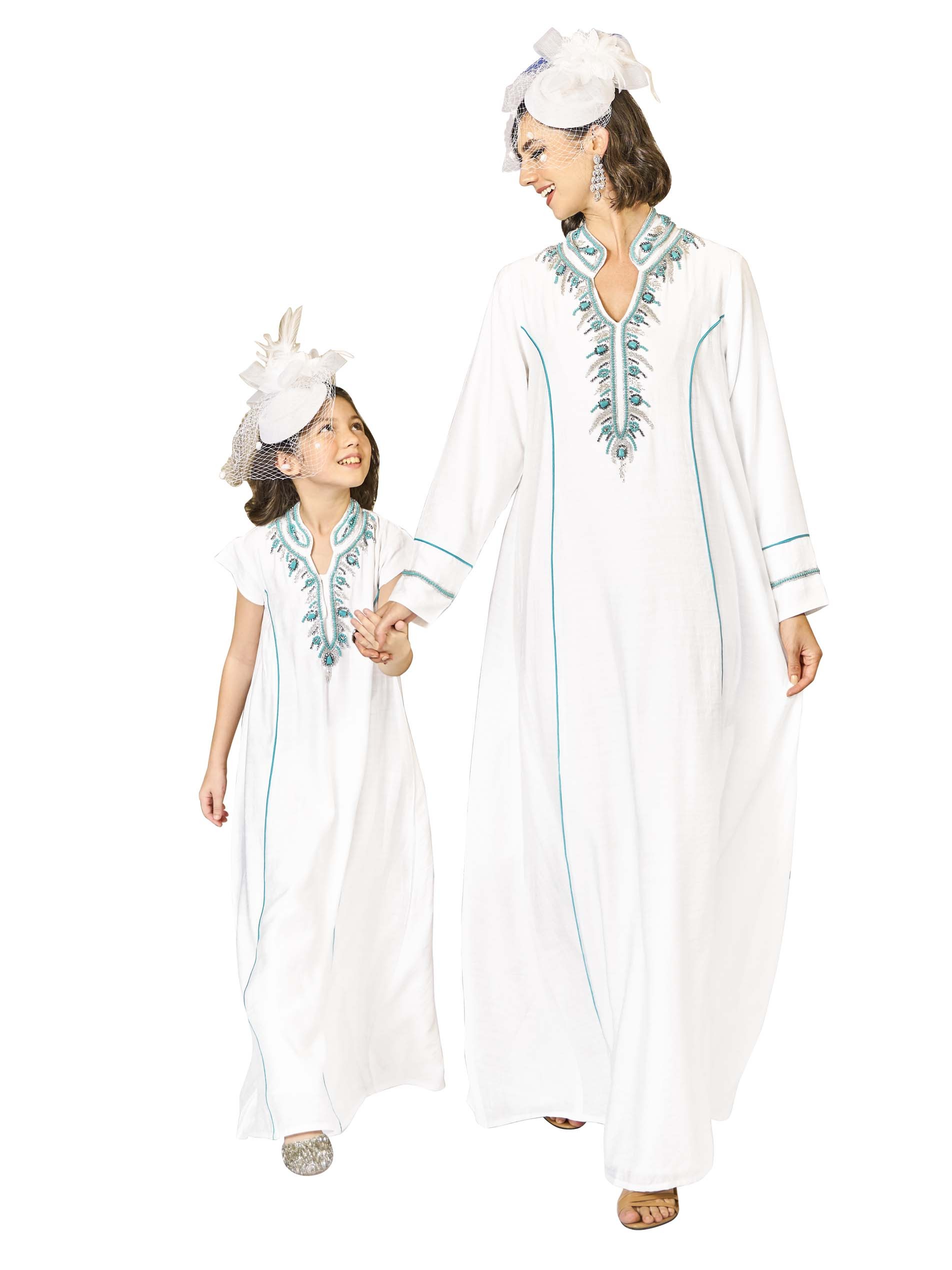 This A-line kids' Jalabiya, made from lightweight viscose, is perfect for keeping little ones cool and comfortable during the summer. The soft white hue symbolizes purity, while delicate bead handwork and turquoise embellishments around the neckline and cuffs add an elegant, playful touch. Ideal for Ramadan, it blends simplicity and style beautifully.