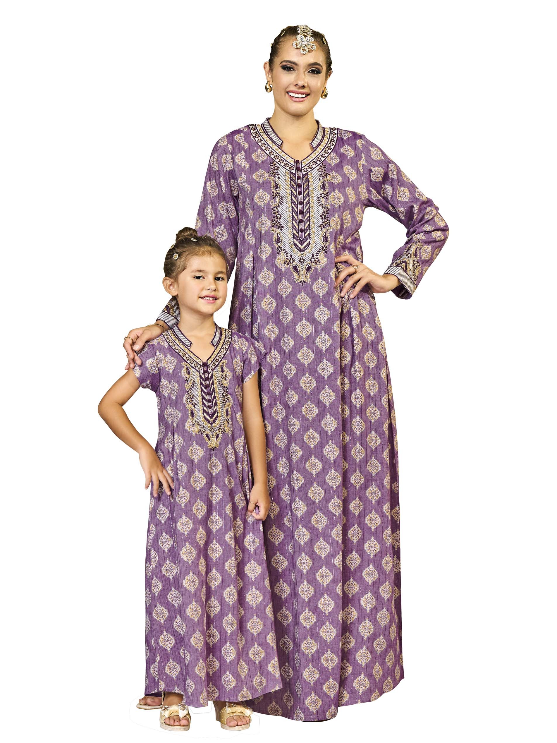 This A-line cotton jalabiya for kids features a gorgeous damask lurex print in a vibrant purple hue, enhanced with playful button detailing. The soft, breathable fabric ensures comfort, while the relaxed silhouette offers ease of movement, making it perfect for warm summer days during Ramadan. A charming and stylish choice for little ones to celebrate the season.