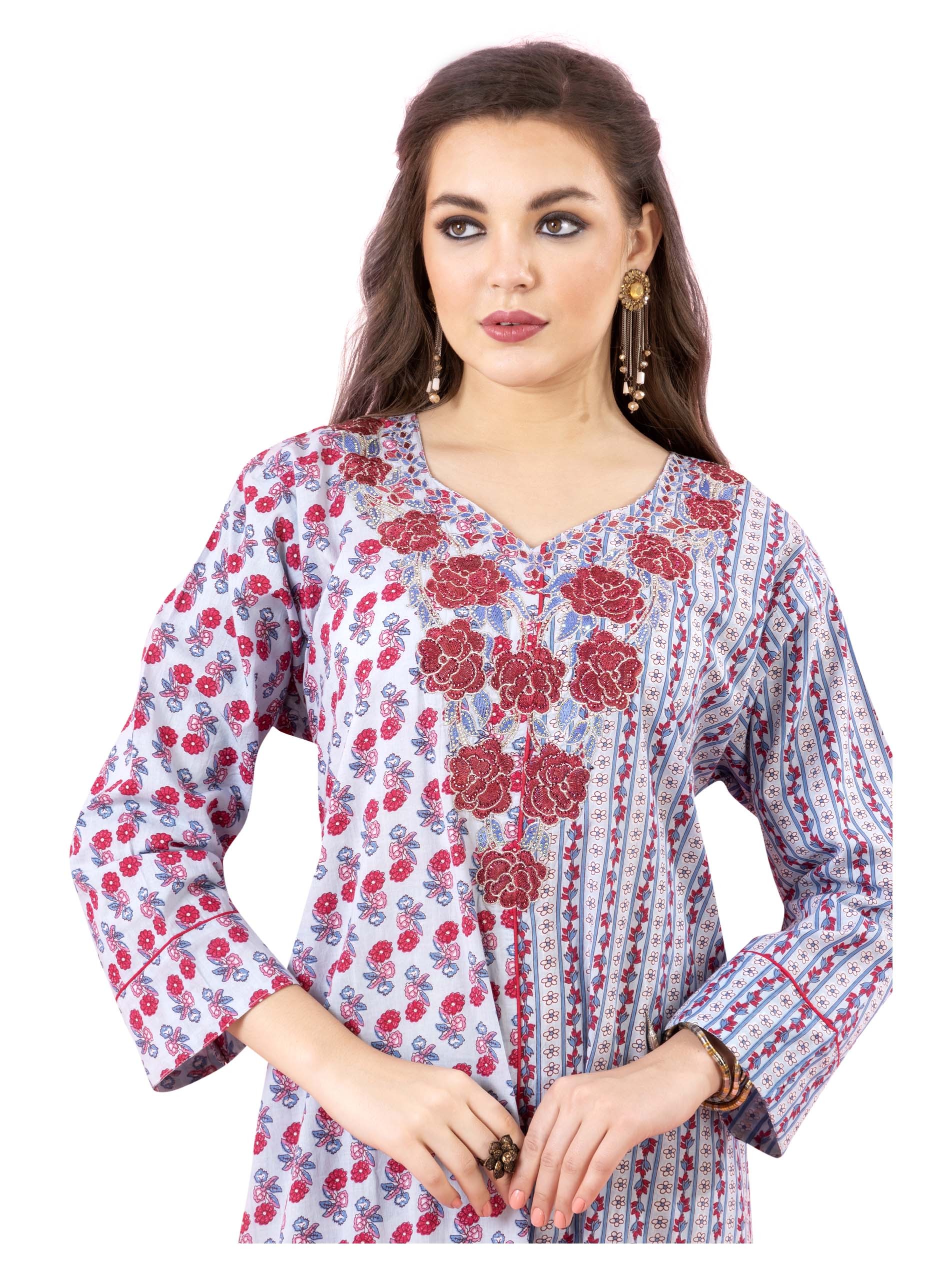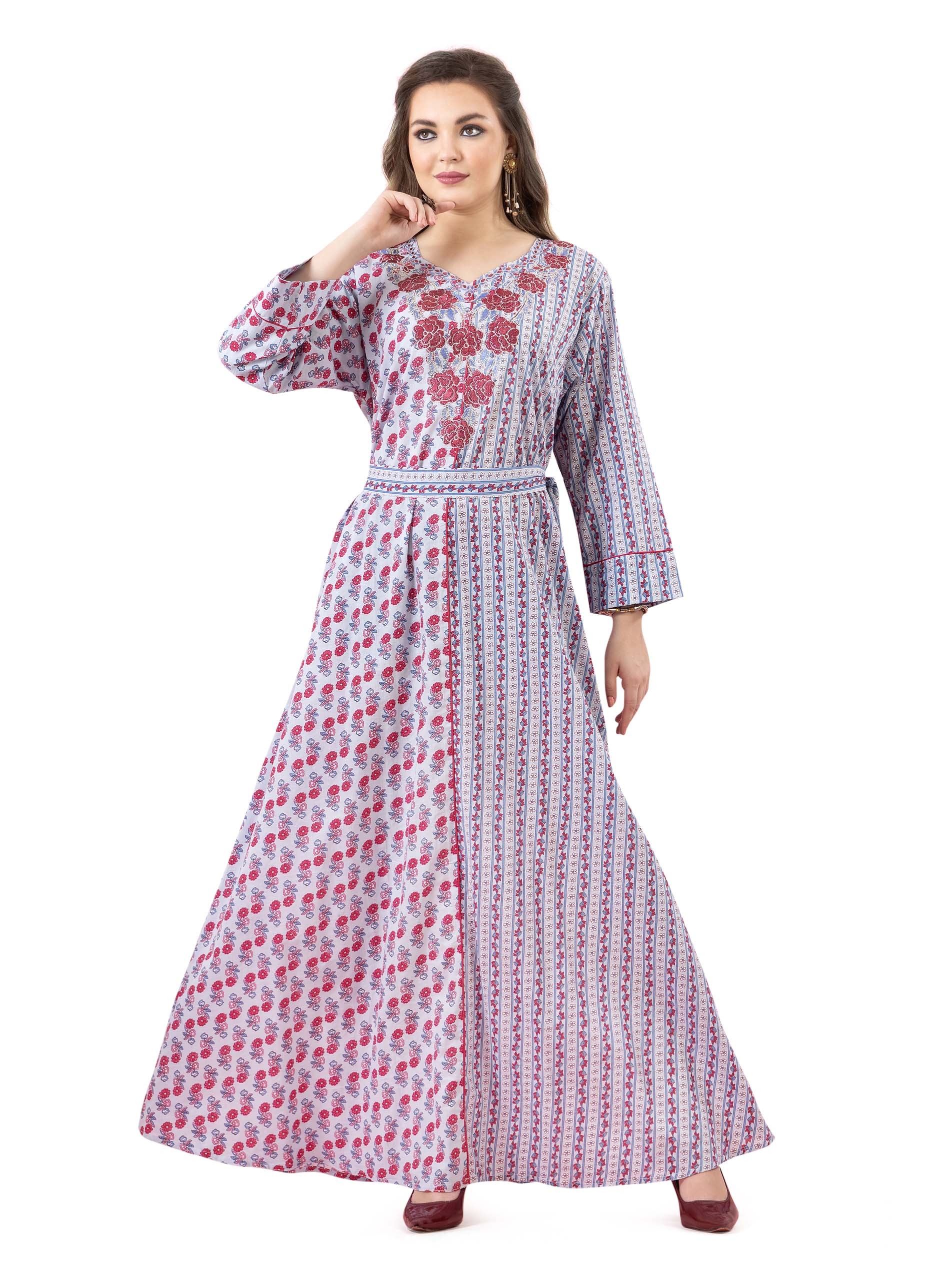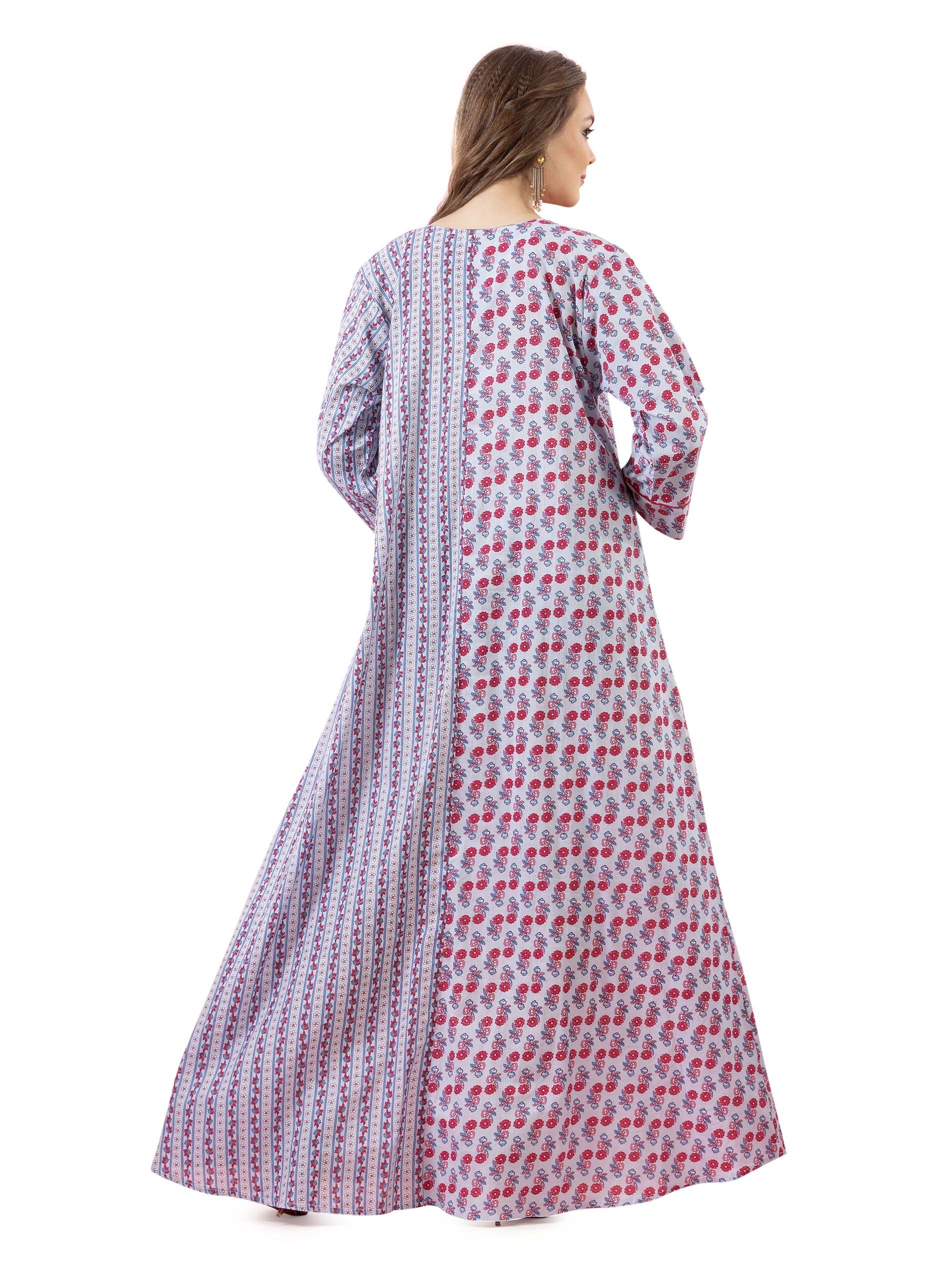 Elevate your style with this distinctive printed jalabiya, designed with two patterns on both sides for a catchy summer look.