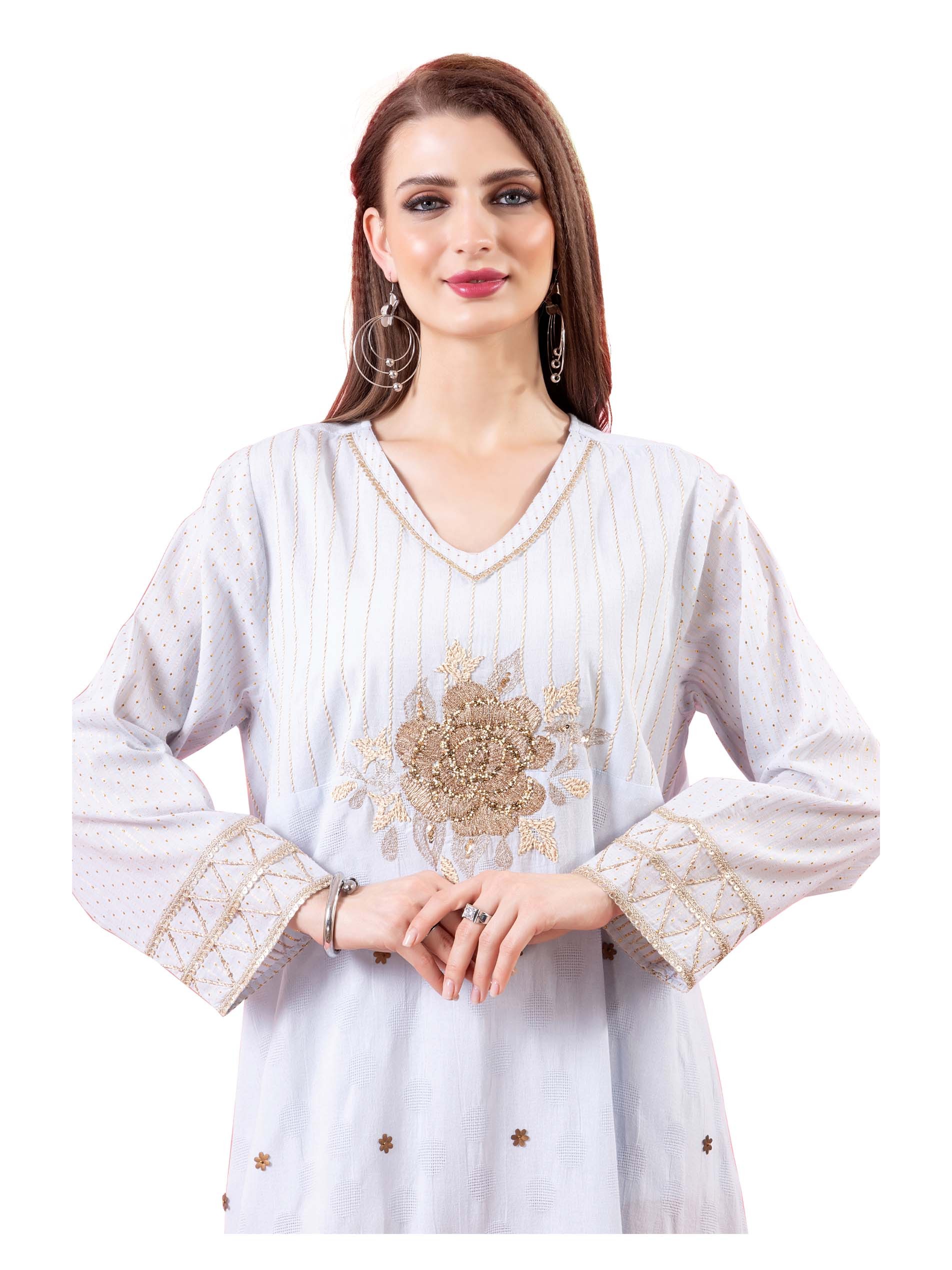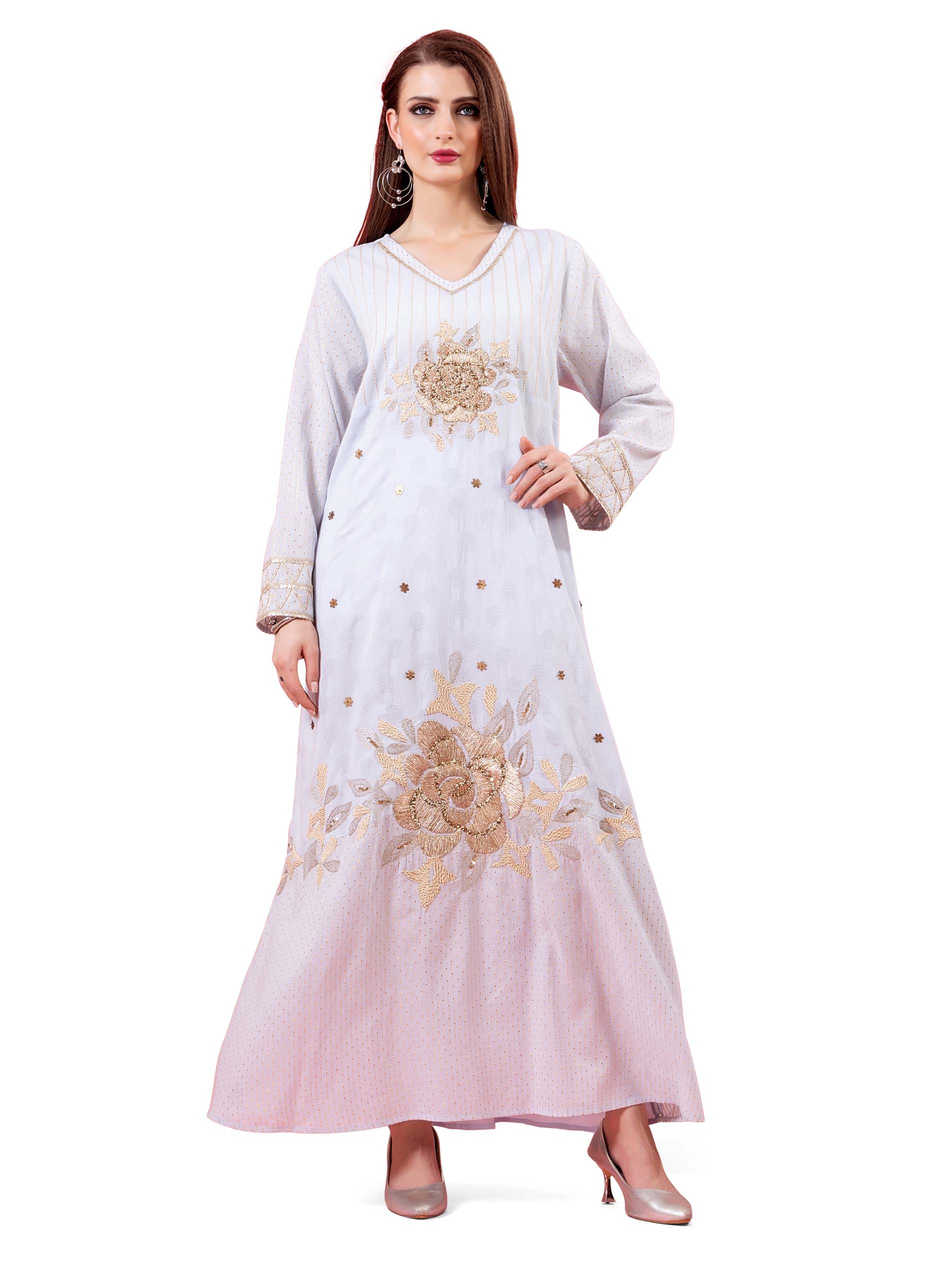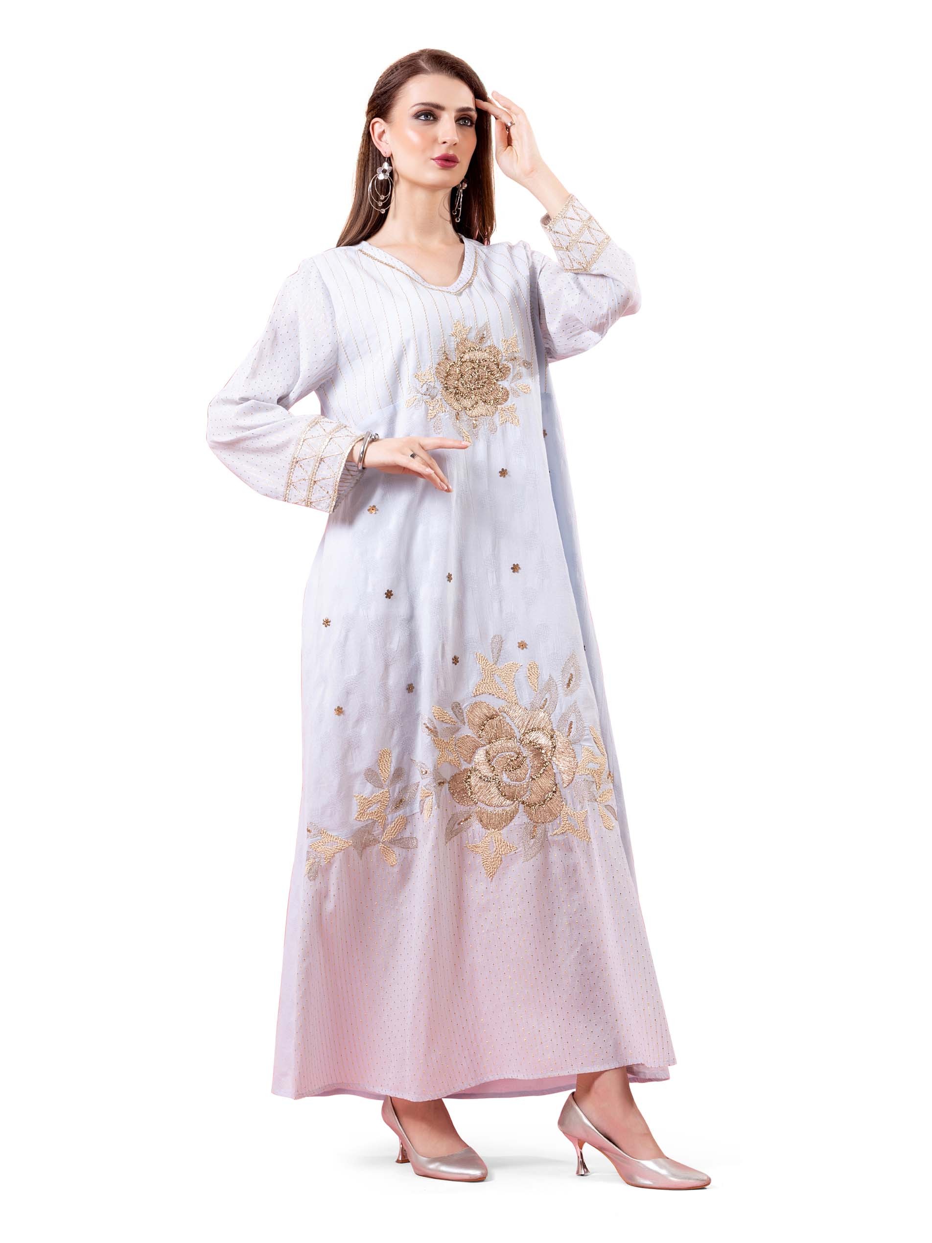 An offwhite long sleeve cotton jalabiya designed with gold floral print to complement its elegance.