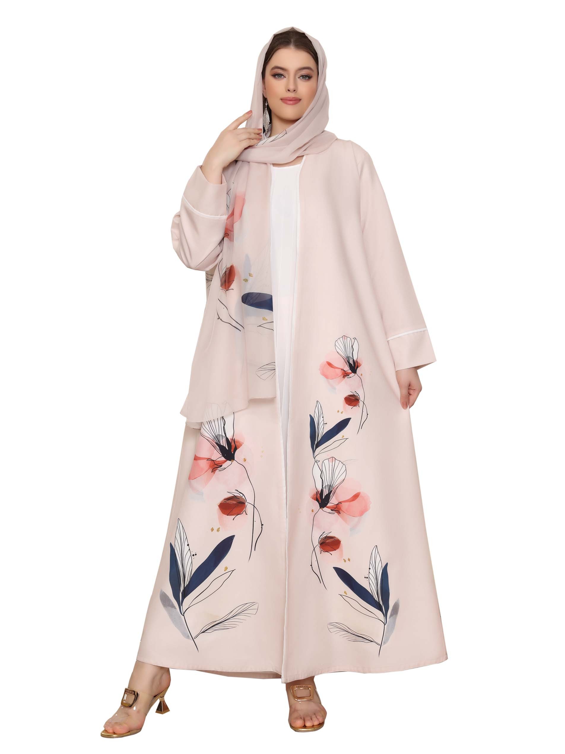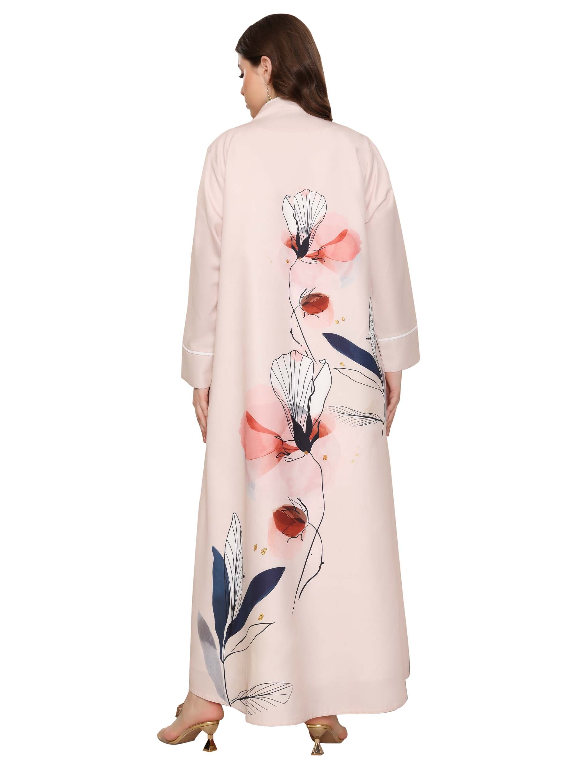 Two piece linen printed A-line abaya, complemented with floral pattern to elevate your style.
