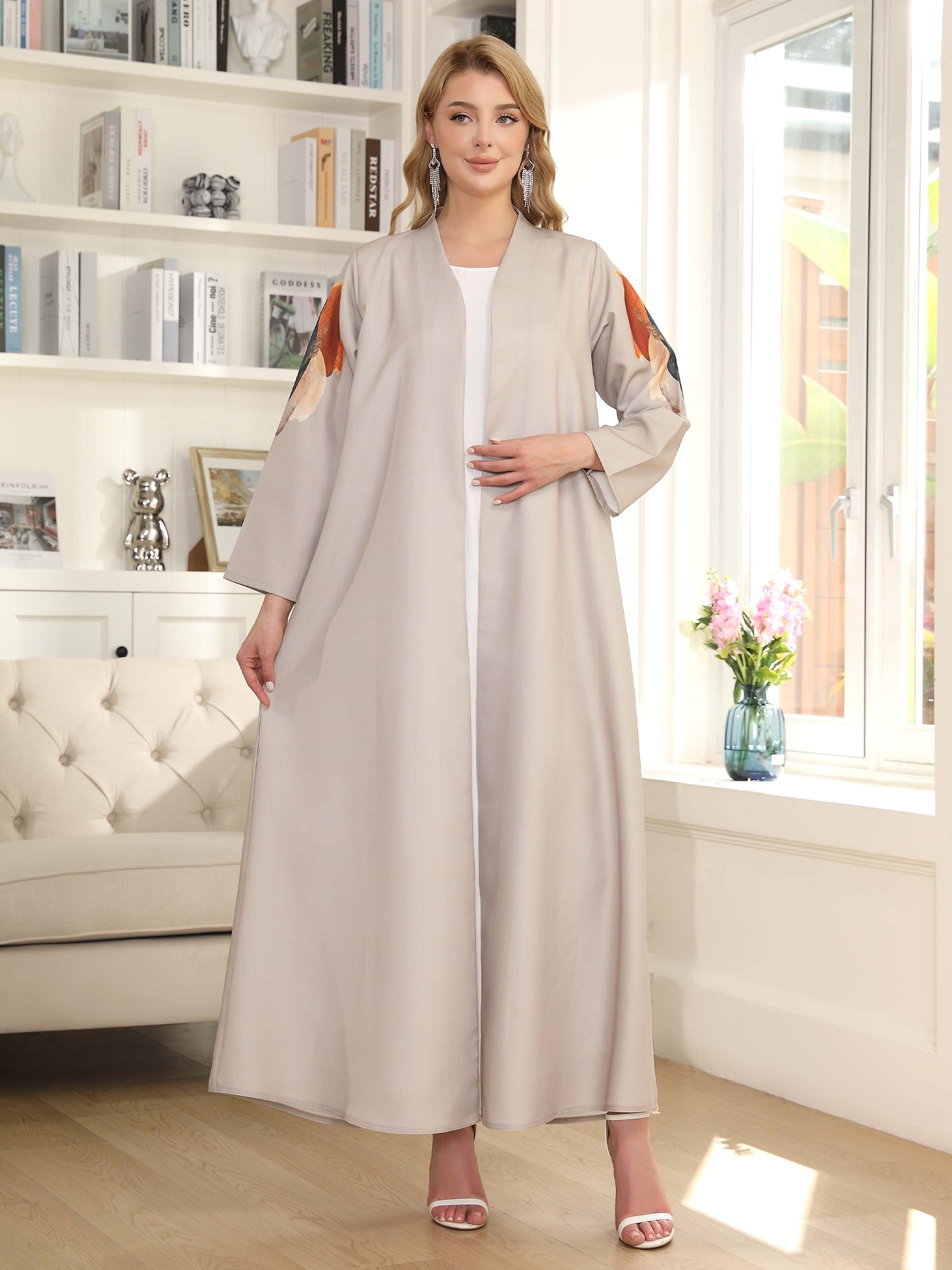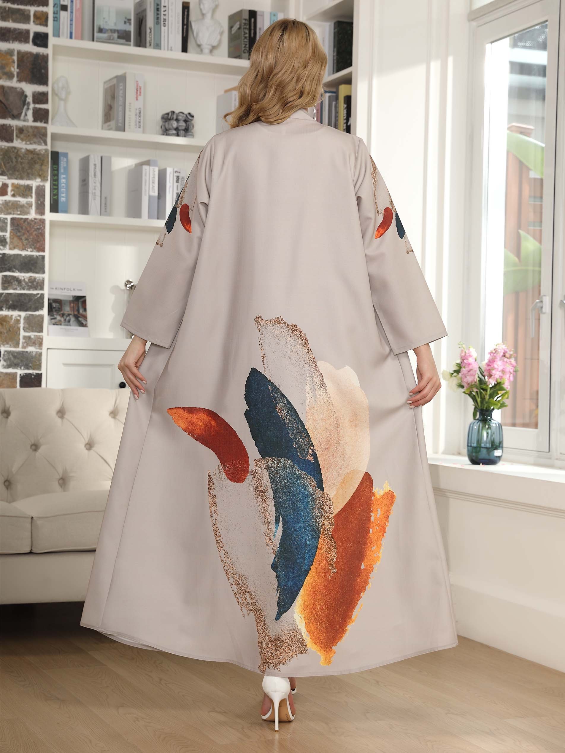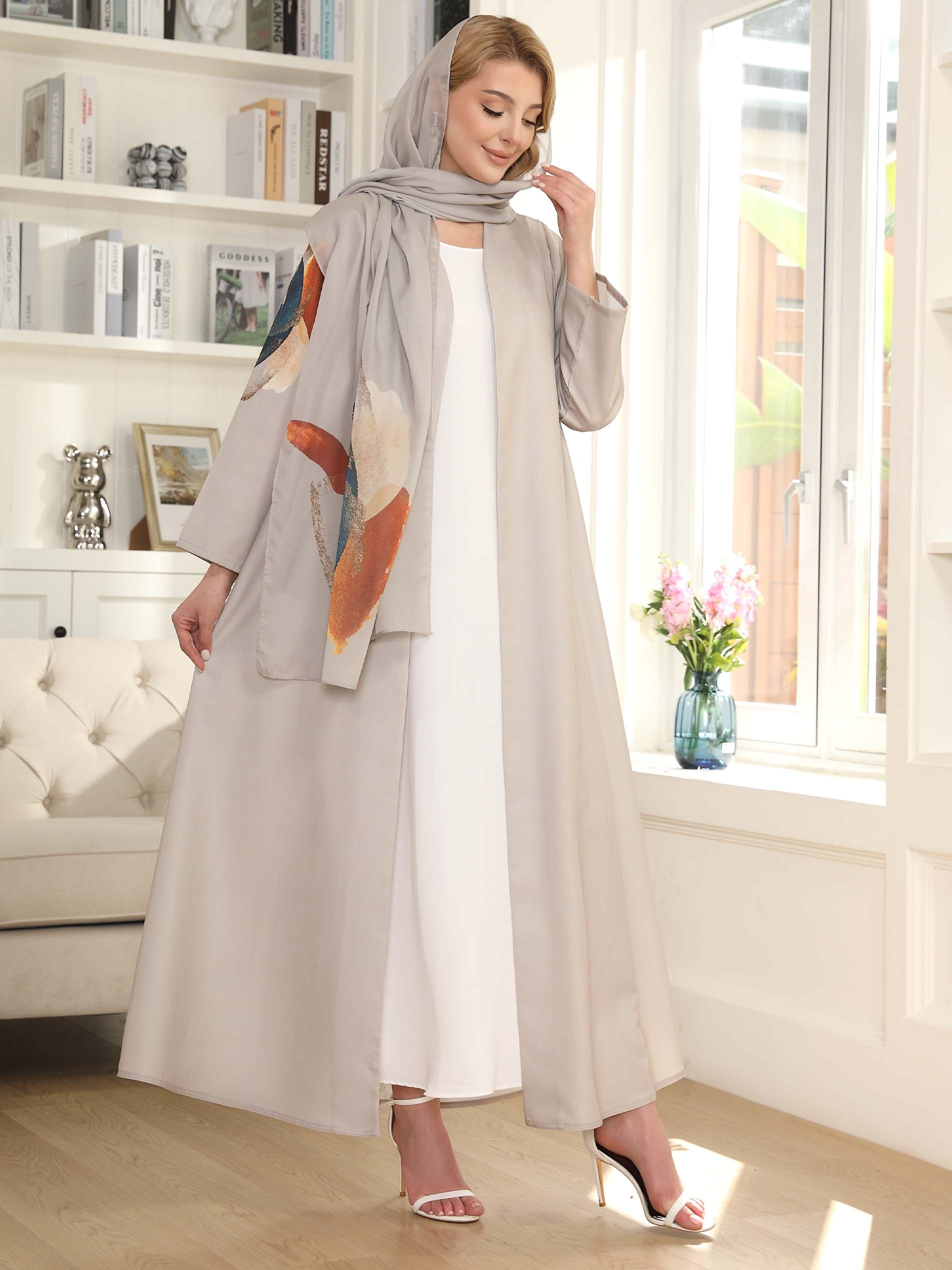 Shine in our gray linen office wear abaya, designed with a distinctive colorful print for a simple yet elegant look at office.