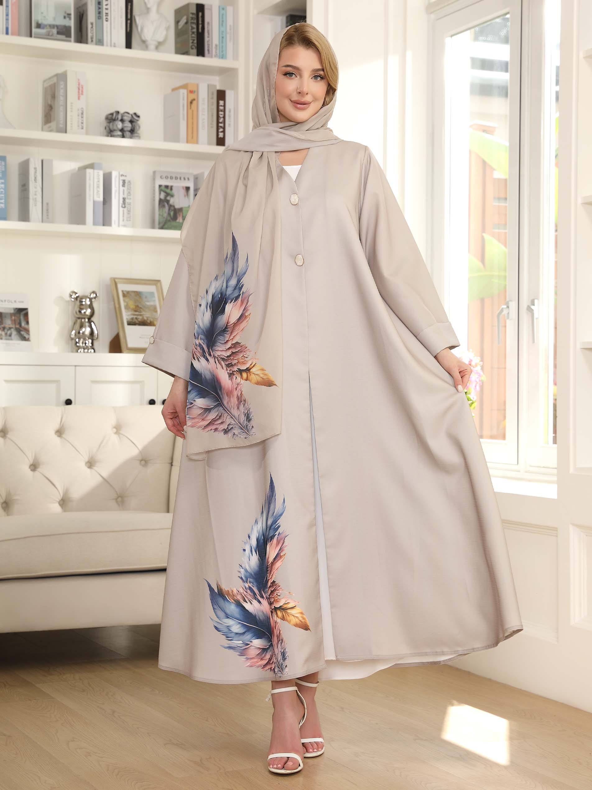 Nothing beats an A-line gray linen abaya, designed with a colorful pattern and front buttons to complete your charm.