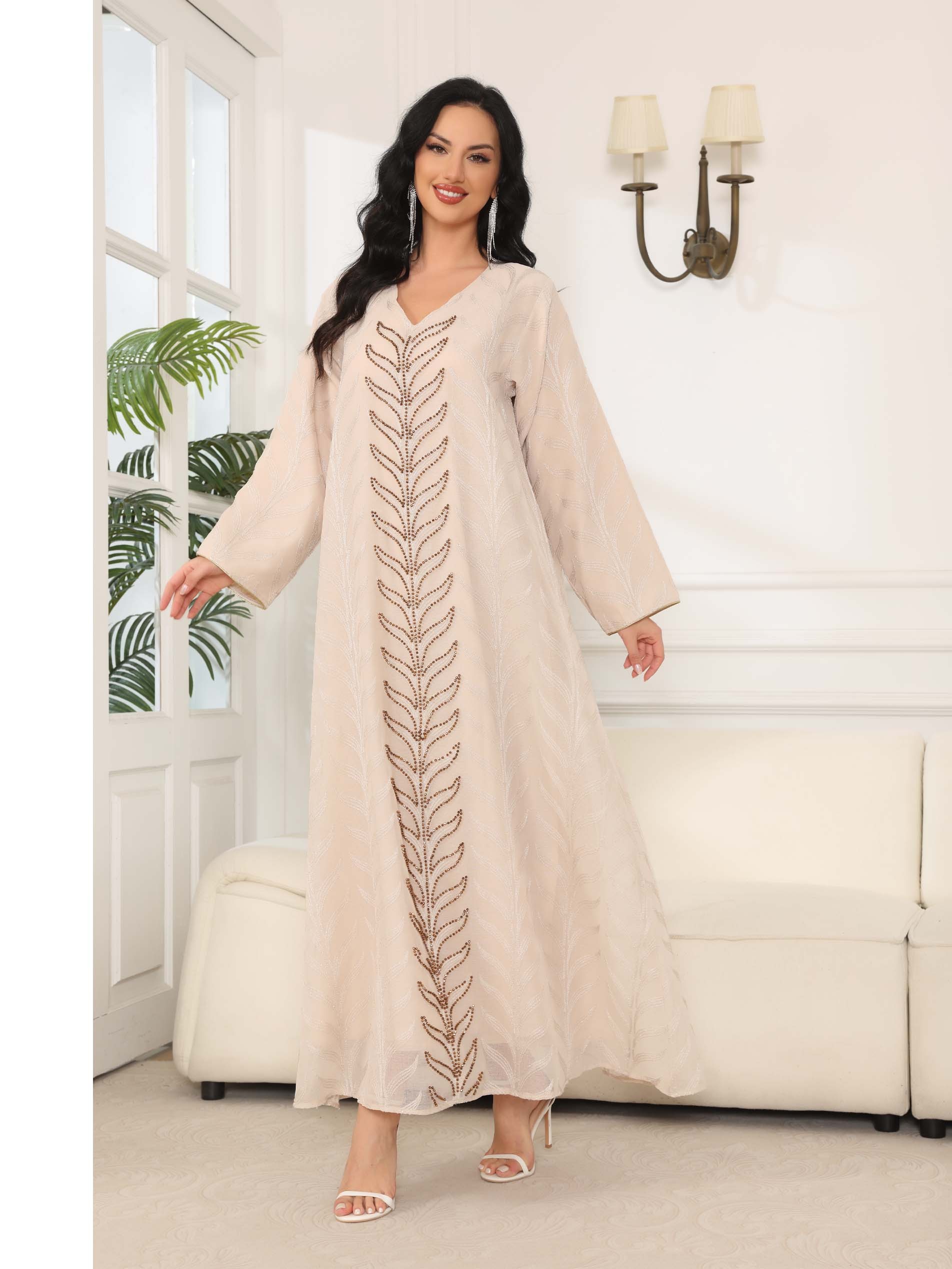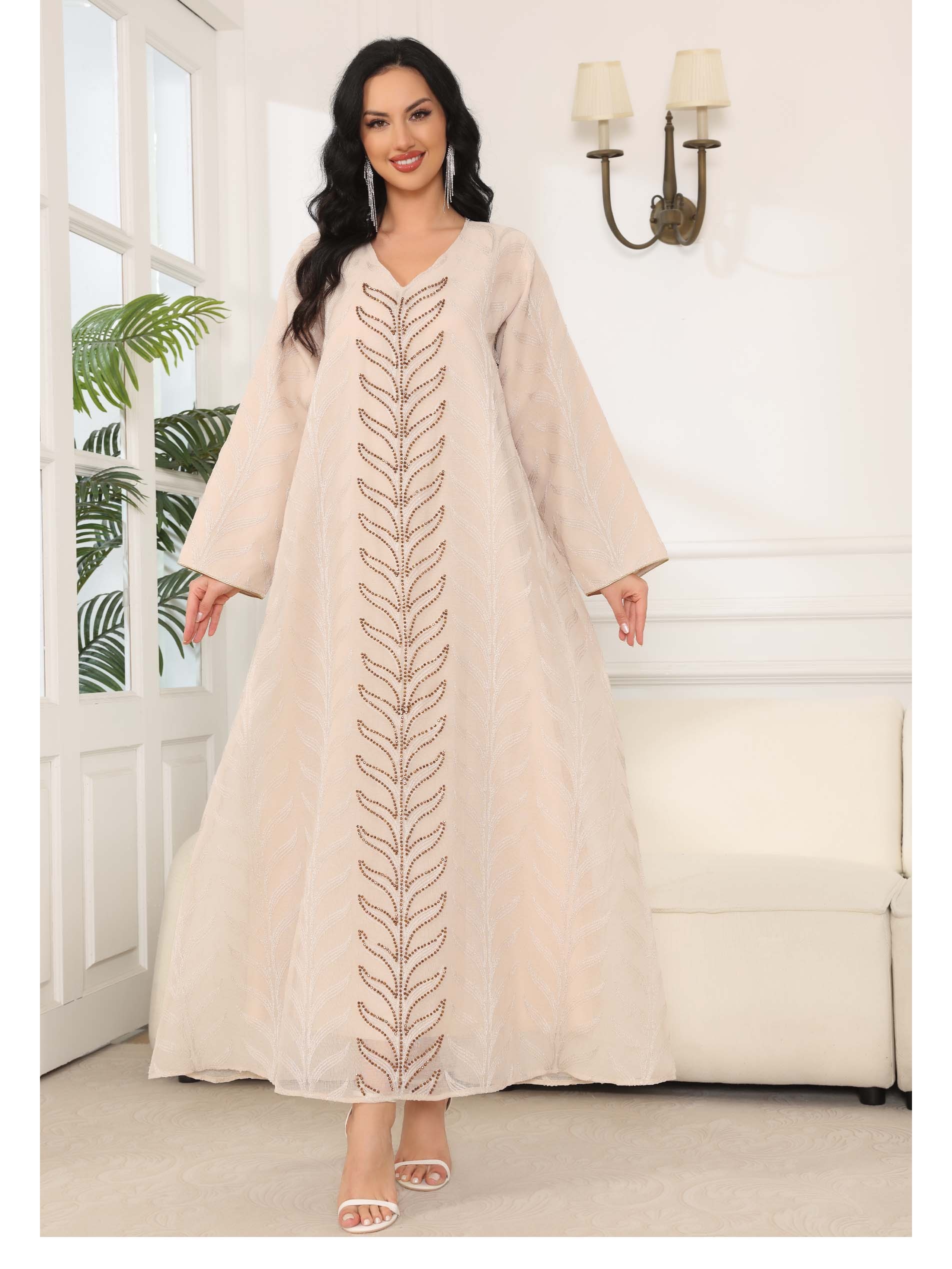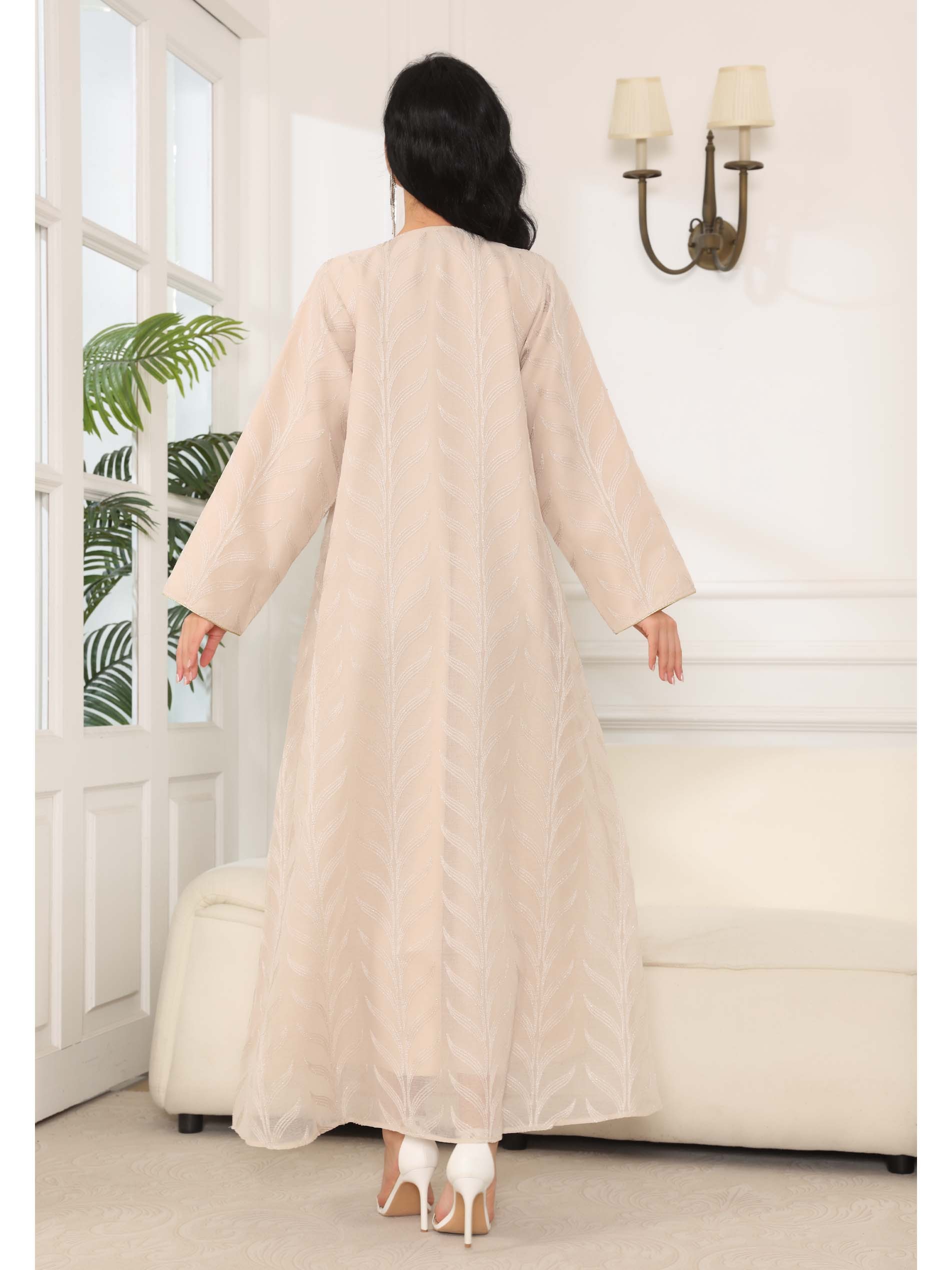 Dazzle in our beautifully offwhite linen embellished jalabiya, perfect for making an unforgattble statement this summer.