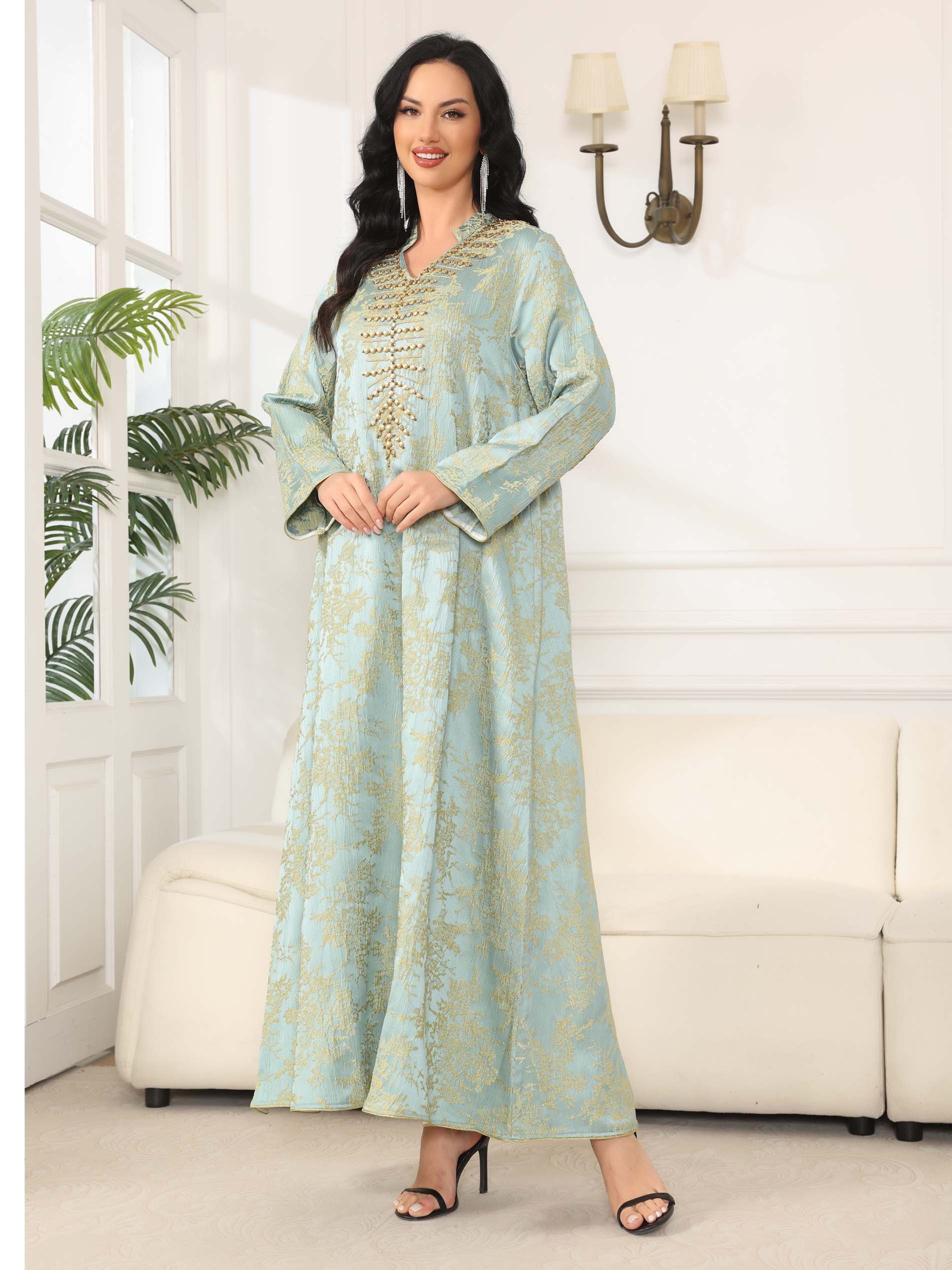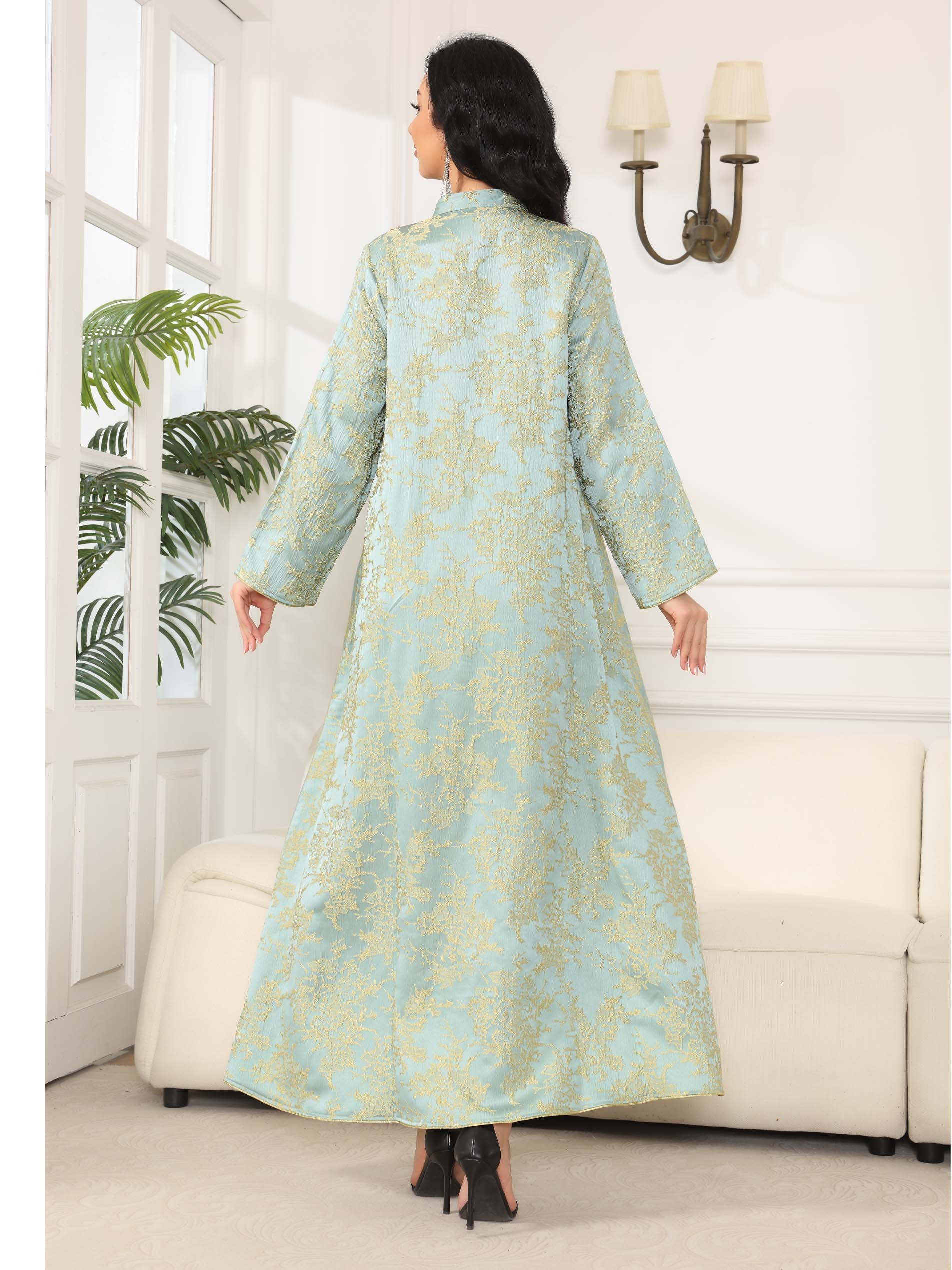 An exquisite light blue jacquard jalabiya, designed with gold embroidery, complemented with chest embolishment for an extraordinary look.