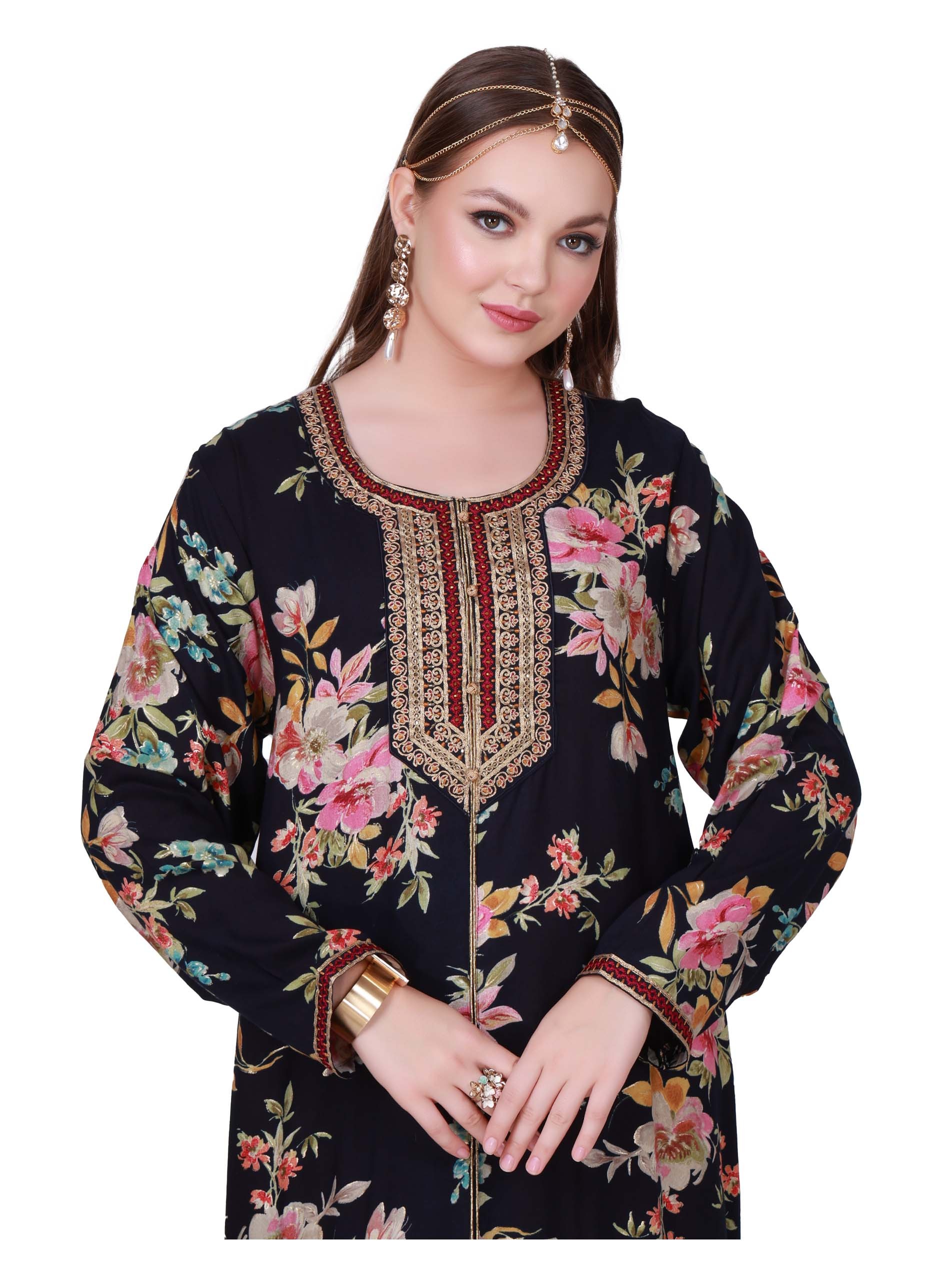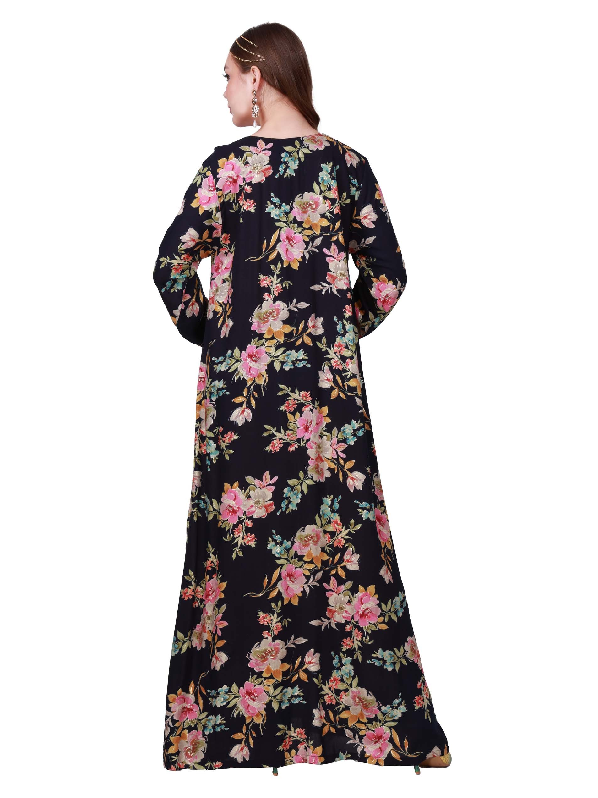 Draped in the elegance of black! Our floral cotton jalabiya, adorned with pink roses, golden beads and delicate embroidery on the chest. It's a stunning choice for summer casual gatherings!