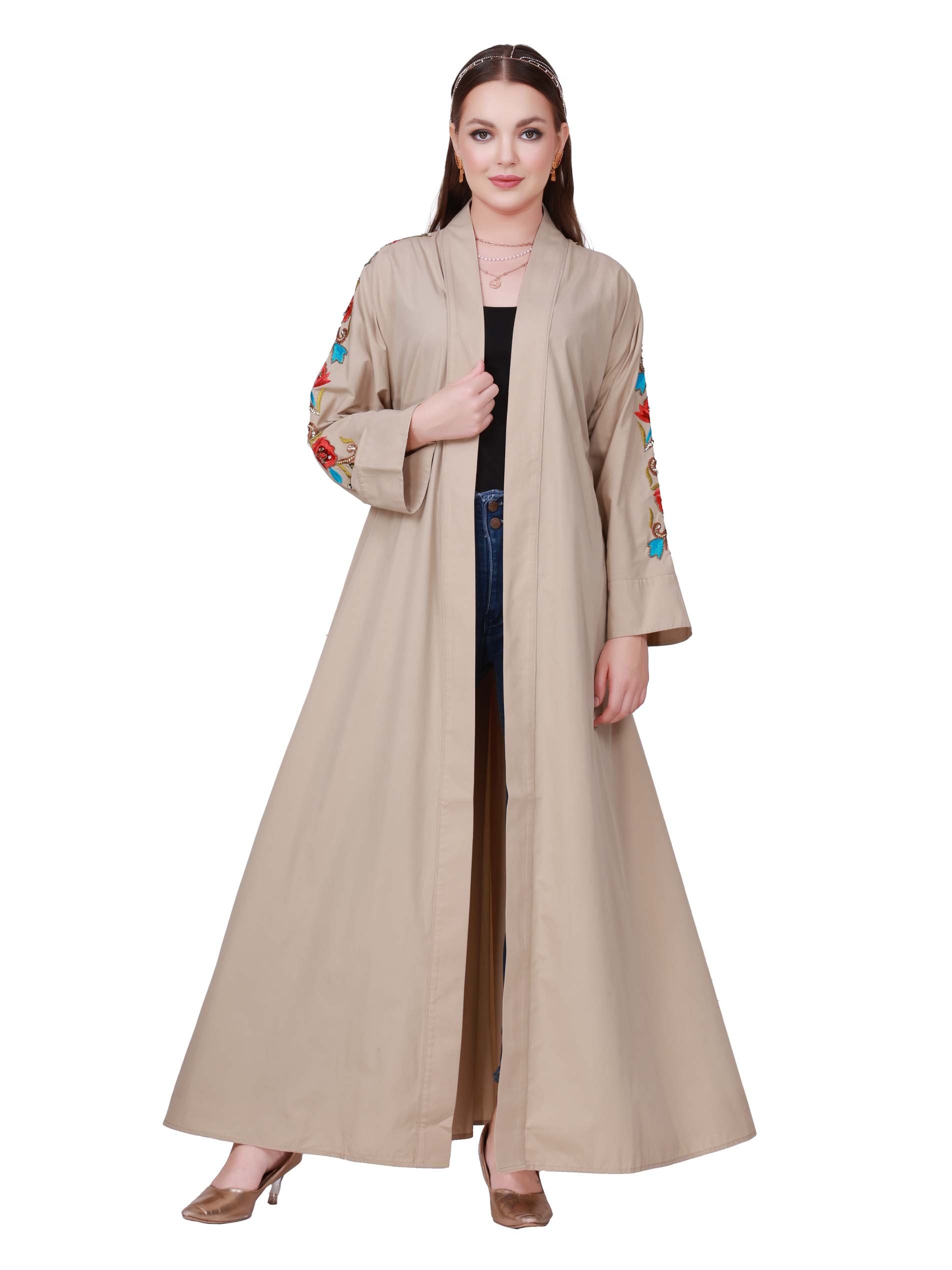 Beige maxi A-line open jalabiya, made of cotton, printed with colorful floral designs on the sleeves for an outstanding party look.