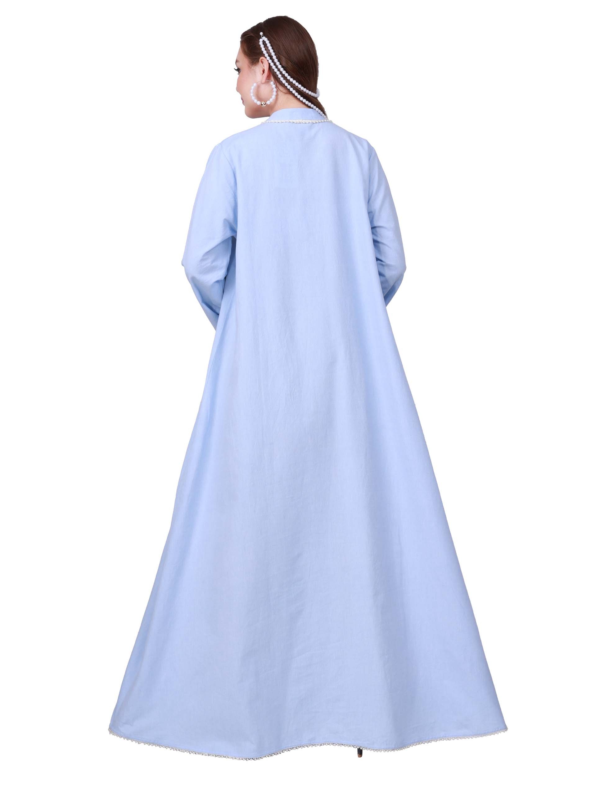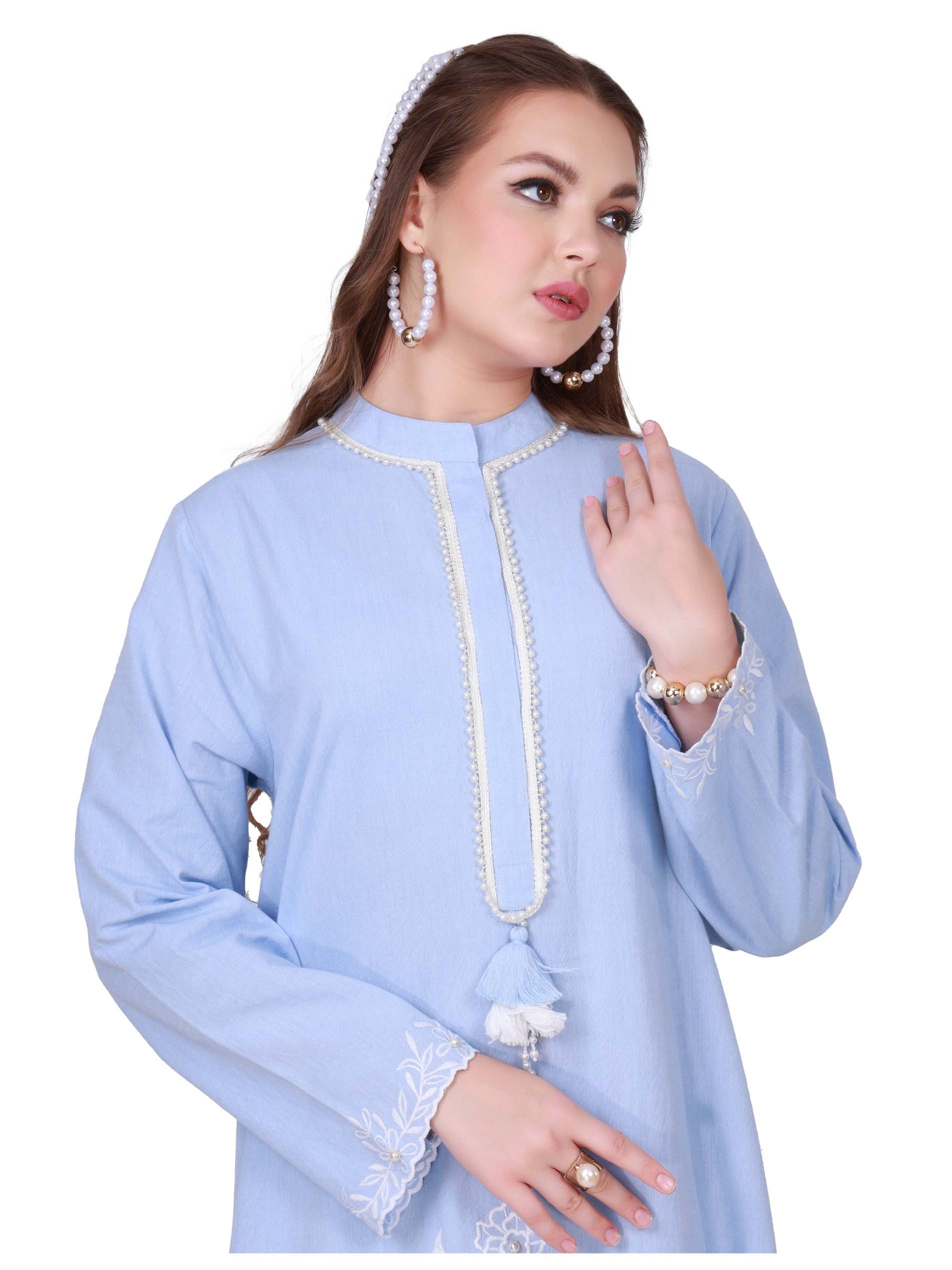 Dipped in baby blue and sprinkled with white floral embroidery. This breezy jalabiya is all about simplicity and effortless charm in festive occassions!