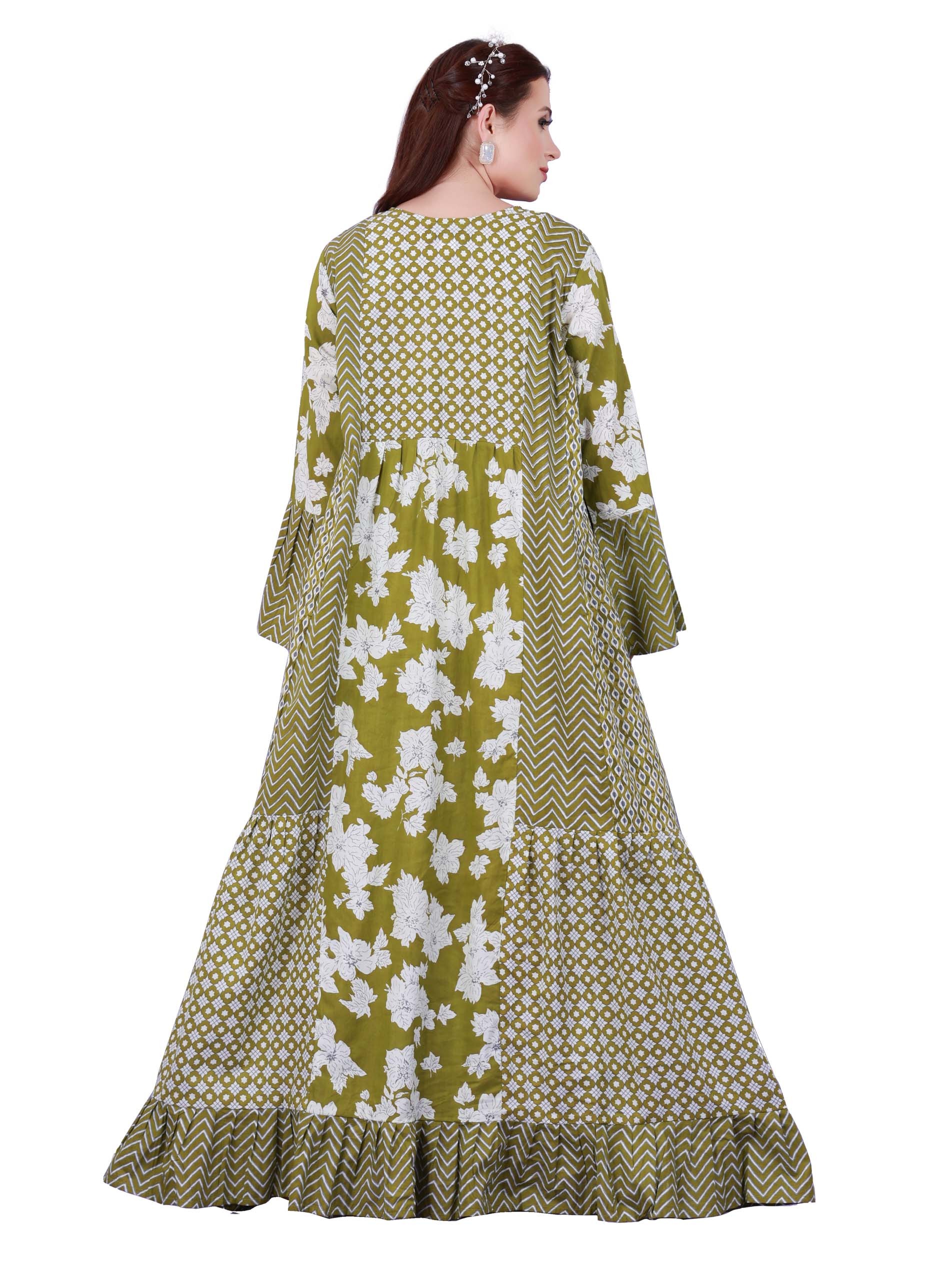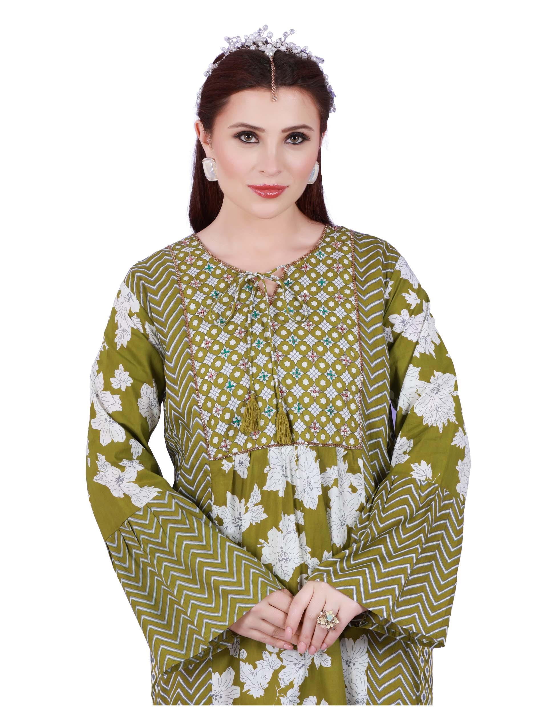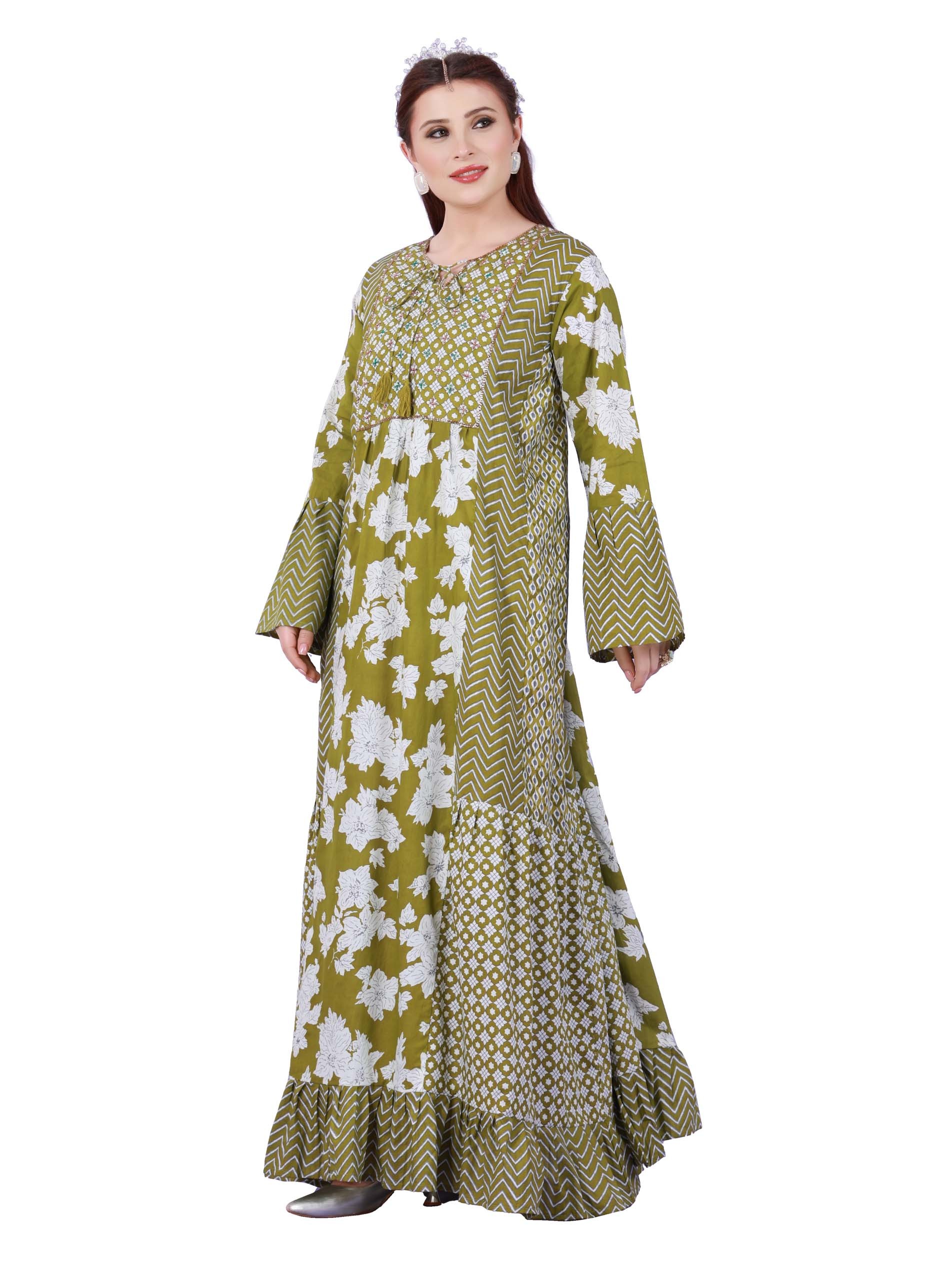 Our green cotton jalabiya is a perfect choice for parties with its diversified white patterns and tie details on the waist to give you a classy look.