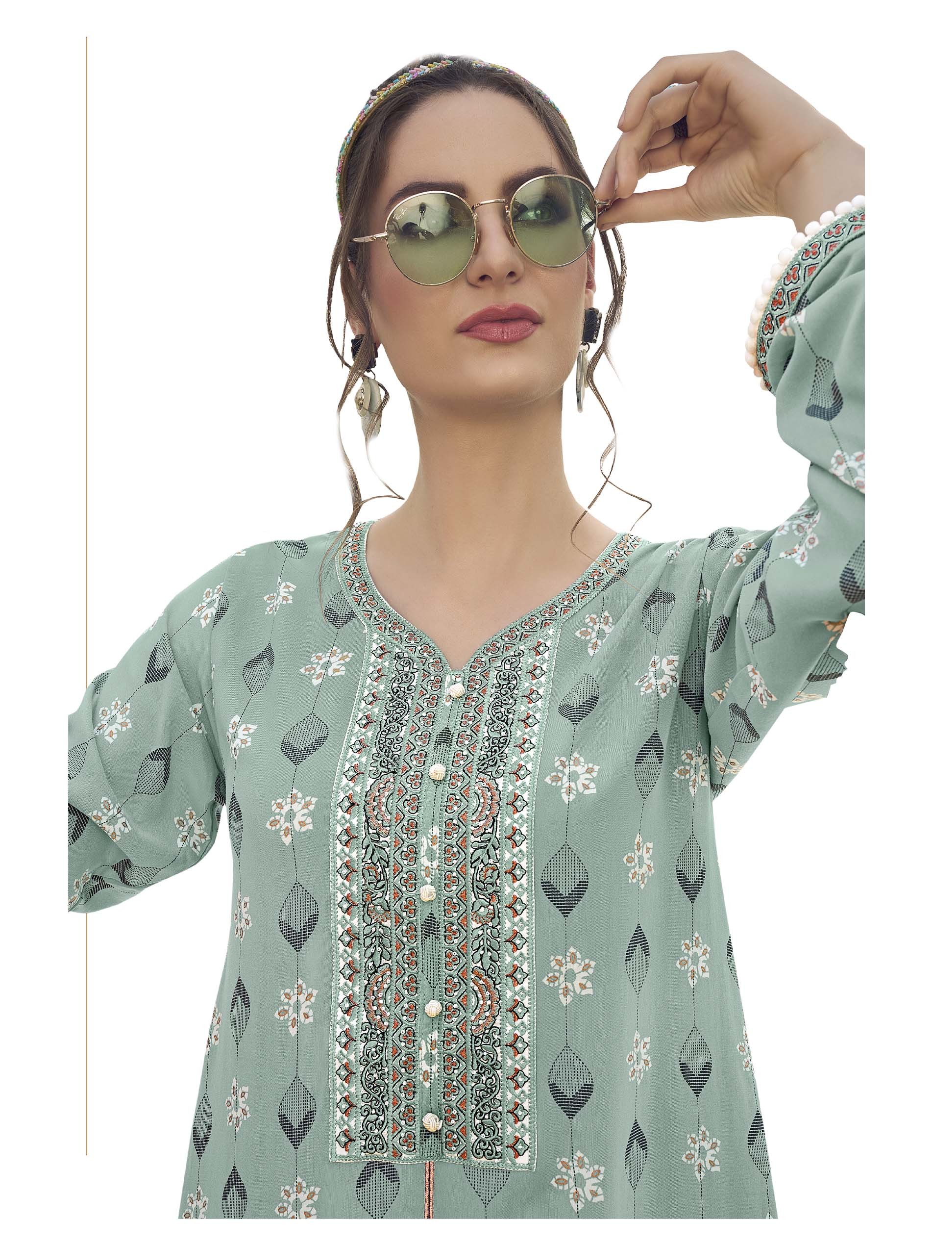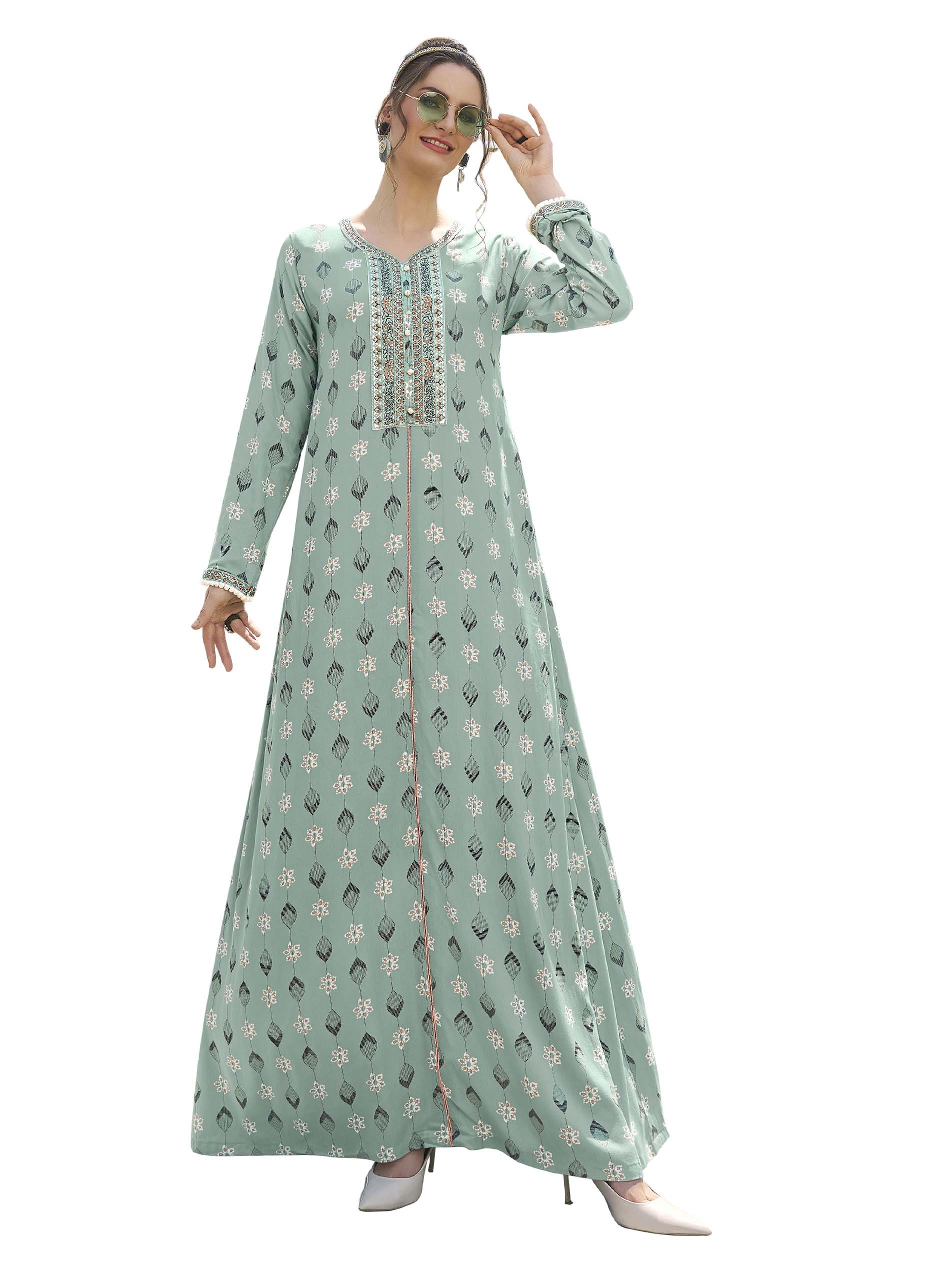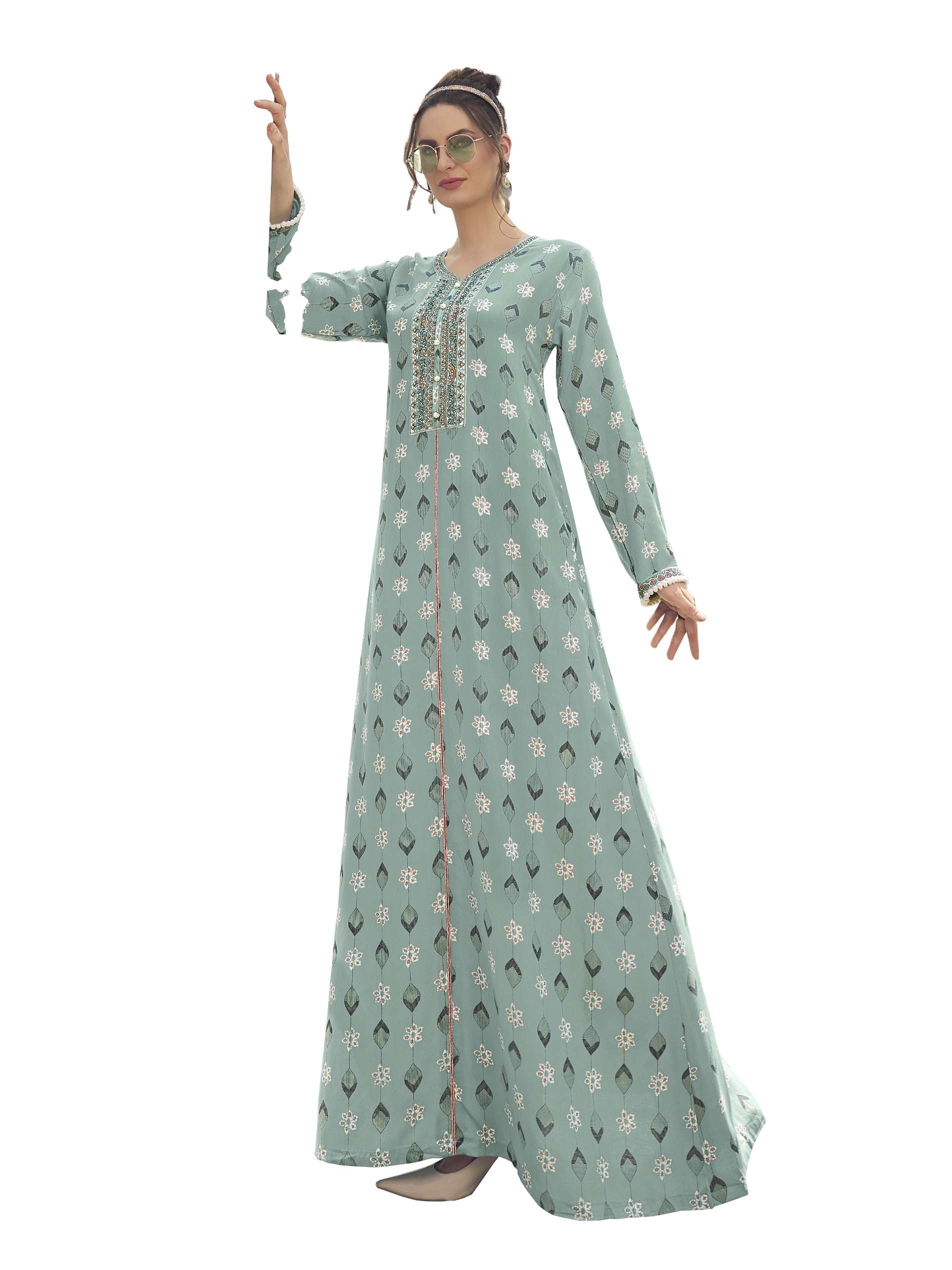 Steal the spotlight with your distinctive summer look and wear a gray jalabiya, designed with white floral and leaf patterns, complemented with long sleeves and embroidery on the chest.