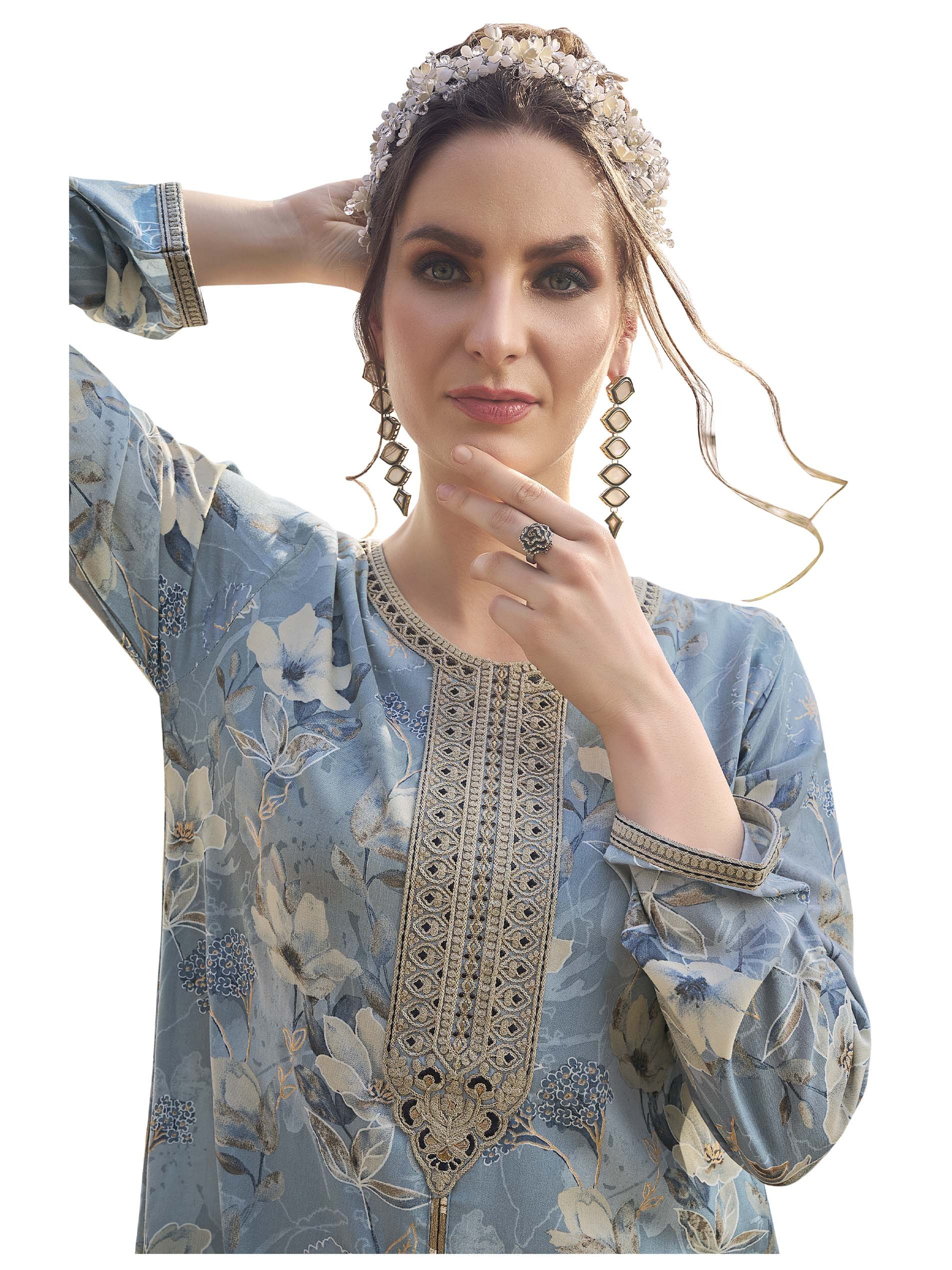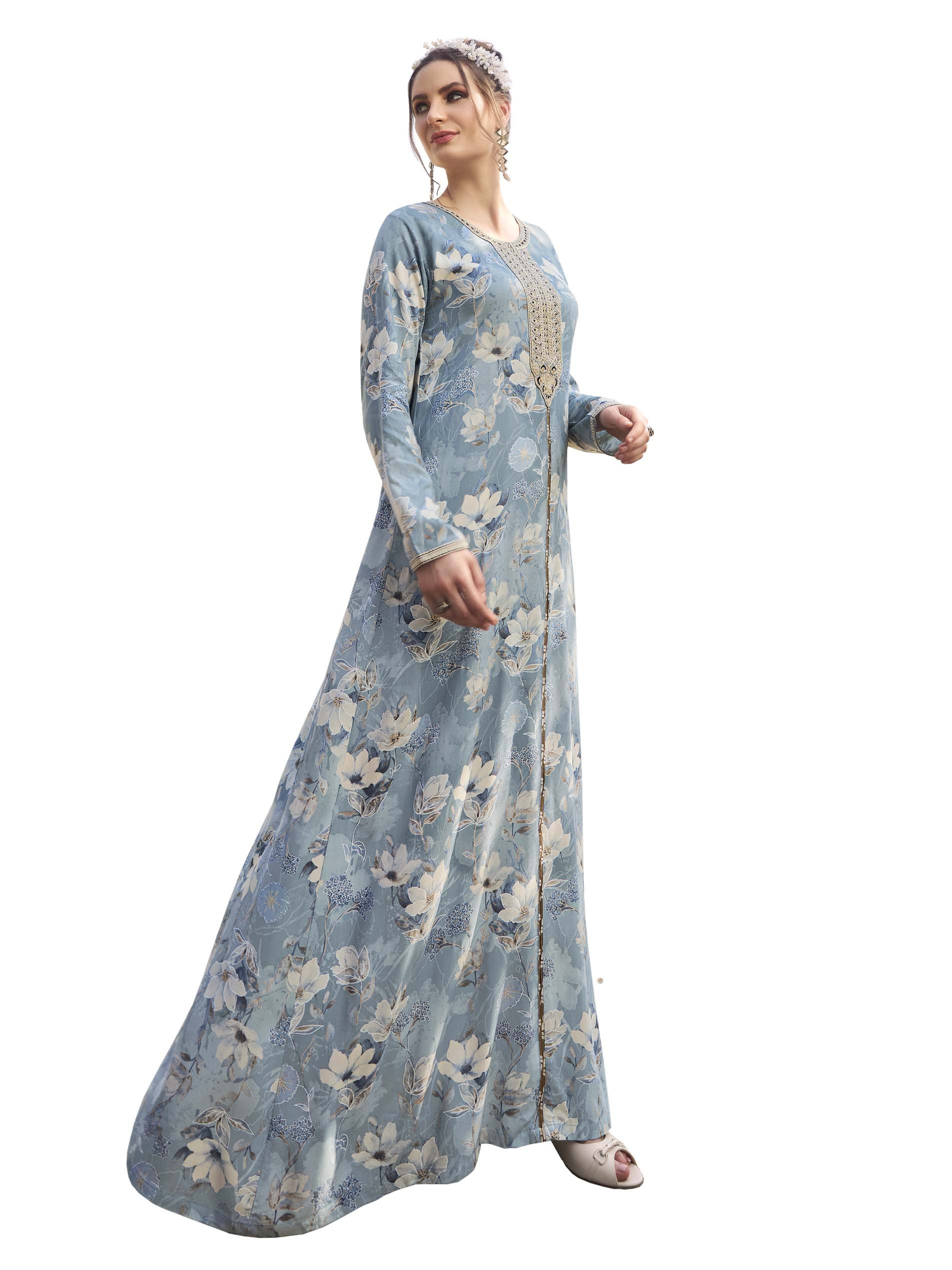 Blue rayon jalabiya, designed with white floral print, long sleeves and gold embroidery on the chest.