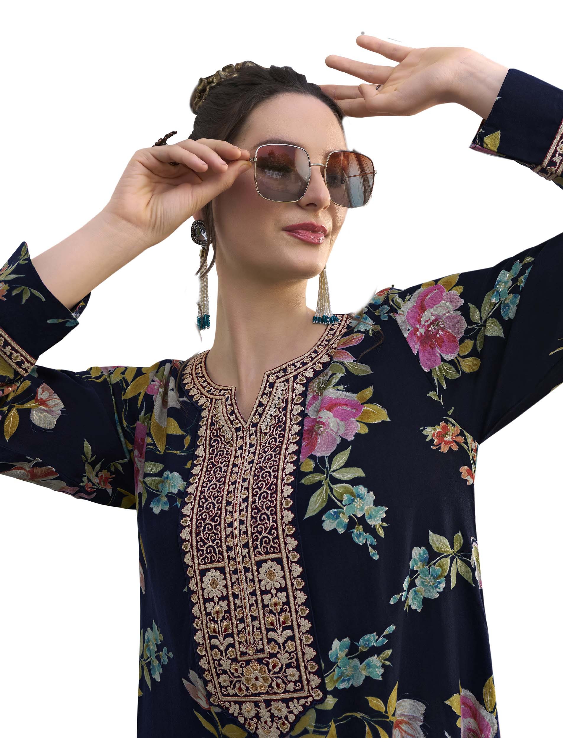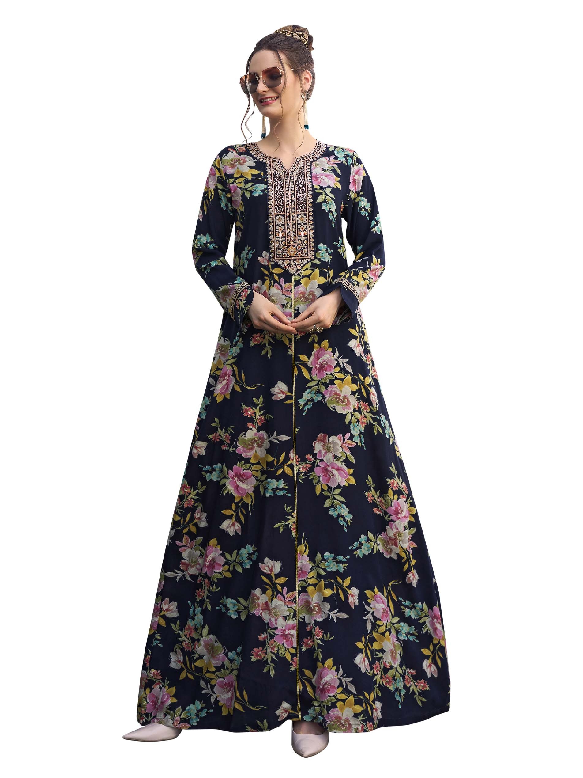 Navy blue rayon jalabiya, designed with blue & purple floral print and gold embroidery on the chest.