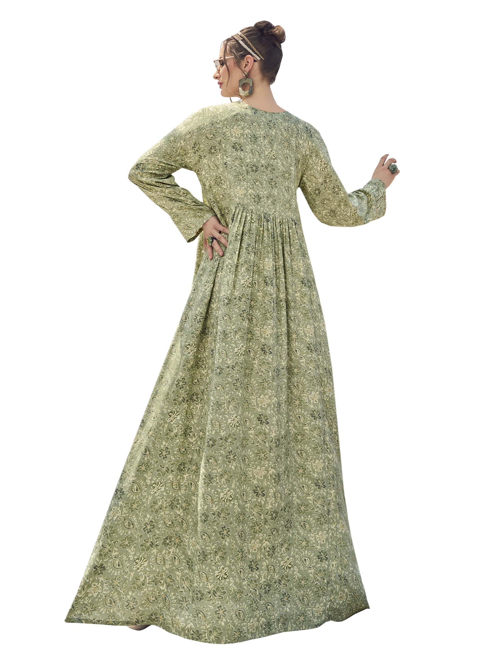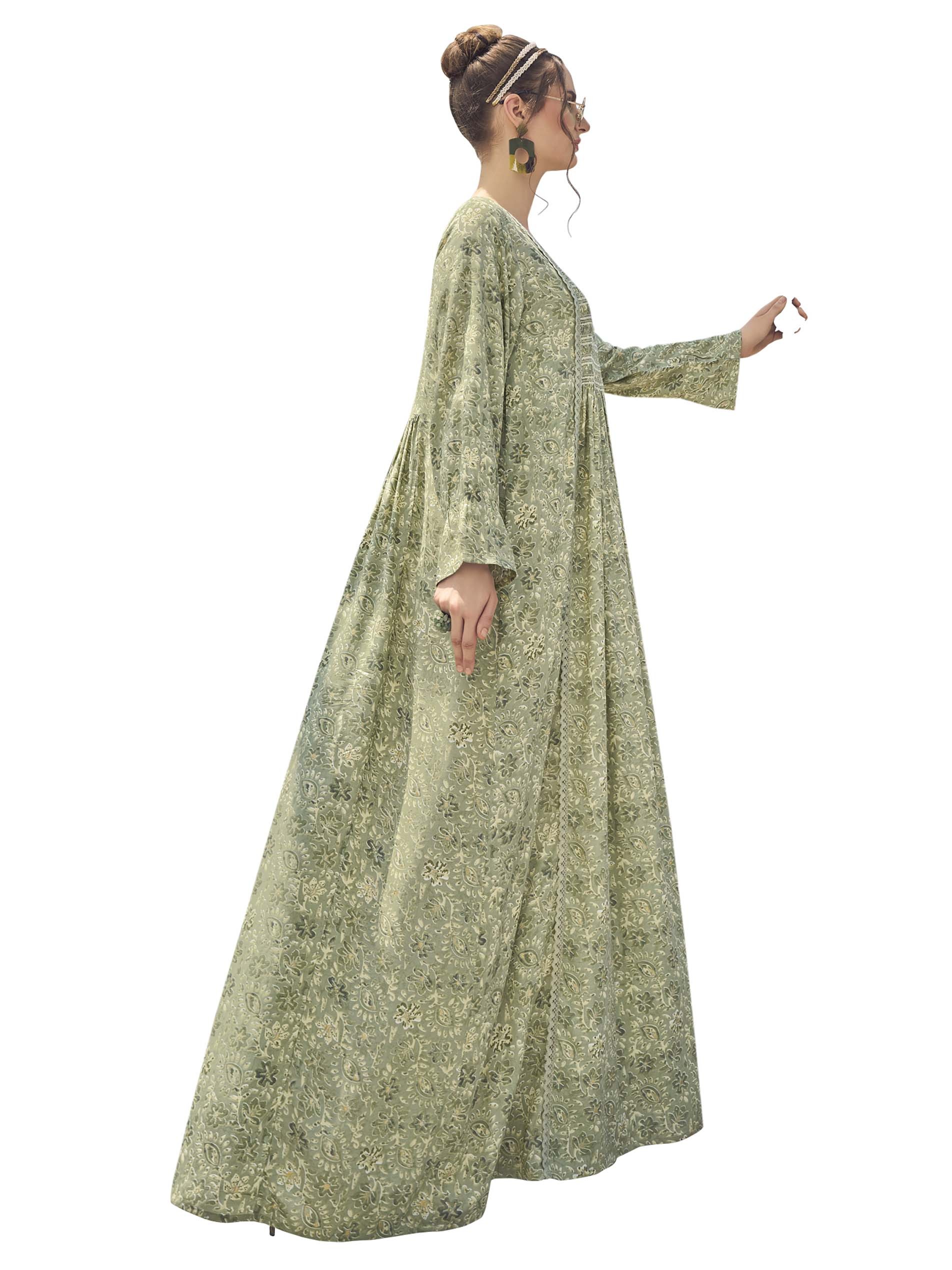 A light gray rayon jalabiya, designed with a floral and leaf print and complemented with a distinctive print on the chest.
