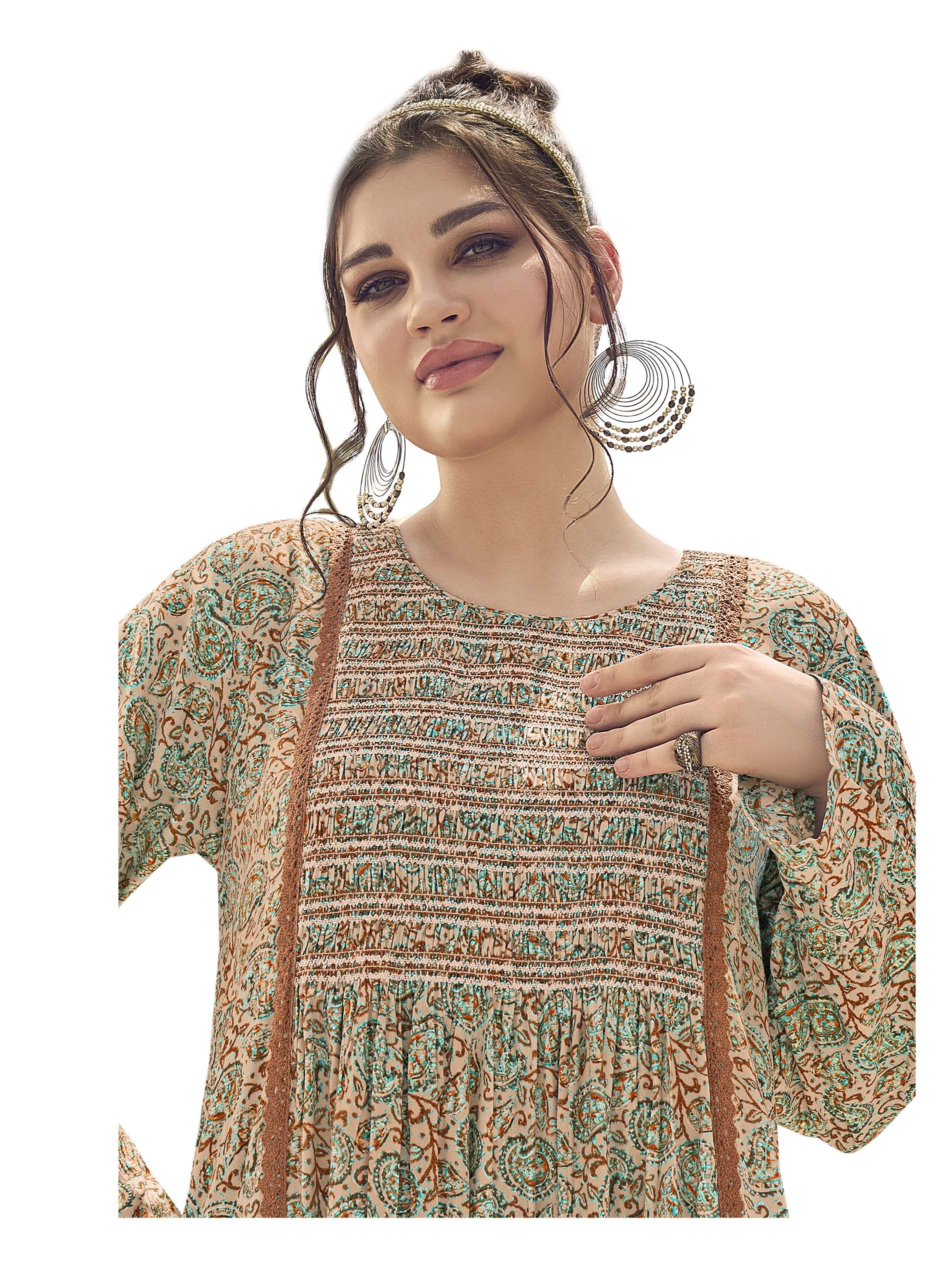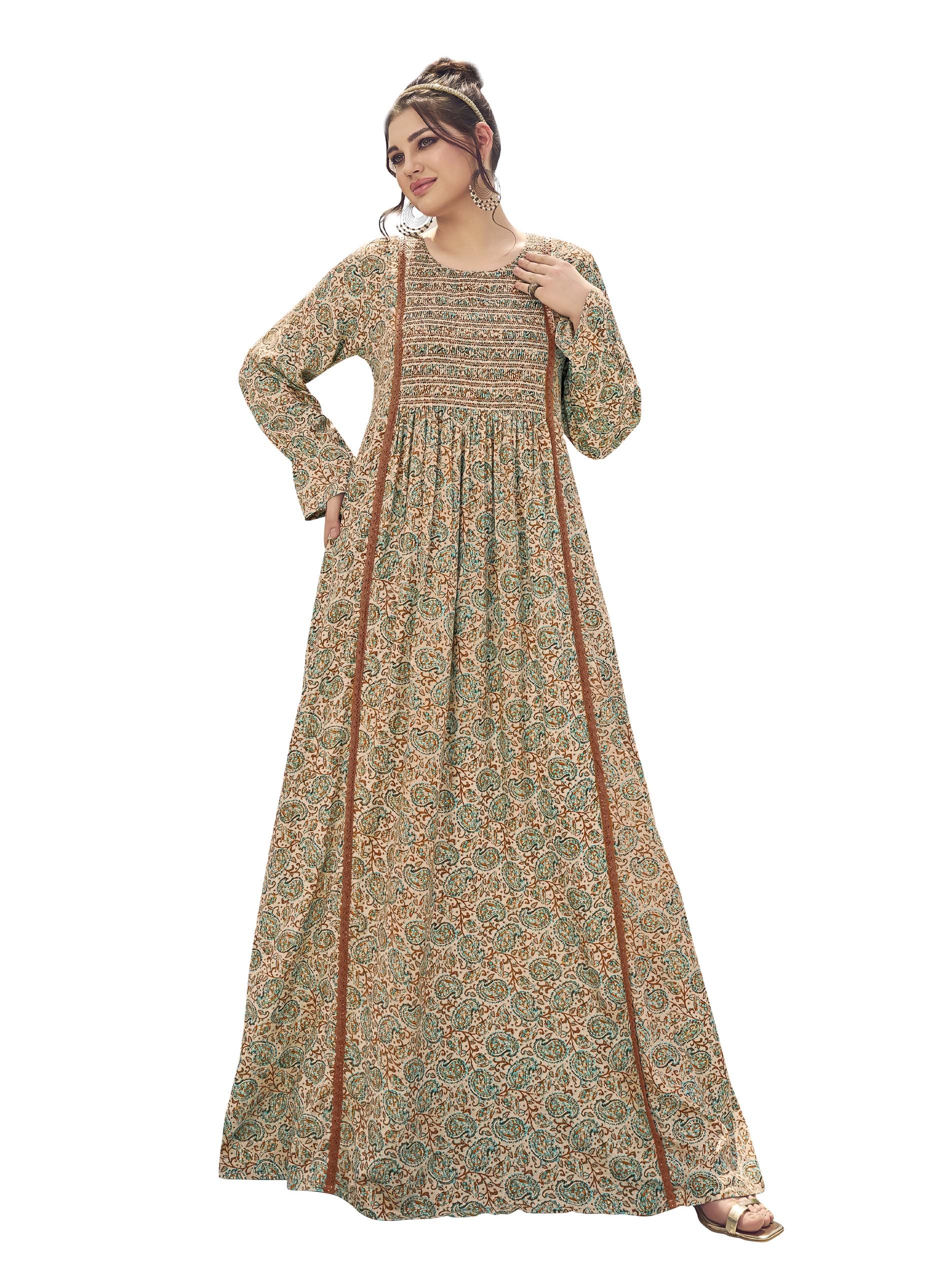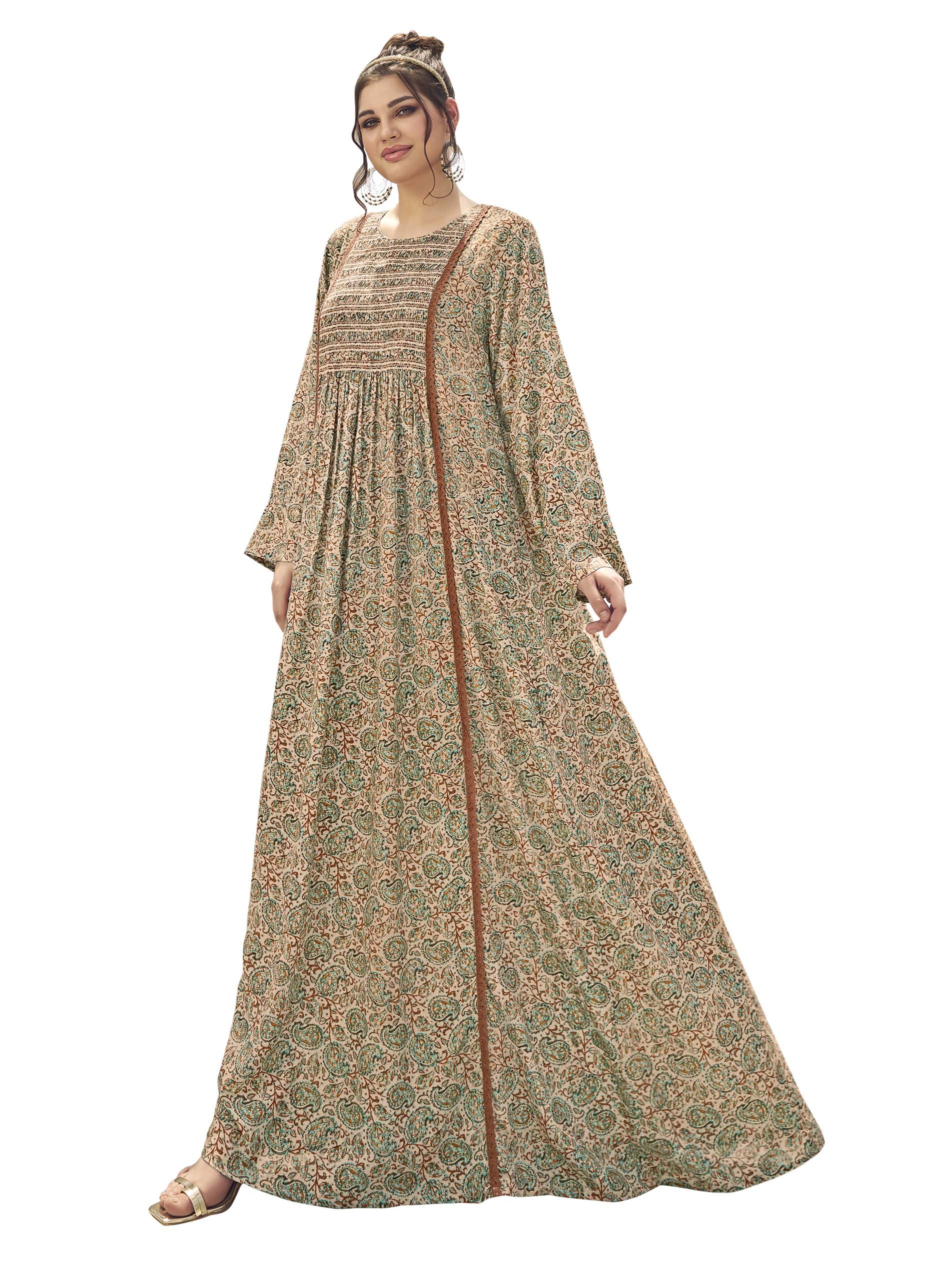 Shine in a printed rayon jalabiya that comes with brown and blue colors, complemented with long sleeves and a rounded neck.