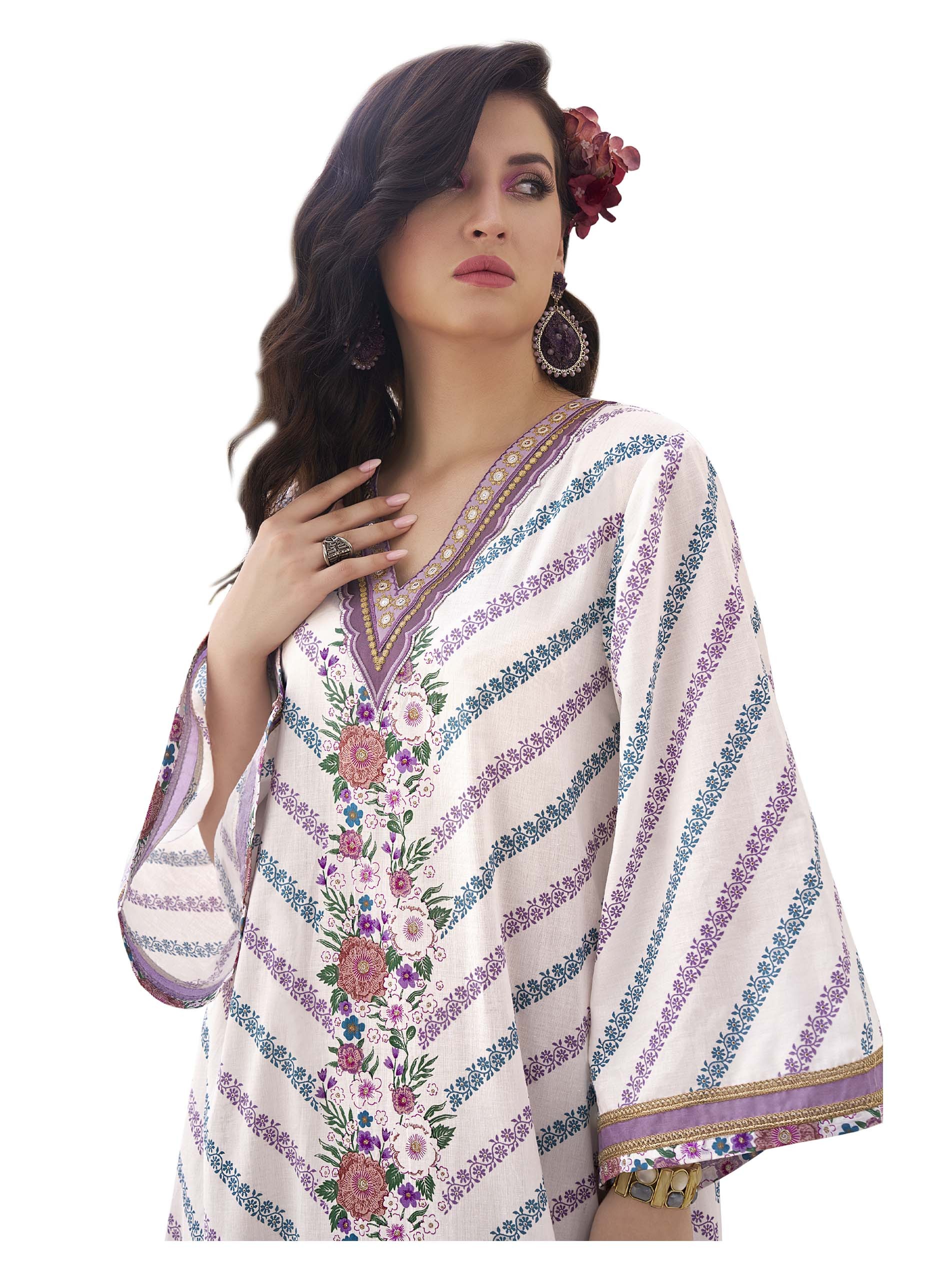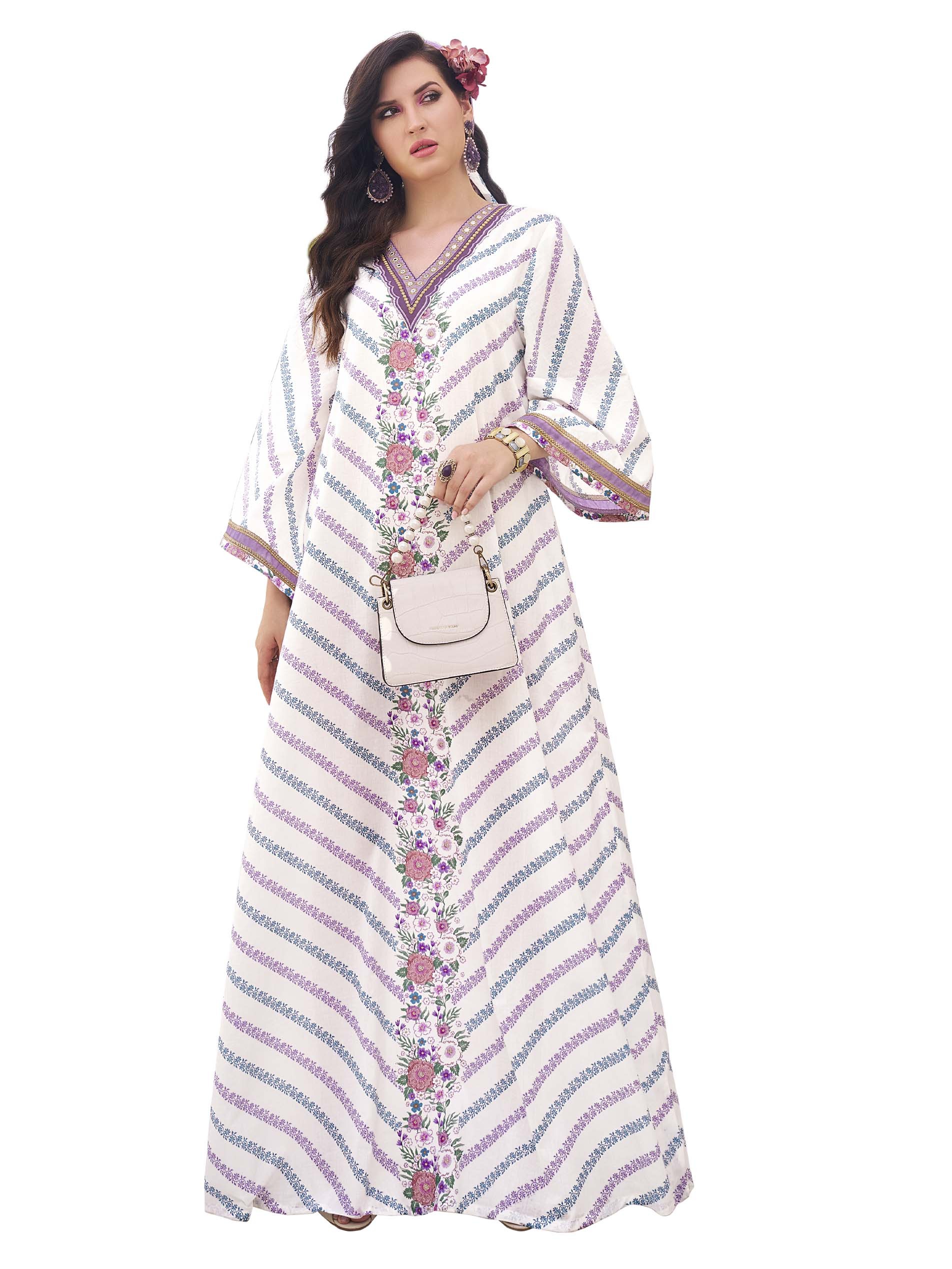 White cotton jalabiya designed with striped embroidery of colorful flowers on both sides. The design is completed with long wide sleeves and a floral print that extends through the length of the jalabiya, giving you a sense of elegance and distinction.