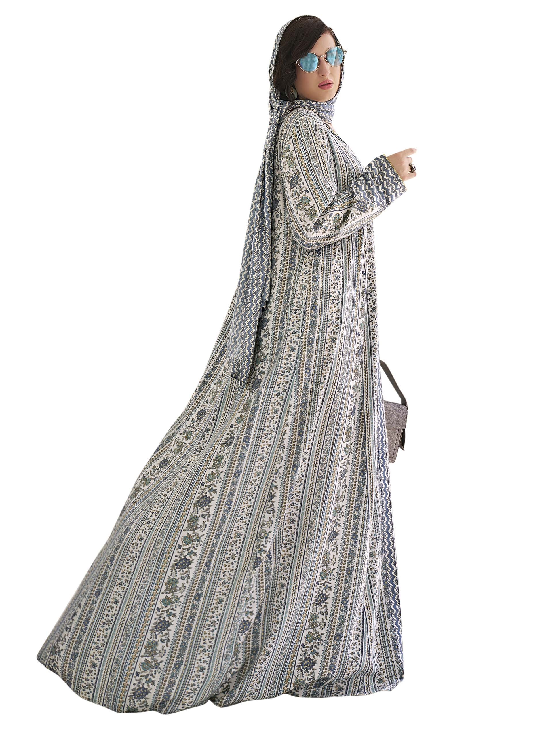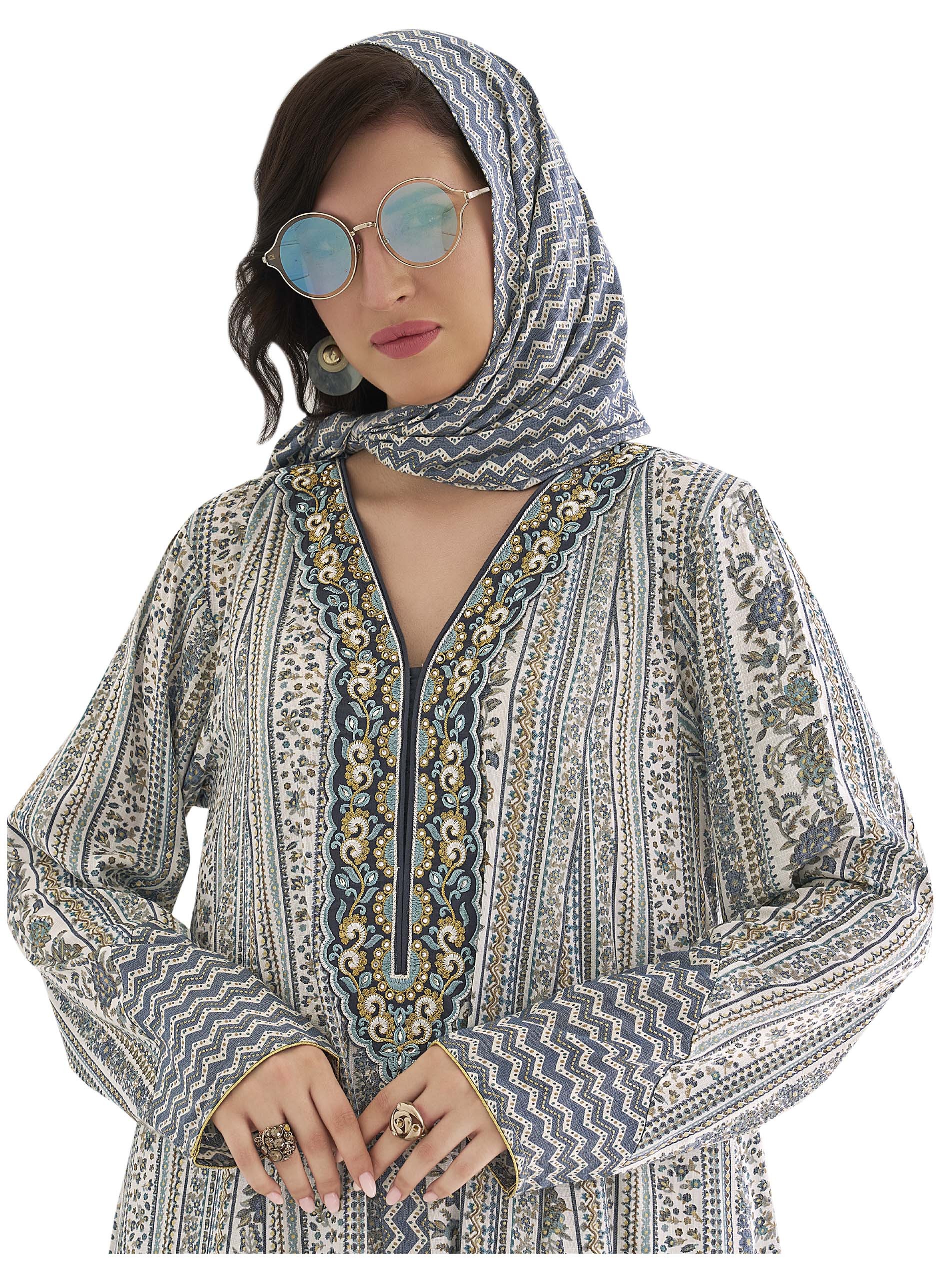 This jalabiya reflects your refined taste and attention to detail. It features a unique baby blue color and a unique design that combines wavy lines with flowers, creating a masterpiece. The design is completed with distinctive blue and gold embroidery on the chest.