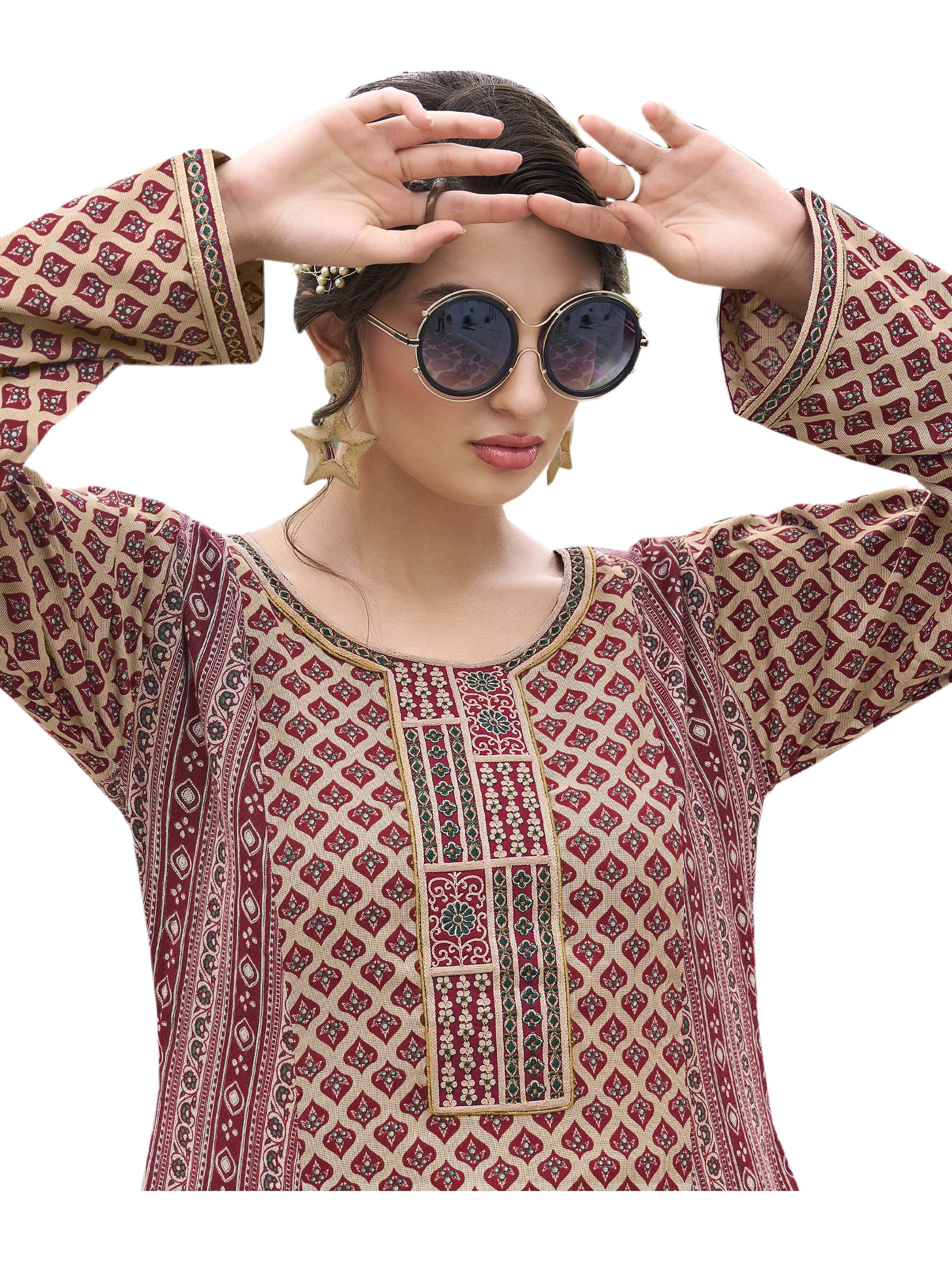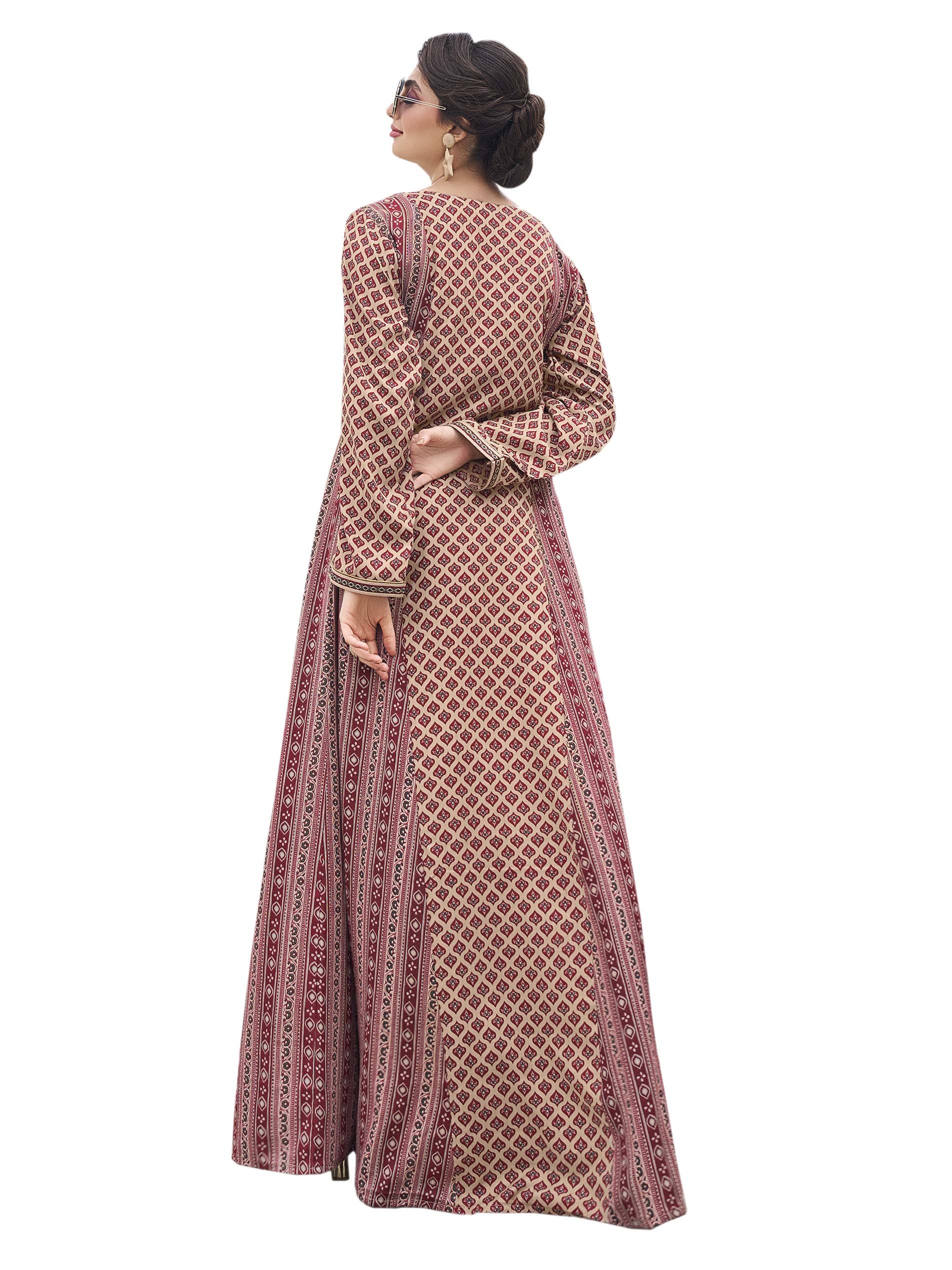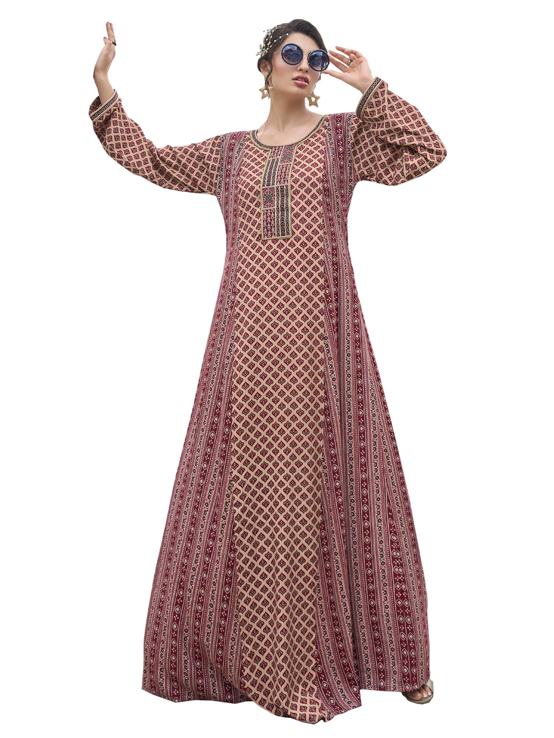 Long Sleeve maroon cotton jalabiya, designed with distinctive patterns, embroidery on the chest, and rounded neck.