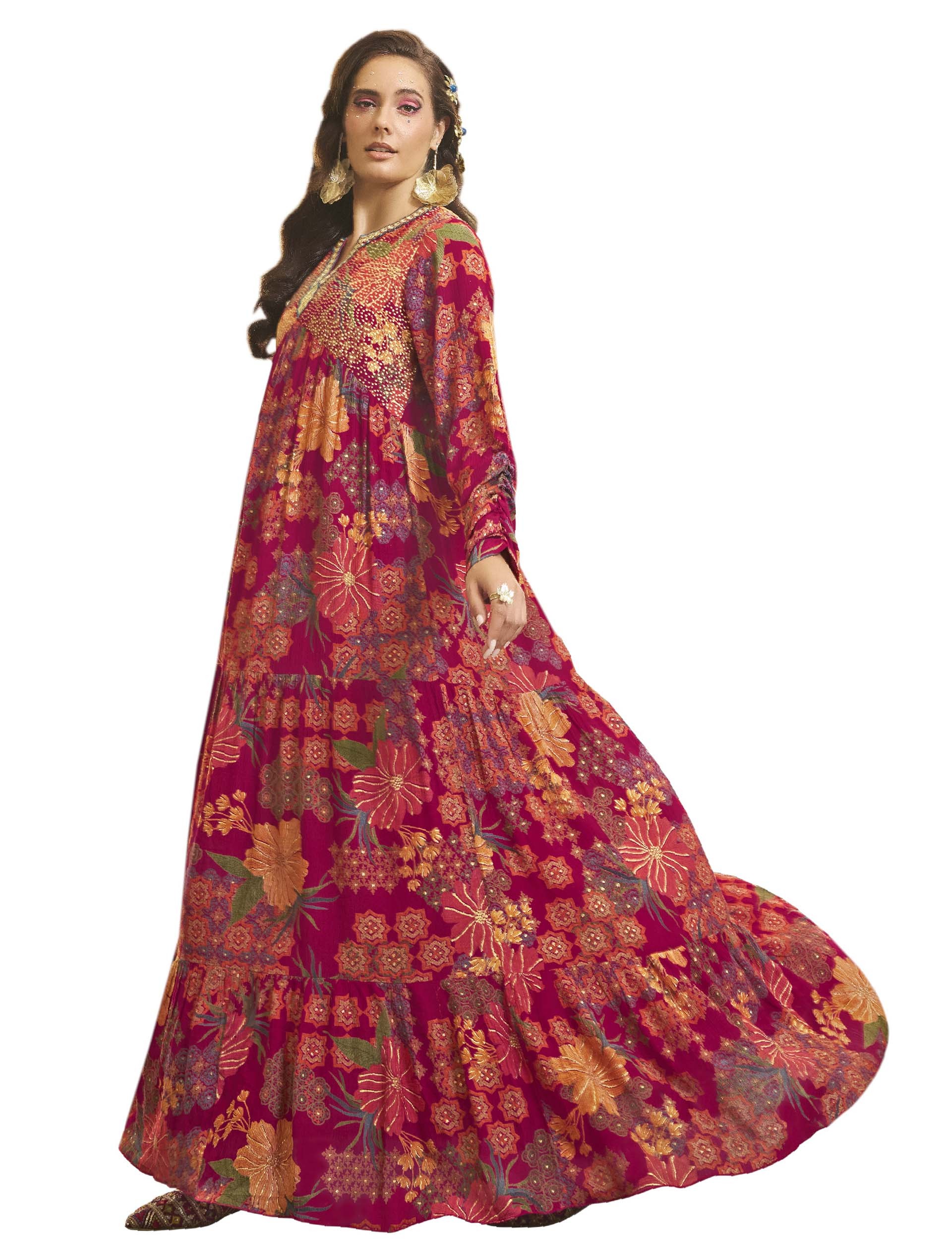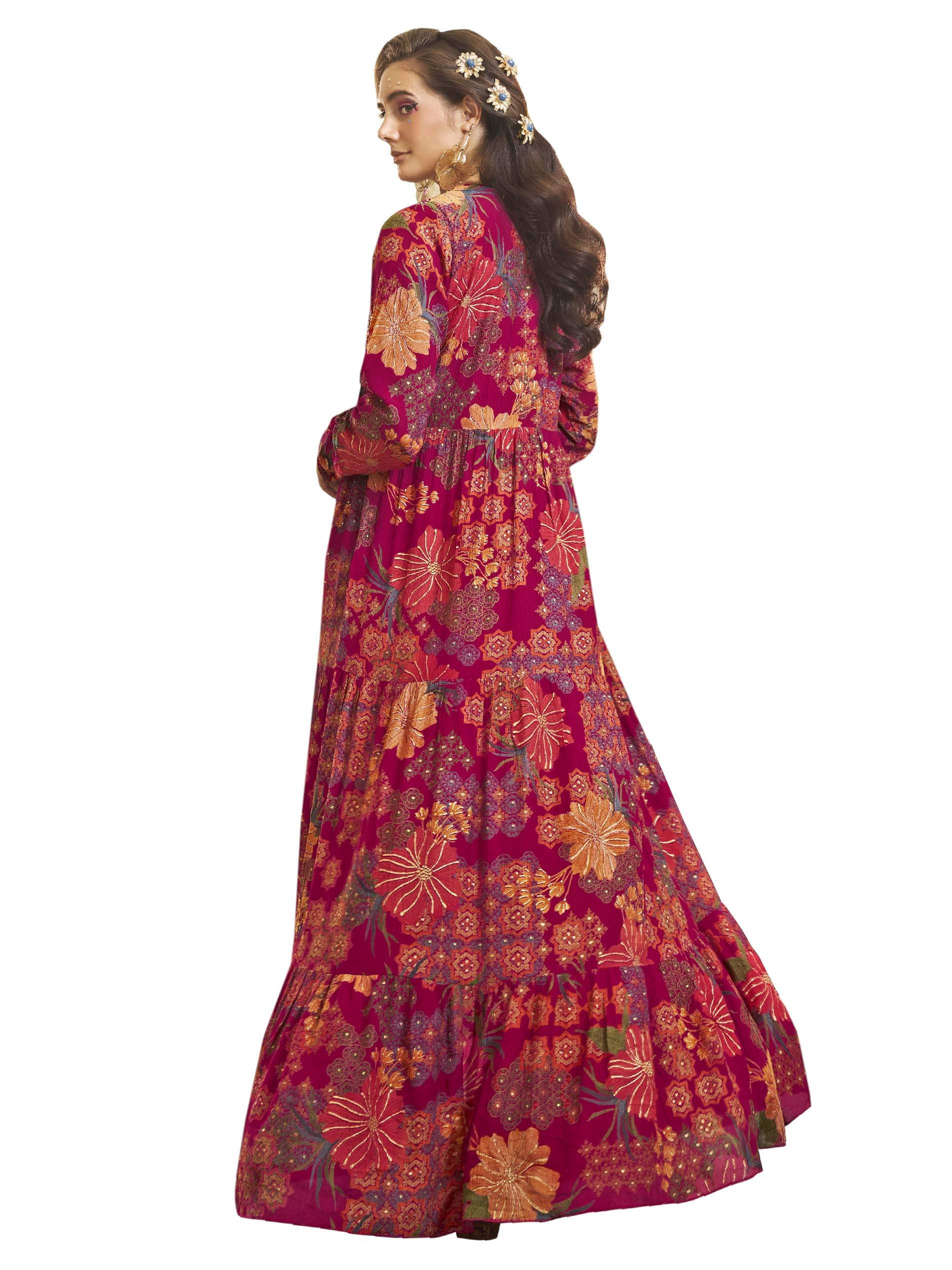 Long sleeve pink crepe jalabiya, designed with colorful floral pattern for a delightful ramadan look.
