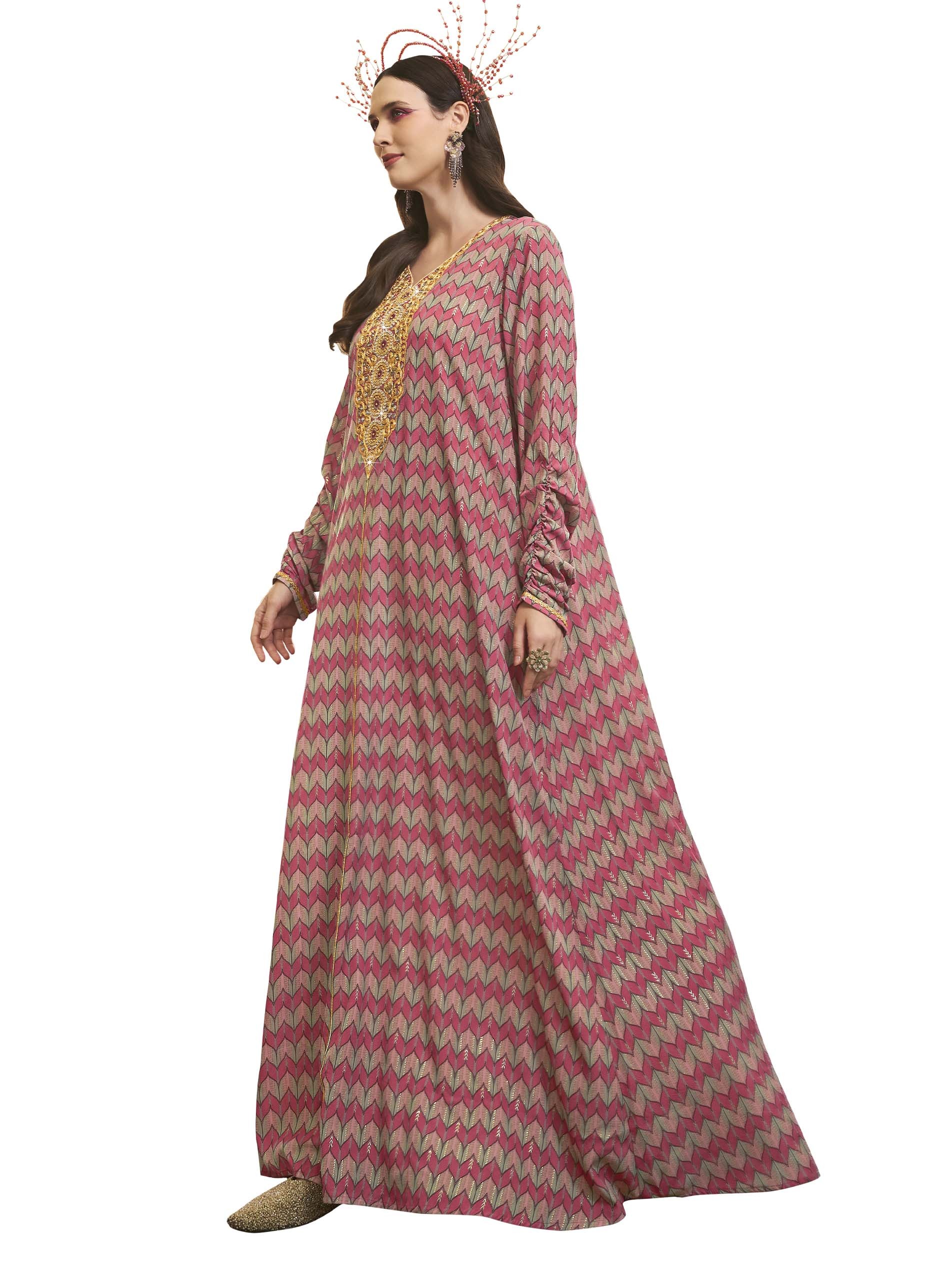 Long sleeve cotton jalabiya that comes with light and dark pink embroidery, complemented with luxurious gold artwork on the chest and sleeves.