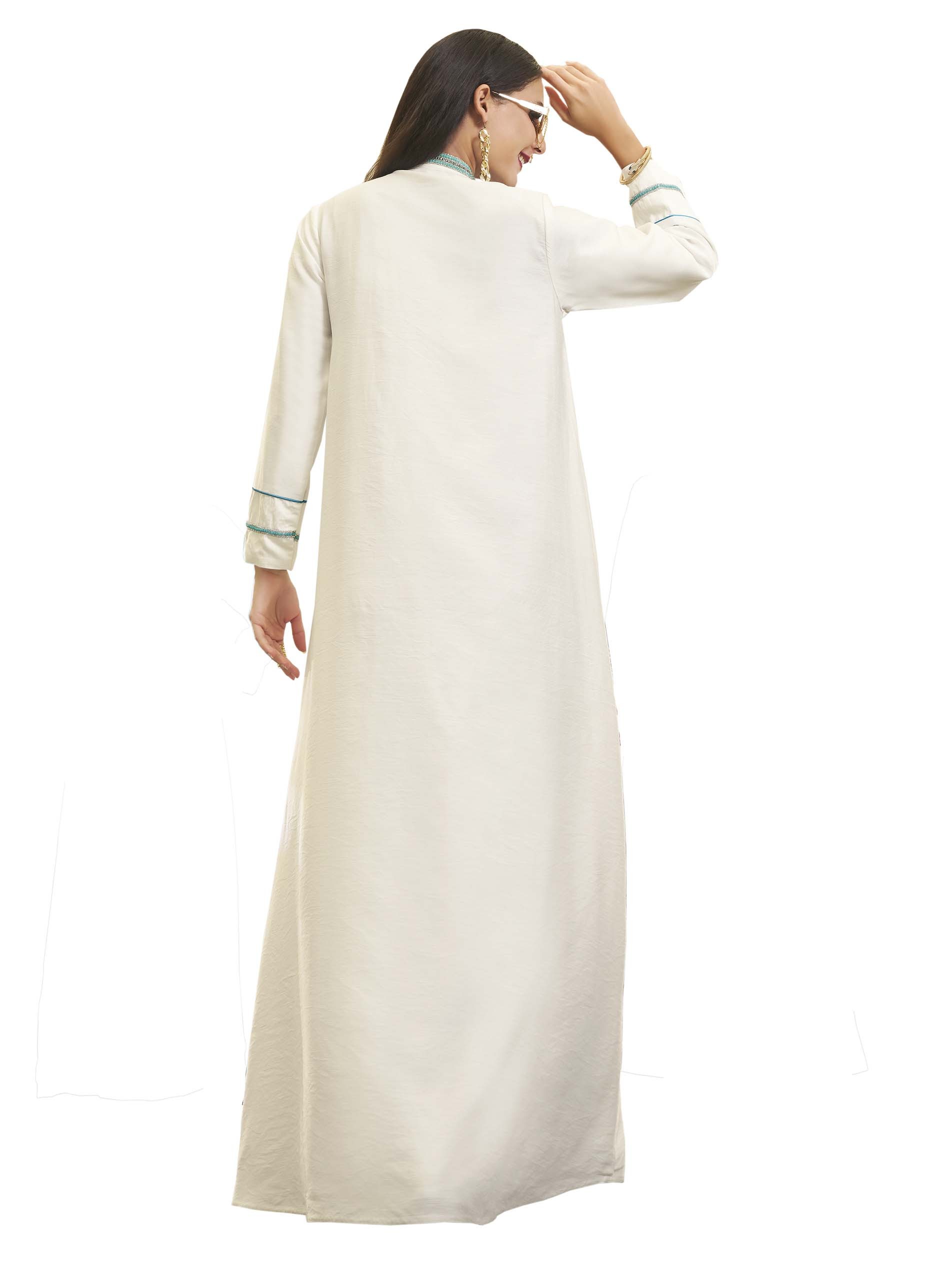White maxi jalabiya, interpersed with blue colour, featuring a design that combines softness with luxury, complemented with a spectacular floral chest design.